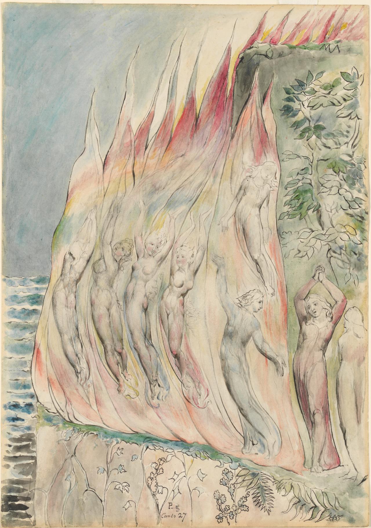 Blake was commissioned by John Linnell in 1824 to execute a series of illustrations to The Divine Comedy by Dante Alighieri. The series remained unfinished at the time of Blake’s death in August 1827; he left 102 sheets in varying stages of completion, ranging from finished watercolours to rough pencil sketches, as well as seven unfinished engravings. Dante’s epic poem narrates the story of his journey, guided by the Roman poet Virgil, through Hell and Purgatory, to Paradise, where he is reunited with his idealised love, Beatrice. The imaginative vision of Dante’s masterpiece clearly impressed Blake, in particular the description of Hell and its torments: to this he dedicated seventy-two of his illustrations, illustrating Purgatory with only twenty sheets and Paradise with ten. Although unfinished, this series is the crowning achievement of Blake’s career, his mature creative genius giving powerful visual form to Dante’s literary masterpiece.