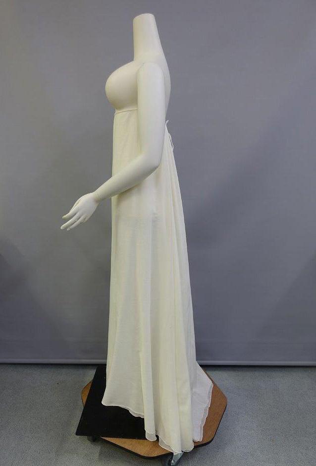 Underpinnings designed for this dress are light and sheer to highlight the embroidery and compliment the ethereal nature of both muslin fabric and silhouette. The tube petticoat is a structure created to simulate legs on torso-only mannequins, as without it even the lightest dress will cave inwards and appear lifeless. The delicacy of this tube is achieved using tulle and soft plastic boning, stitched in at the hemline. Two thicknesses of fine lawn create the petticoat, which is cut with the same construction as the original dress, straight at the front and deeply pleated at the back. This underpinning provides enough structure to support the dress and recreate the silhouette yet remains hidden when on display.