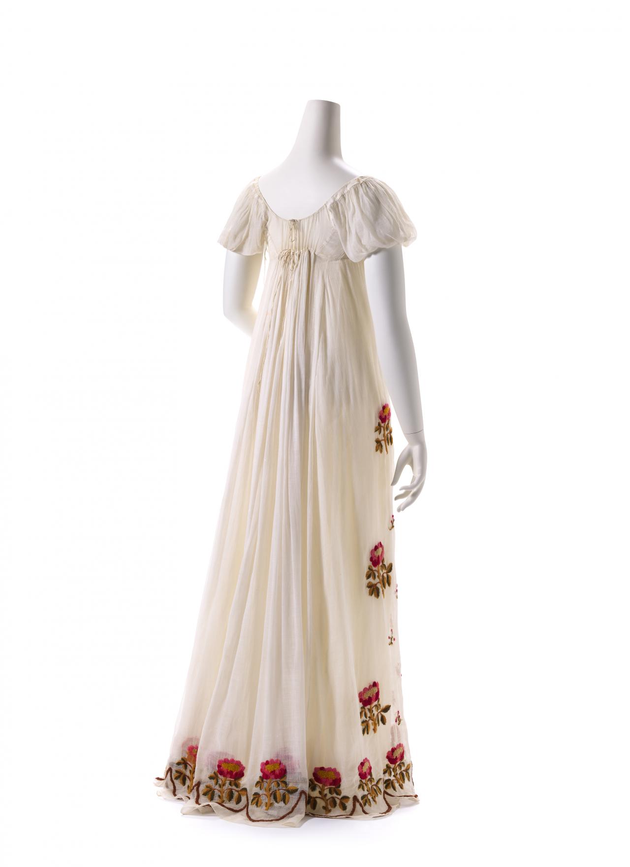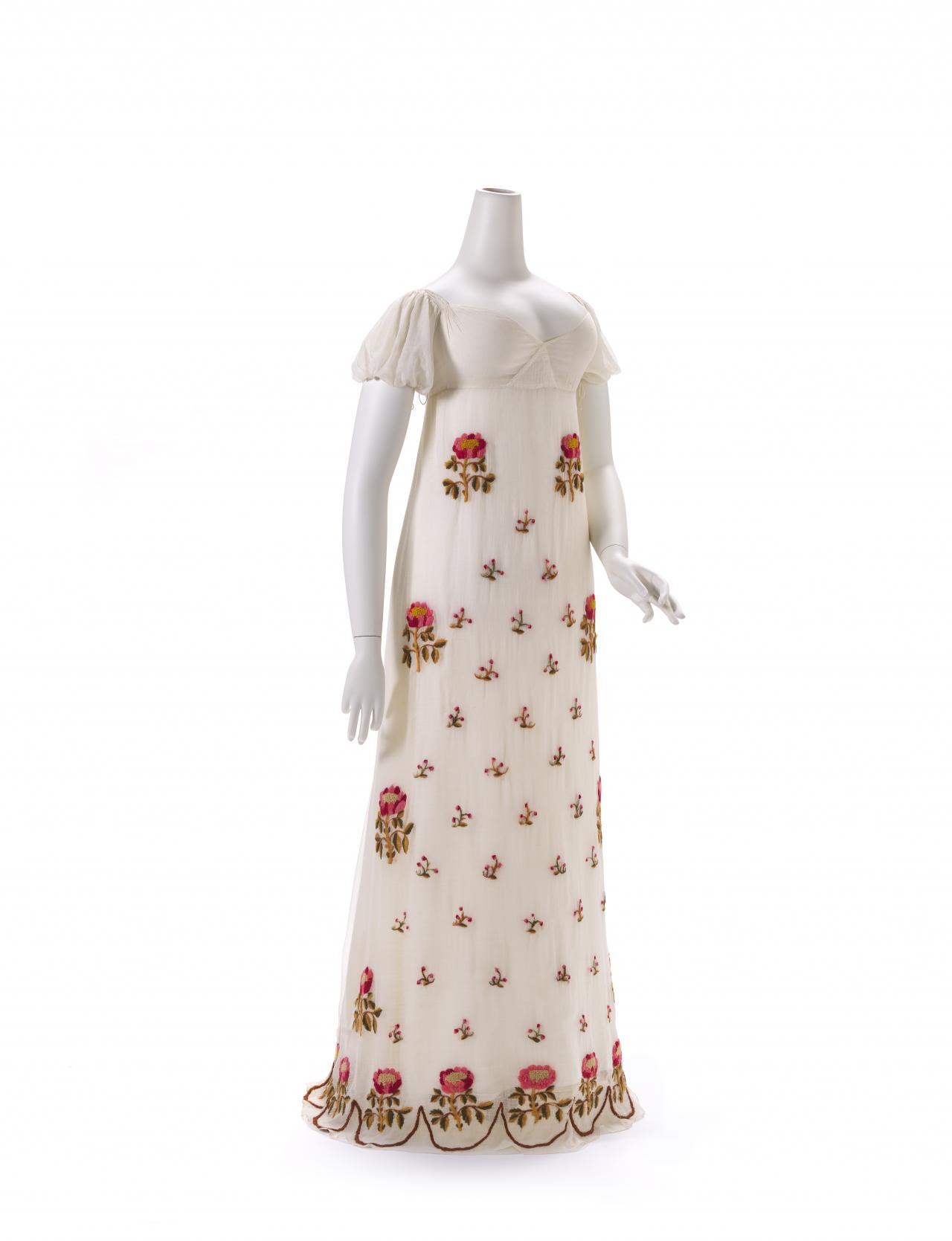 Handstitched in whisper-thin white muslin, this recent acquisition to the NGV epitomises the refined elegance of British Regency fashion. Characteristic of this era (c.1815), it is cut with a fitted high-waisted bodice and floor length skirt. Although simple to behold, this dress represents a radical and important shift in fashion history and was made during a turbulent time in European culture and society. This dress as a material object worn by a real person, gives direct insight into this era.