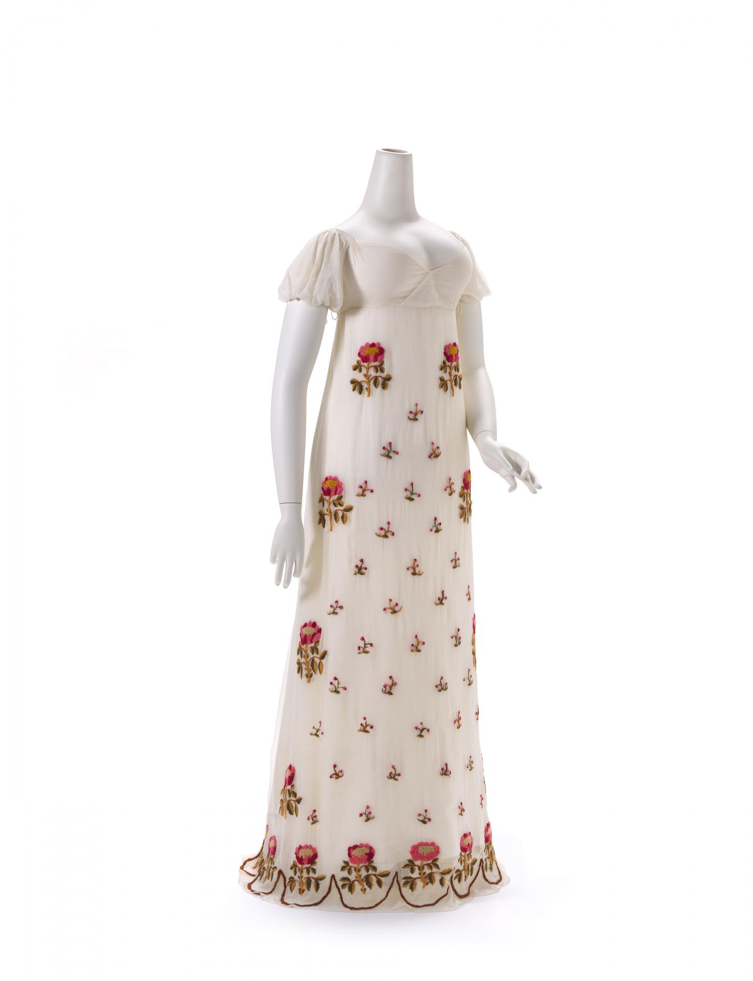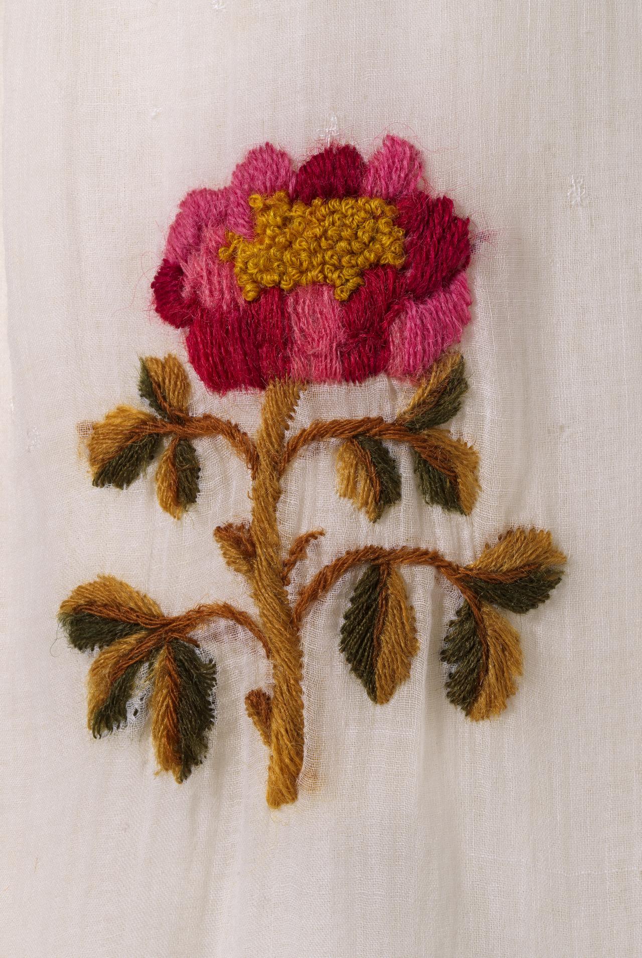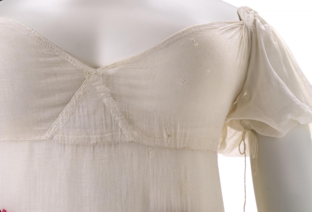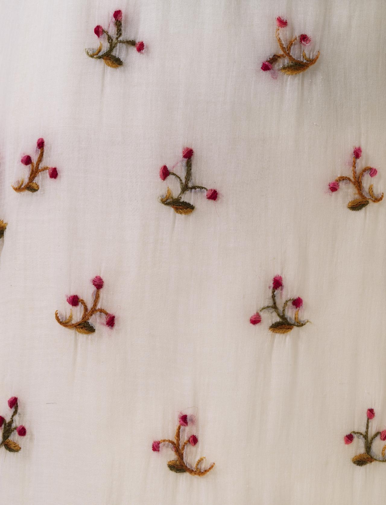 A distinguishing feature of this dress is the unique embroidery decorating the front skirt and entire hemline. By the 1810s, the simple white muslin dress was starting to be embellished with decoration, reflecting a move away from the Neo-classical to a more Romantic-influenced style. This dress demonstrates two differing techniques, which have been implemented to convey the theme of the embroidery: French knots in the centre of the flowers; and long and short stitches for the remaining embroidery. The vibrant embroidery has been undertaken with two differing wool threads. The original embroidery is stitched with a fine single-twisted yarn measuring about 0.5 millimetres wide. Perhaps because of its delicacy, some of this embroidery has broken and worn away with time. At some time in the dress’s history another thicker embroidery yarn was used to embellish the stitching and replace lost embroidery. This yarn is double the thickness of the first, as it is 2-ply construction and about 1 millimetre in width.