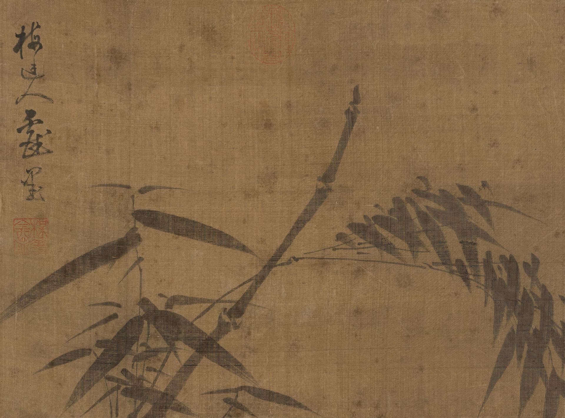 An intimate segment of nature, the painting is evocative of spring rain. The bamboo on the left is shooting with new leaves while another branch is windswept and drooping with rain. The animated brushstrokes create the feeling of a cluster of bamboo leaves dancing in the wind. The gaps of negative space between leaves and branches are stylistically unique to Wu Zhen’s bamboo paintings. The patina of the aged silk enhances the atmospheric effect. With swift brushstrokes, the artist also expresses his inner state of exhilaration.