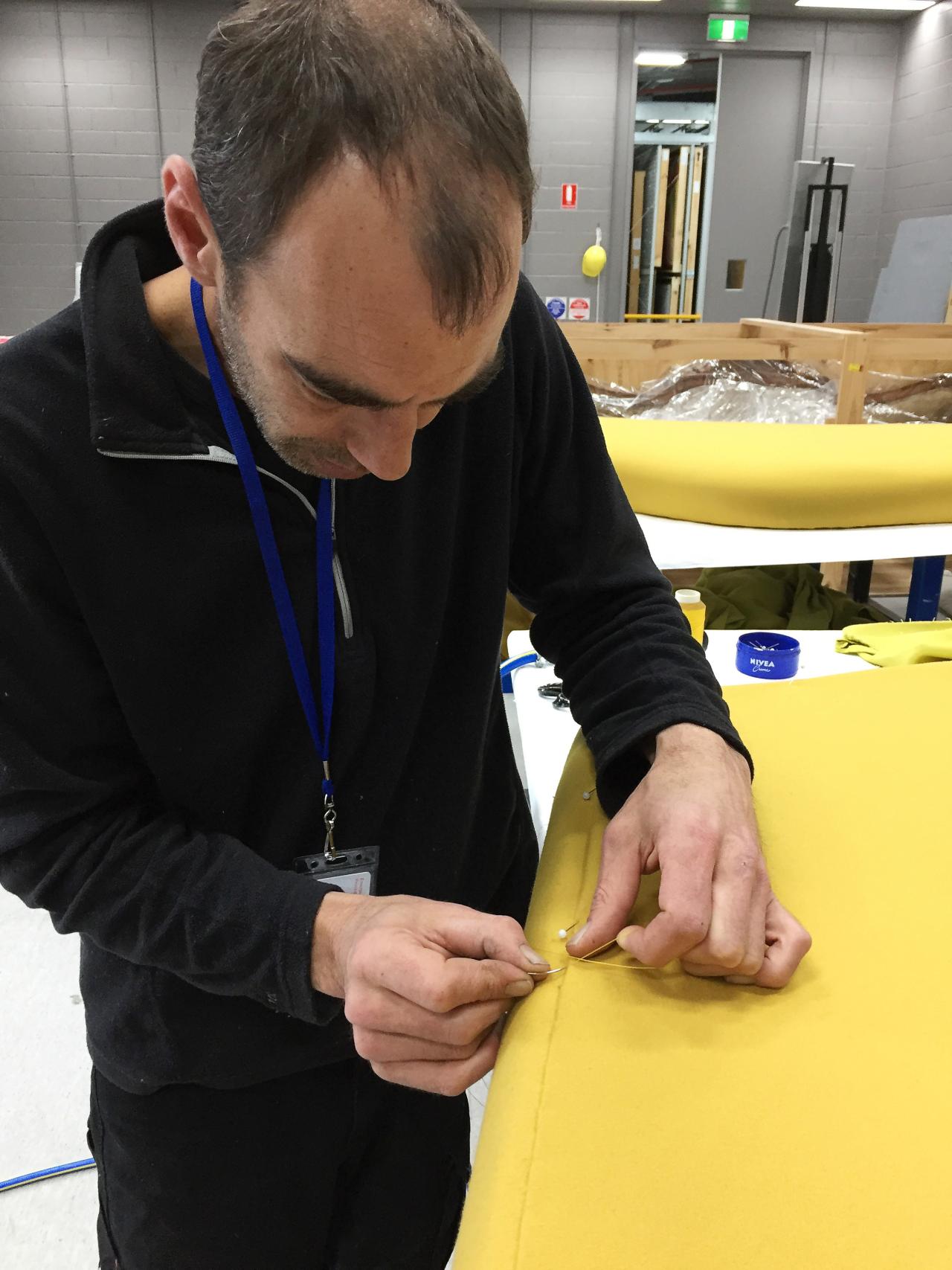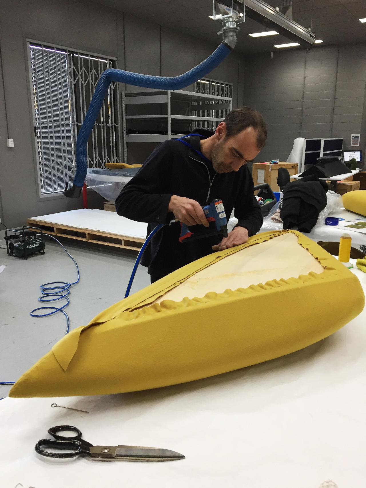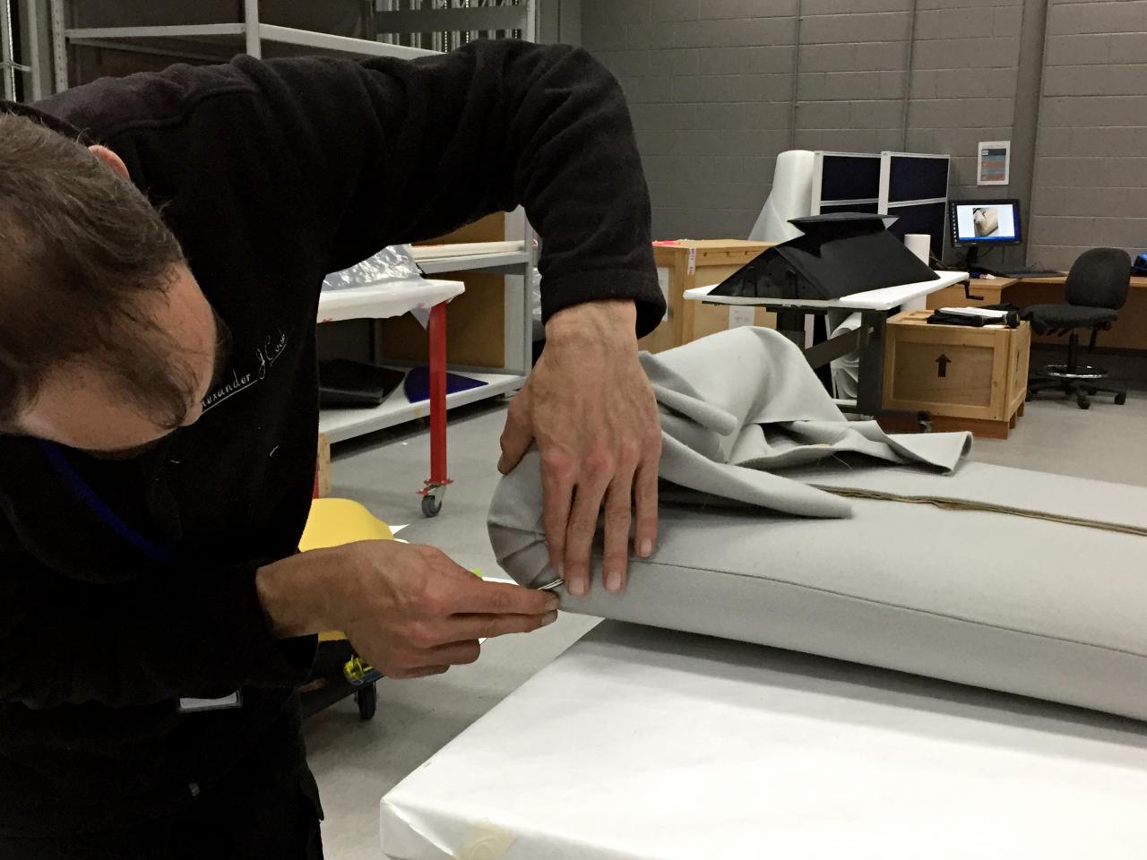 Keith Rogers of Alexander J. Cook worked with NGV Conservation department staff to reupholster the cushions, copying the original manufacturing methods of stapling, replicating the same fabric folds and tucks, and hand stitching the last seams.