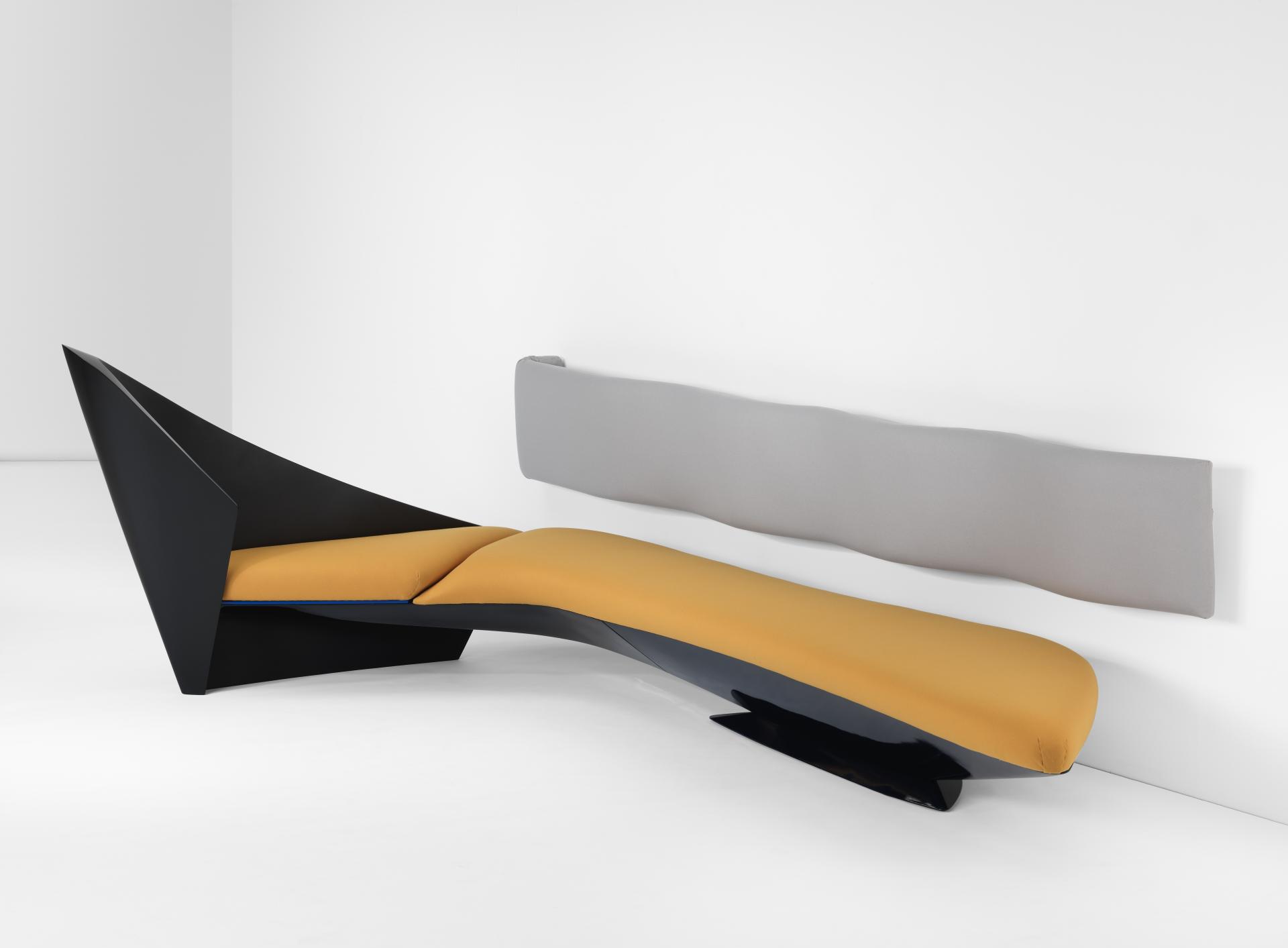 For the Bitar sofa commission, Hadid produced rough drawings, then, following a period of experimentation, constructed detailed models for the client’s approval. The result was a unique curvilinear sofa that floated and provided several perspective points, as well as multiple uses. Two moulded fibreglass frames create a boomerang-like shape, supported on a tapered foot and coated in black futuristic-looking gloss lacquer. On top of this sits a long, narrow cushion upholstered in a distinct yellow wool, with a removable triangular cushion around the curve. This connects to a matte black painted curve jutting out at right angles to create a private nook. Describing the work in 1987, Hadid said, ‘the sofa is not just a sofa, but also acts as a partition or shield. The [smaller] seat is not only a seat; it could also be a tray’. The sofa’s namesake derives from the back cushion, which is separately attached to the wall behind – a long, rectangular, grey wool- upholstered framework with unevenly positioned undulations.