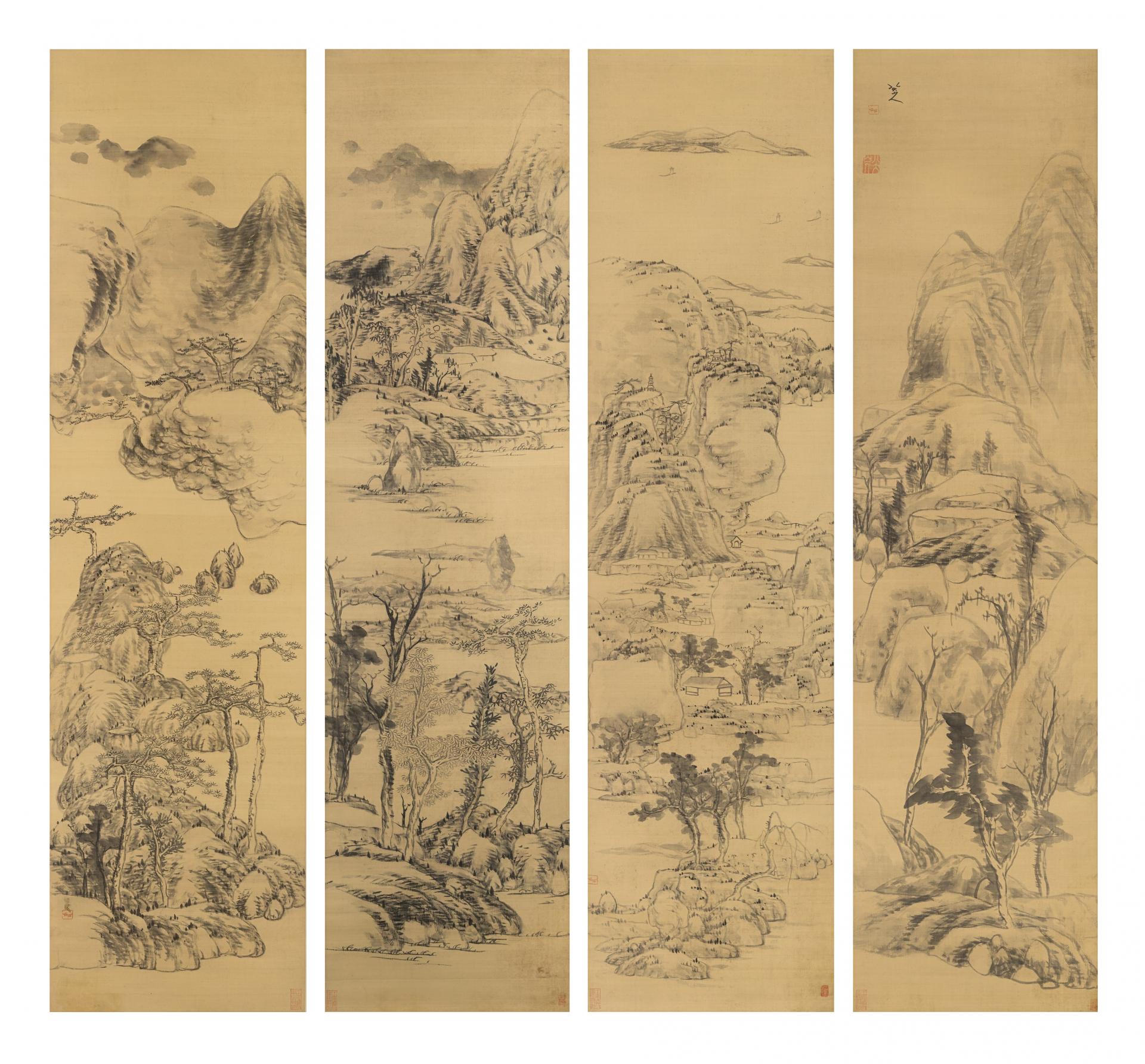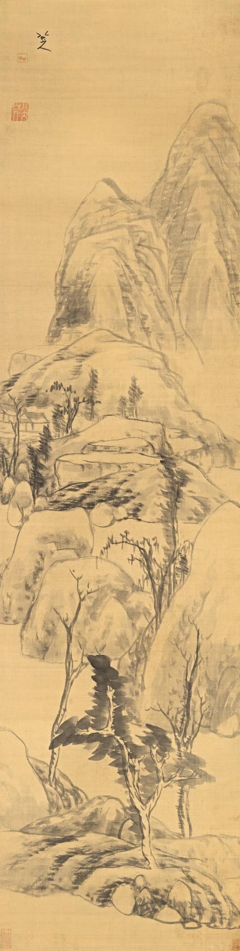 Zhu Da’s four landscapes, in the collection of the National Gallery of Victoria (figs 5a–d )40 This group of four ink on satin hanging scrolls was purchased in 1983 with funds from the Goldenberg Bequest and The Art Foundation of Victoria. Illustrated in Zhou Shixin, p. 101, figs 97–8 and p. 181, figs 145-6; Vito Giacalone, Chu Ta, A Selection of Paintings and Calligraphy, New York Cultural Center, New York, 1973, catalogue nos 3A, B, C, D; id., (Oriental Art, 1975), p. 139, fig. 3. On Zhu Da’s painting and calligraphy, see references in footnote 1. painted c. 1685–94, are compelling images of the mind. Zhu Da, like other intellectuals, responded to political upheaval and disintegration by retreating into himself so that ‘the universe is my mind; my mind is the universe’, as stated by Lu Xiangshan (1139–93), founder of the Neo-Confucian School of Mind which flourished in the 16th century.41 The mind is the ultimate reality and the universe exists only in the mind.
