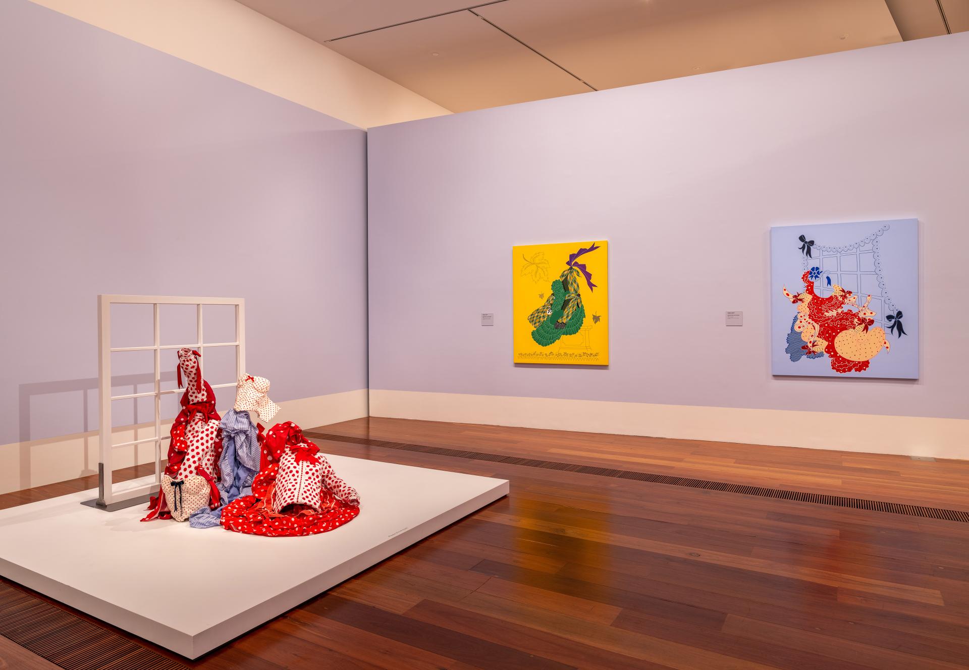 Re-imagining these scenes, Hughes is drawn to the way in which Erté uses dress and couture to extend and abstract the female figure. Hughes’s paintings depict the dresses full of frills, pleats and bows, operating as stand in portraits of Ermyntrude and Esmeralda to free them from recognisable bodies.