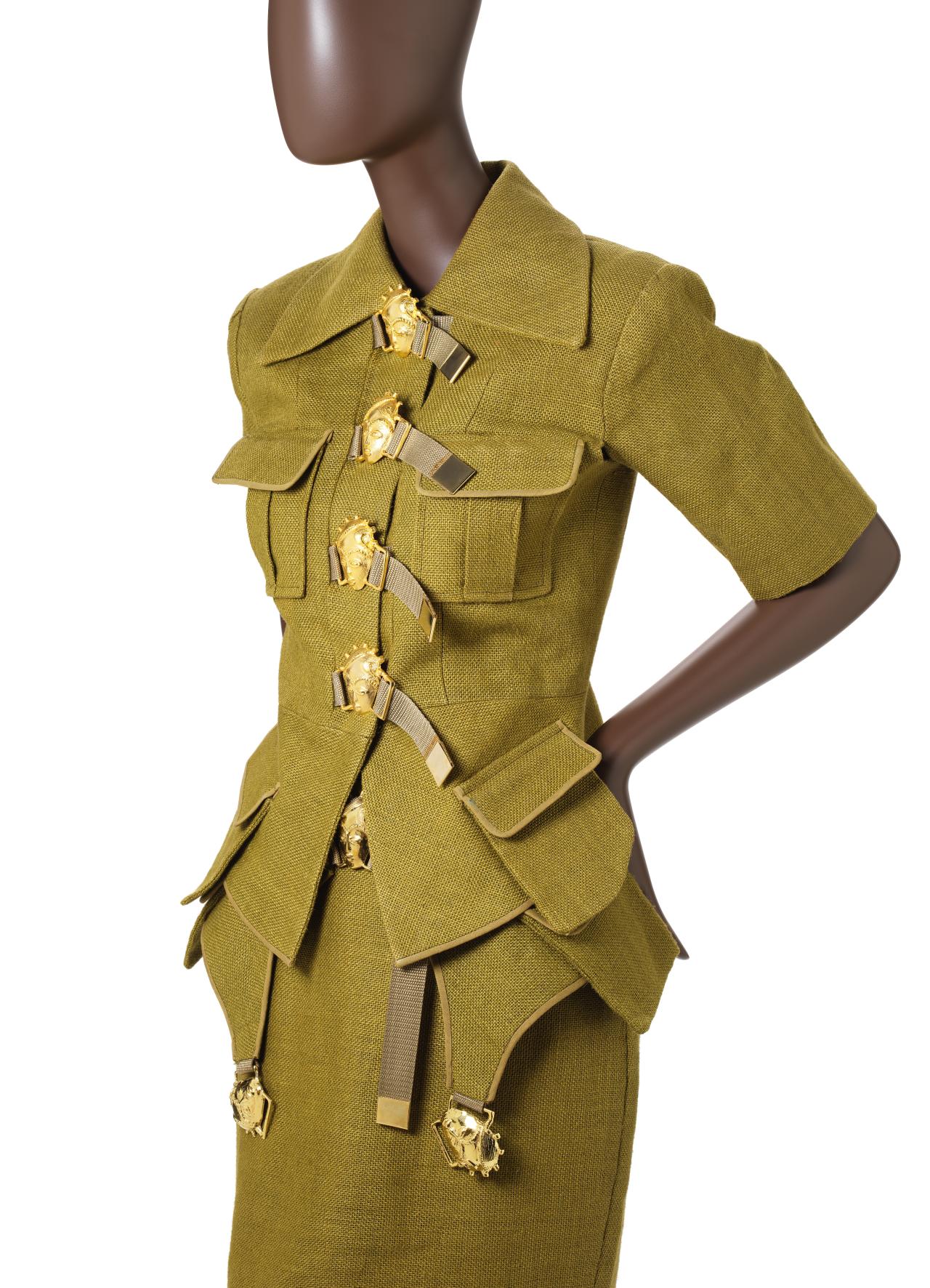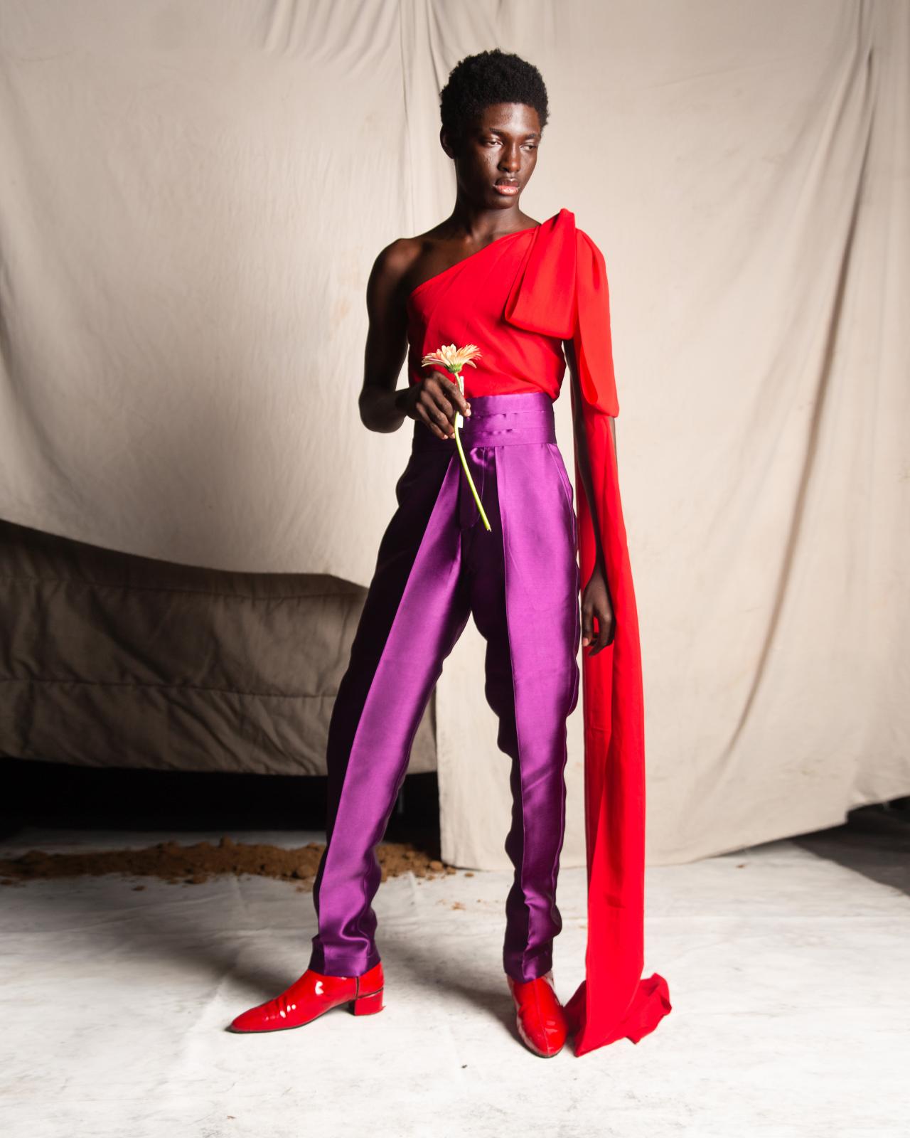 “This collection holds profound personal significance for me, as it is the first collection I created after giving birth to my son in 2020. The arrival of my son not only brought immense joy, but also sparked a new consciousness in my life. This collection represents more than just a series of garments; it embodies a spiritual awakening and a journey of empowerment. The structured, powerful and graphic silhouettes featured in pieces like the Jao jacket, skirt and belt serve as visual representations of this new-found strength and resolve.”