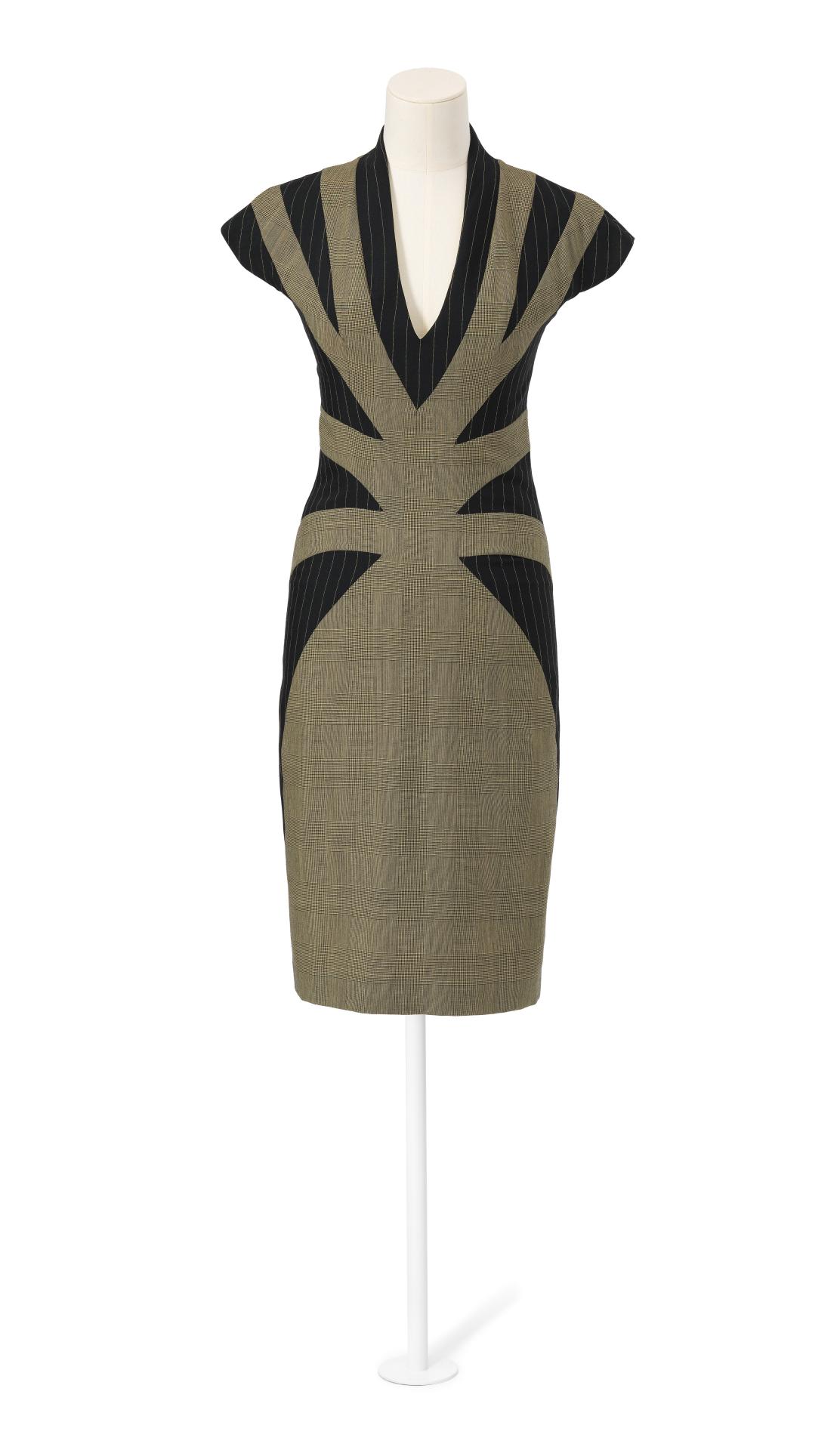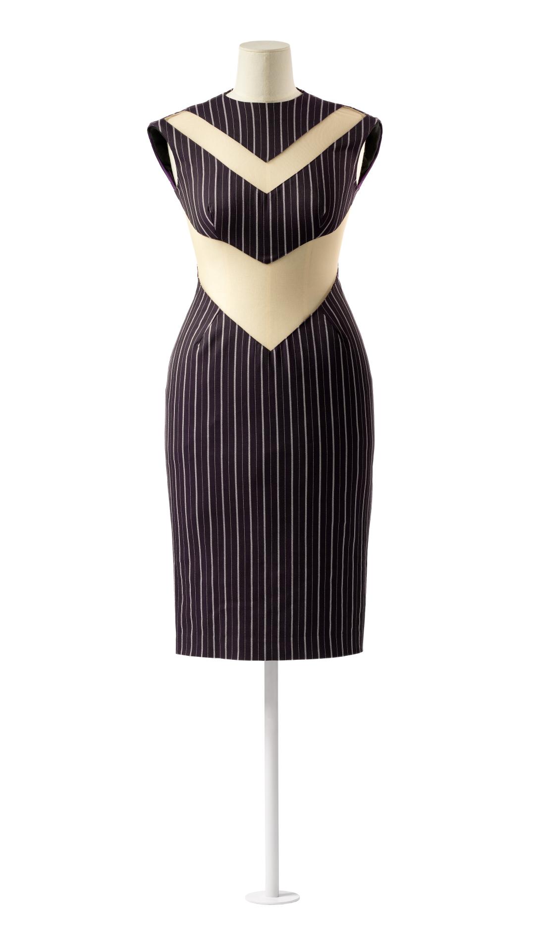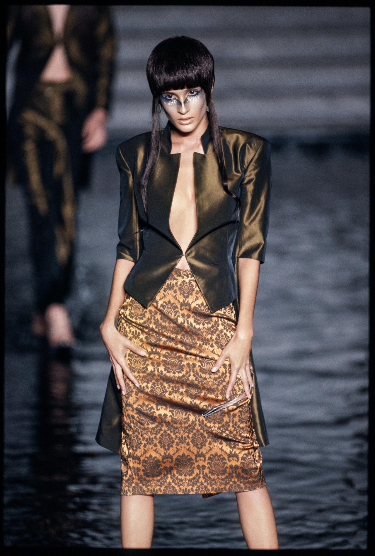 McQueen’s Eye collection was inspired by Turkish music he first heard in a taxi, and by the greater Islamic community in London. The collection clashes body-conscious Western fashion with McQueen’s interpretations of Middle Eastern clothing, citing cultural and religious dress practices, as well as belly dancing costumes and contemporary soccer uniforms. These references can all be traced to lands once encompassed by the Ottoman Empire, as well as modern-day Turkey and the Persian Gulf.