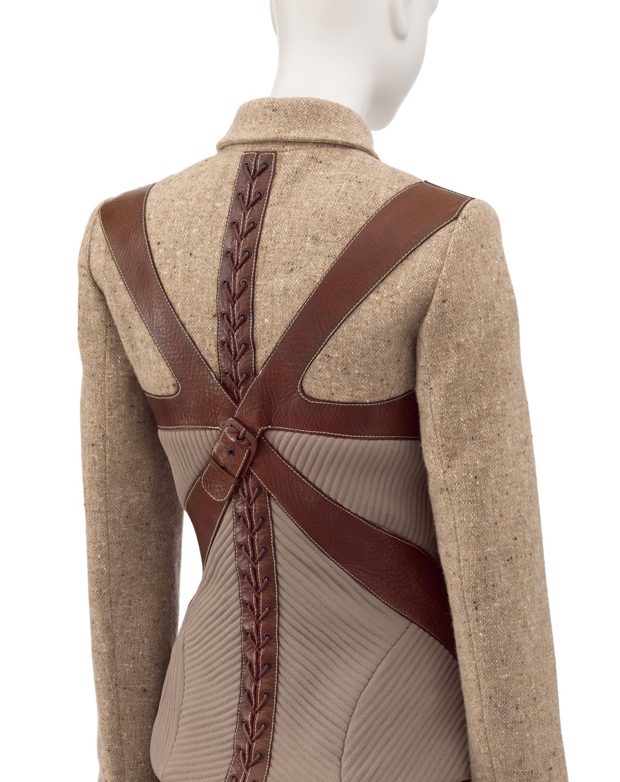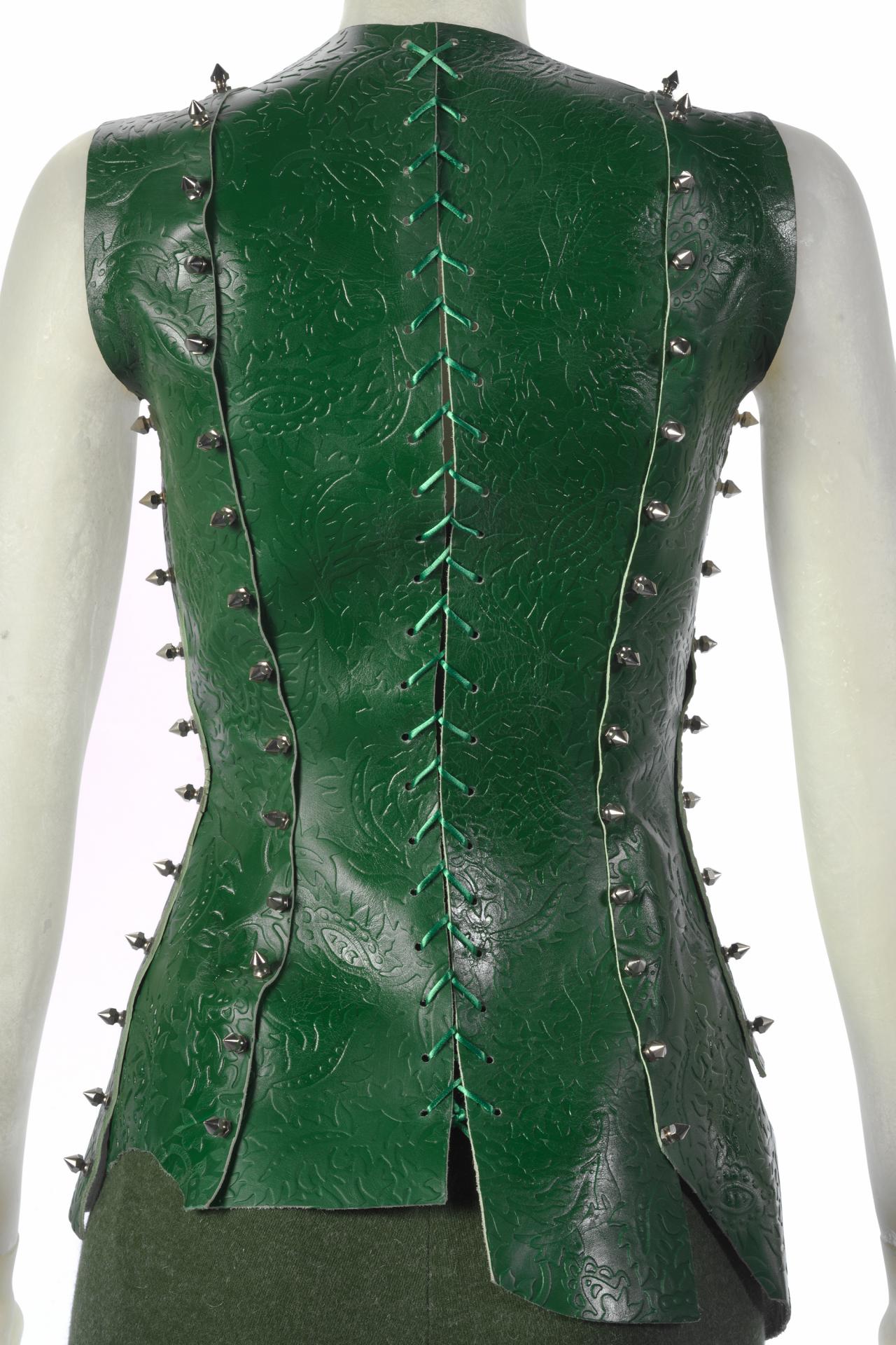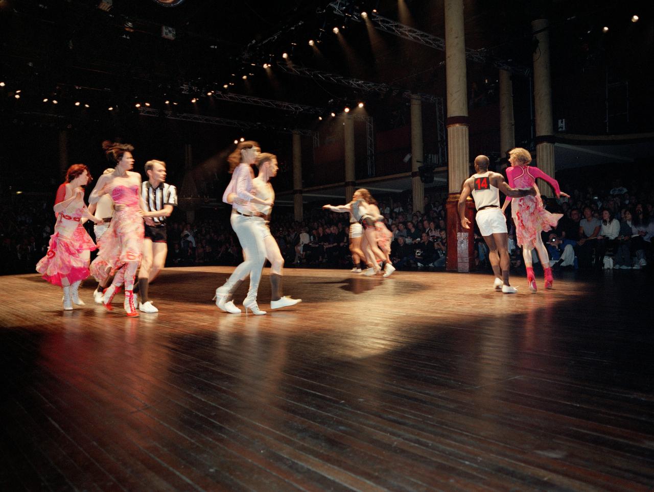 McQueen’s Eye collection was inspired by Turkish music he first heard in a taxi, and by the greater Islamic community in London. The collection clashes body-conscious Western fashion with McQueen’s interpretations of Middle Eastern clothing, citing cultural and religious dress practices, as well as belly dancing costumes and contemporary soccer uniforms. These references can all be traced to lands once encompassed by the Ottoman Empire, as well as modern-day Turkey and the Persian Gulf.
