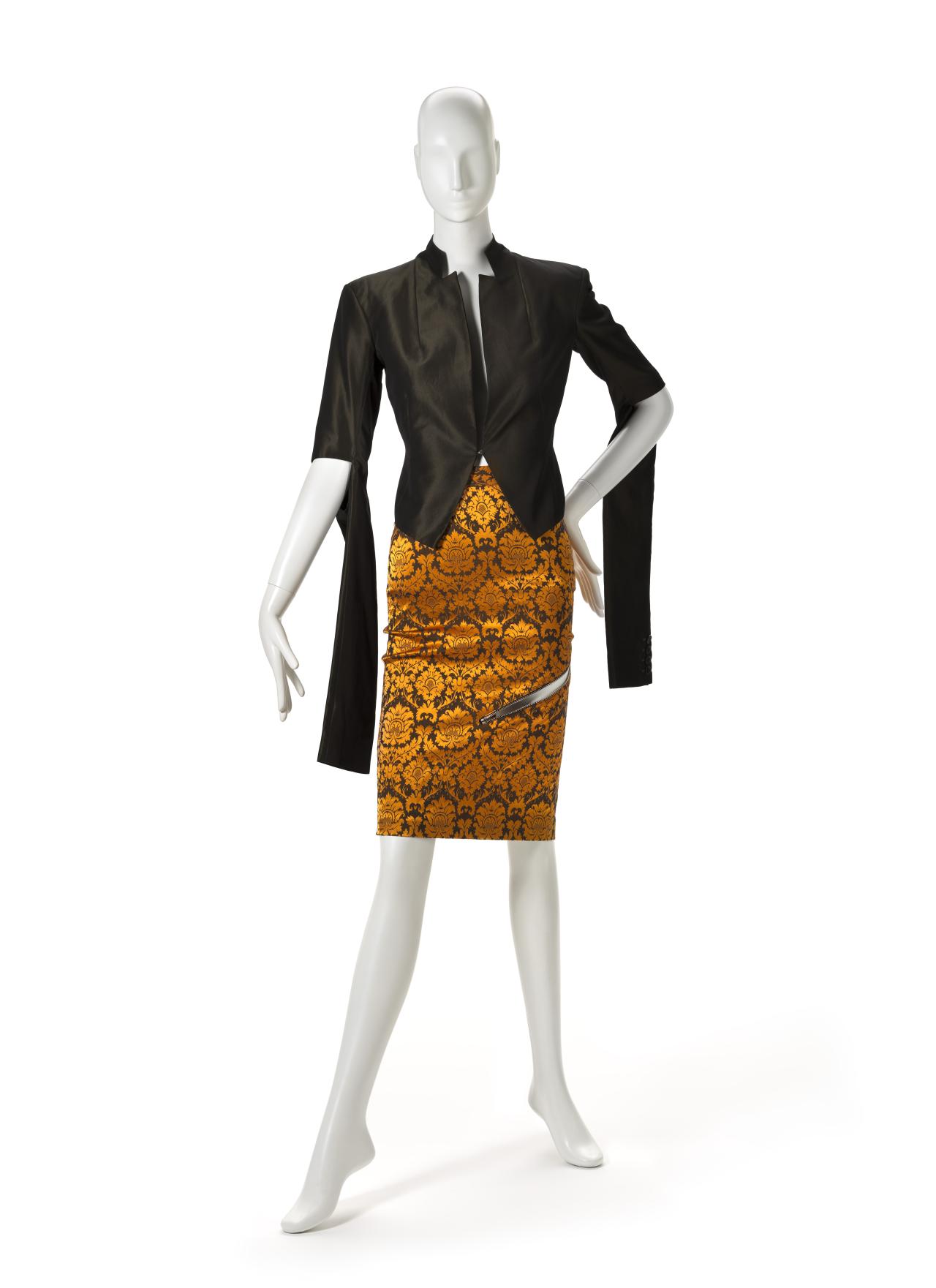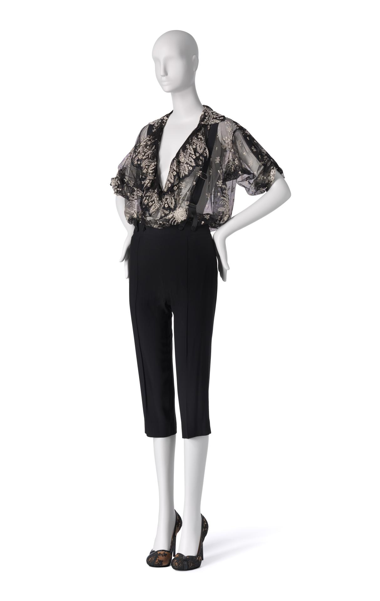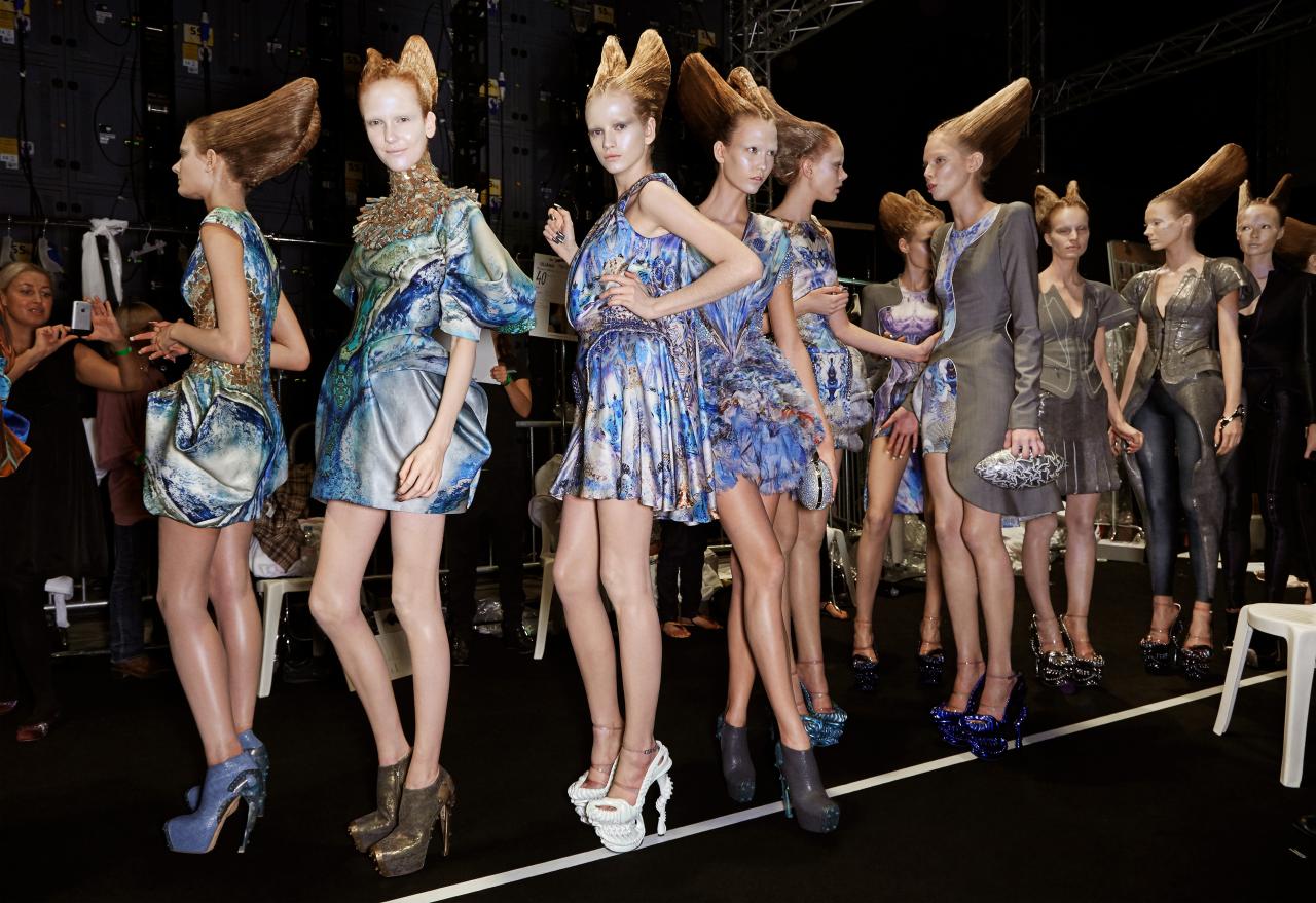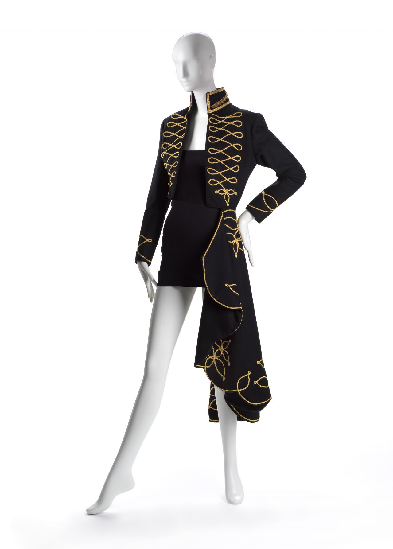 The untitled collection, autumn–winter 2010–11, posthumously called Angels and Demons, references Christian iconography from the Byzantine Empire as well as the northern and Italian Renaissance. Through the collection, the existential dualities of heaven and hell, sin and redemption, and damnation and salvation are explored. Neptune, McQueen’s spring–summer 2006 collection, looks to ancient Greece and Rome to recast contemporary women as powerful and empowered warriors or goddesses, while Eye, spring–summer 2000, combines Western fashion with interpretations of dress and textiles traditionally associated with the Ottoman Empire (late thirteenth century to 1923).