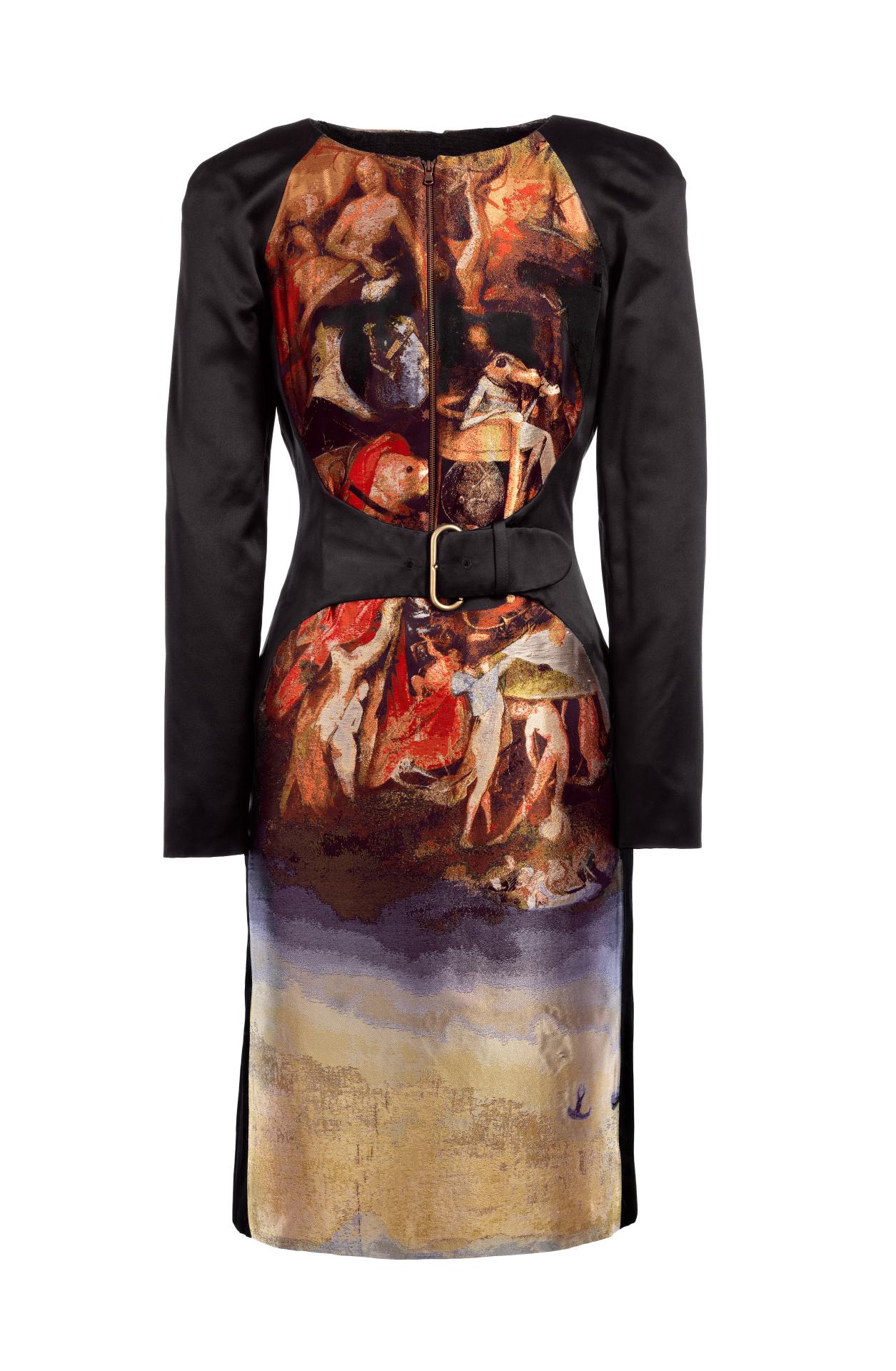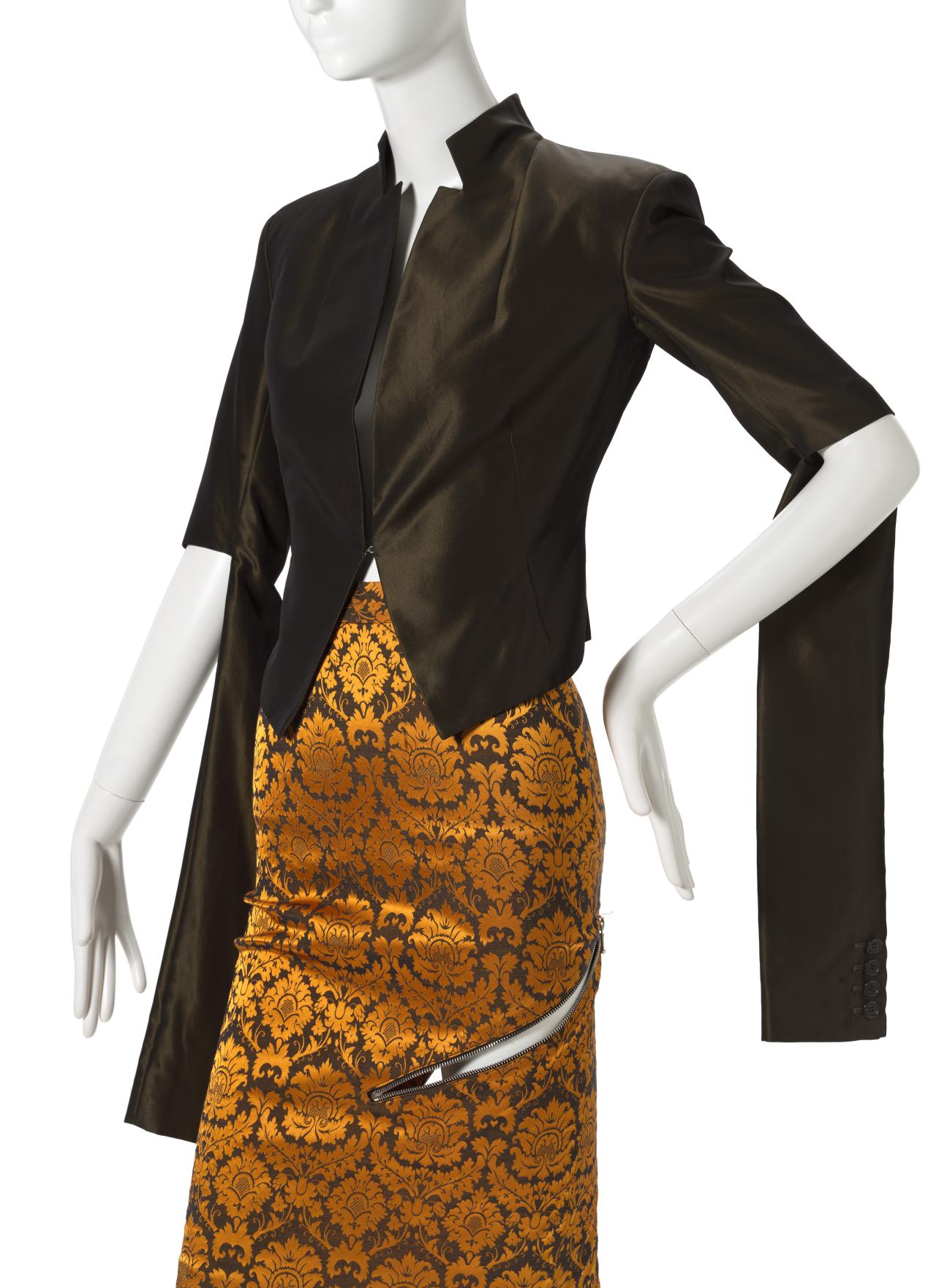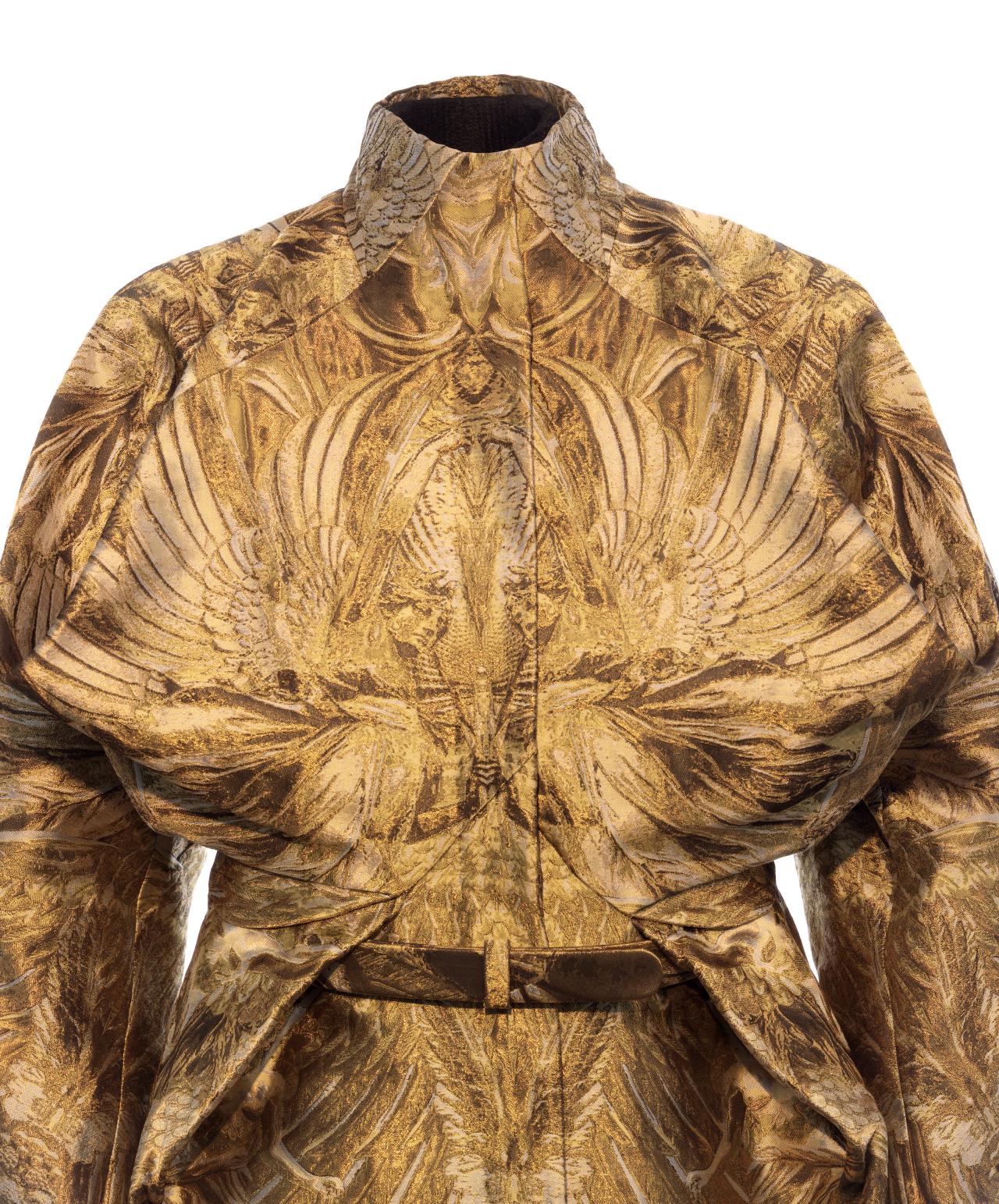 With Angels and Demons, McQueen looked to the past ‘to find light and beauty’. Three-dimensional gilt embroideries and inventive Jacquard textiles borrow from Italian and northern Renaissance art, as well as Classical sculpture.