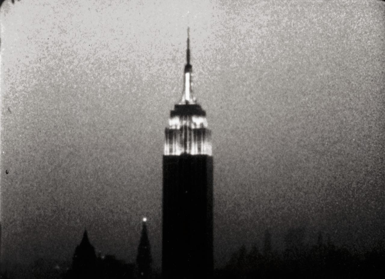 Warhol’s silent, black-and-white film Empire, 1964, focuses on the Empire State Building, a sign of twentieth-century modernity and one of New York City’s most iconic buildings. Empire draws upon experimental techniques aligned with underground cinema of the 1960s. Beginning at sunset and lasting eight hours, the film is composed of a single take which merges space and time, its extreme duration echoing the physical height and prominence of the building in New York’s urban imagination. In the city that never sleeps, the building seems a beacon distanced from the bustle of the streets below.