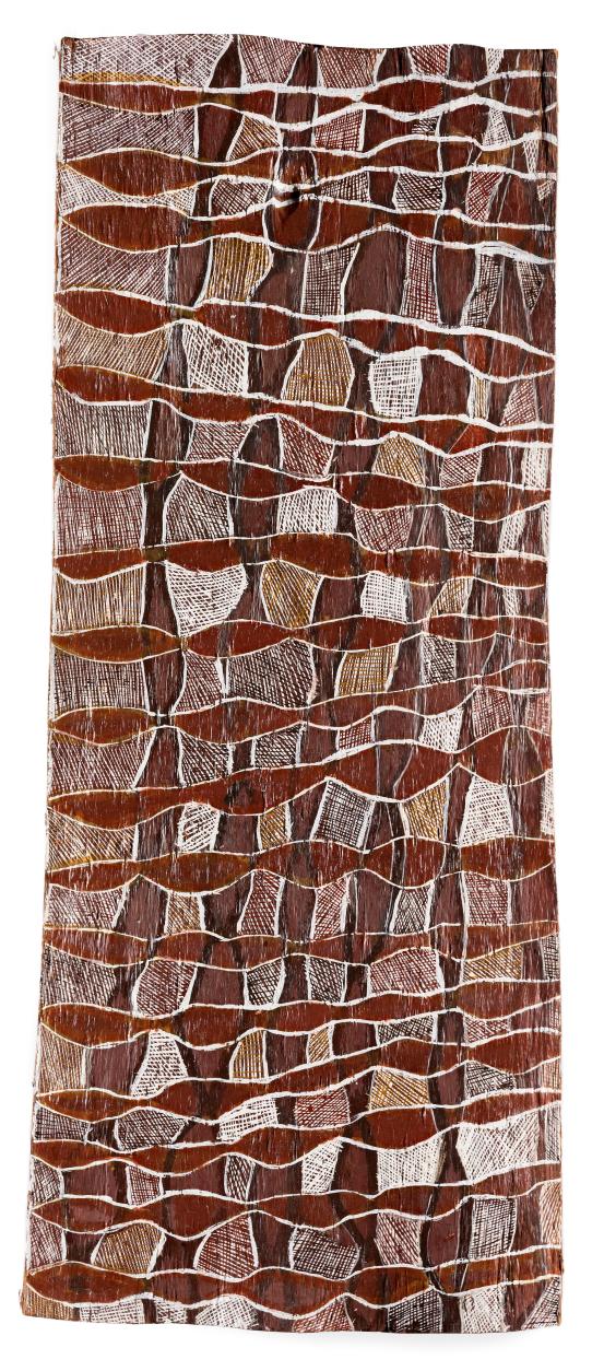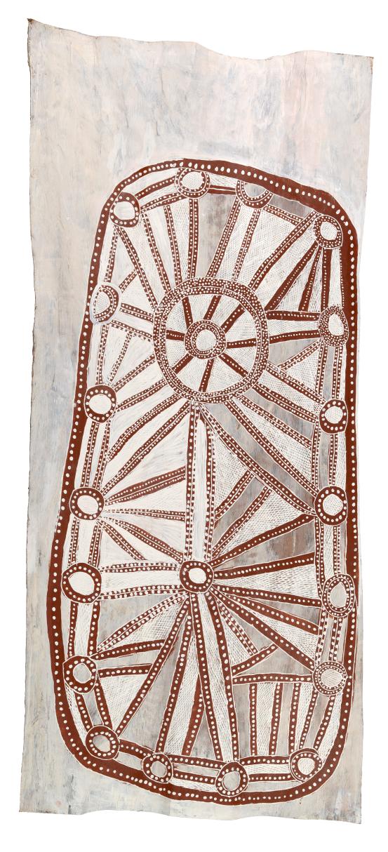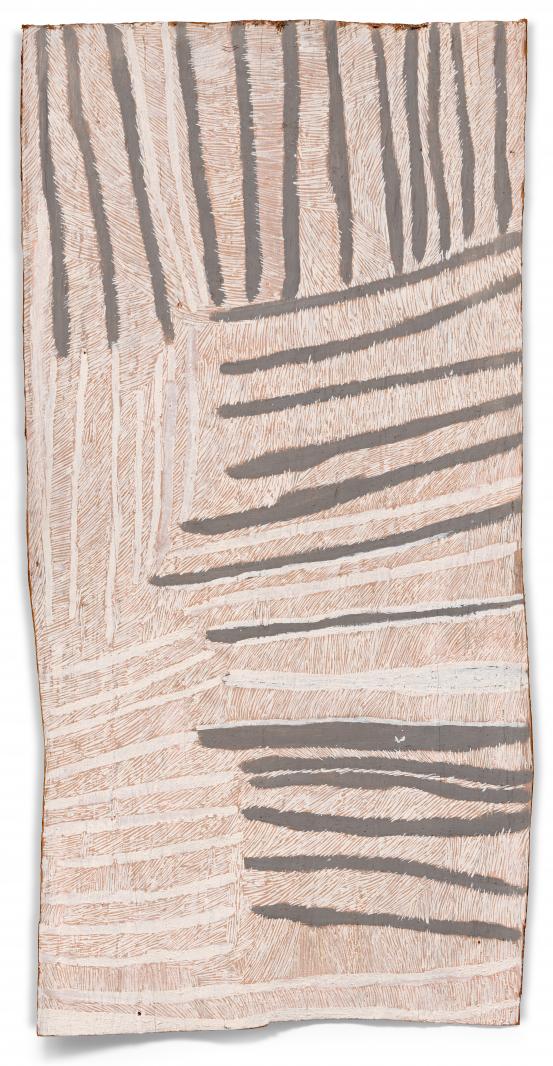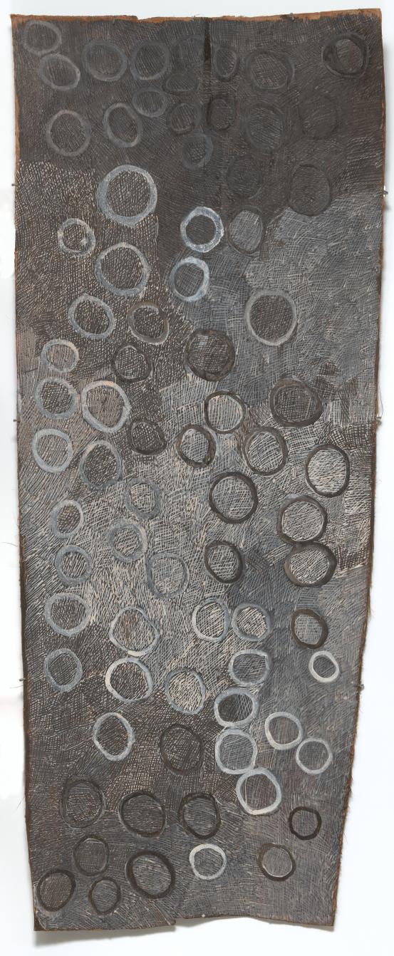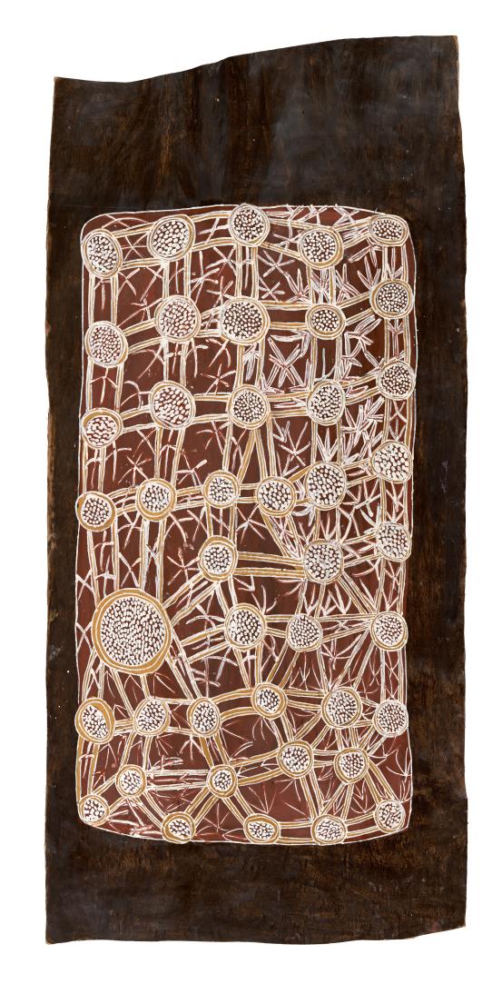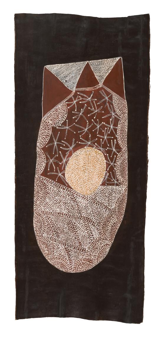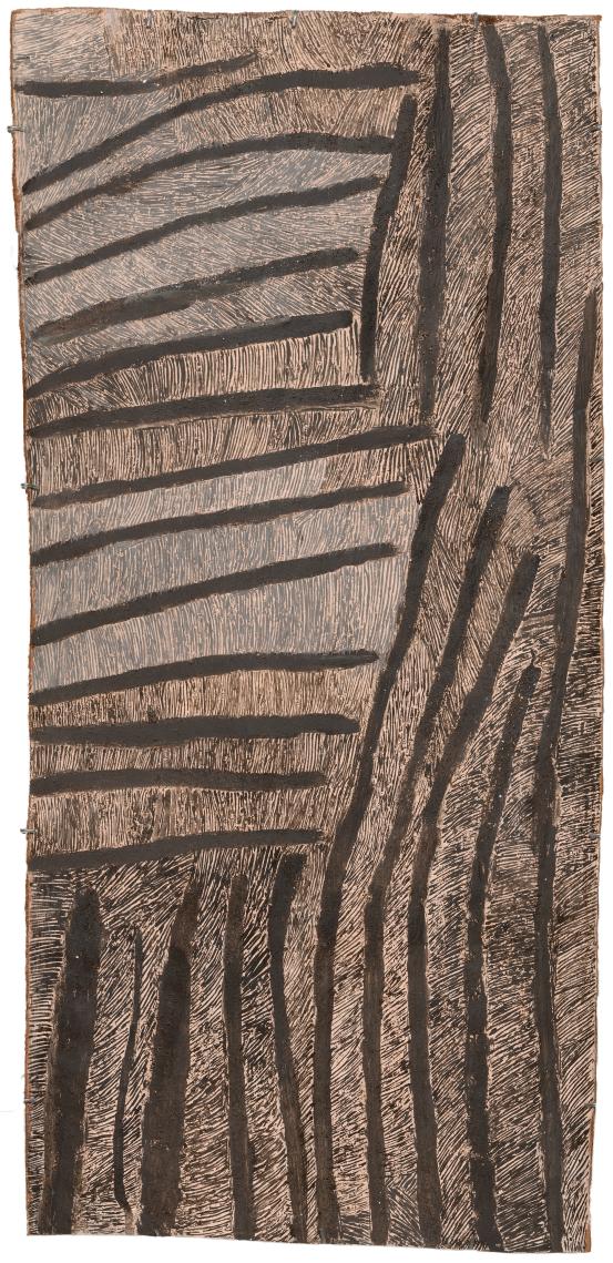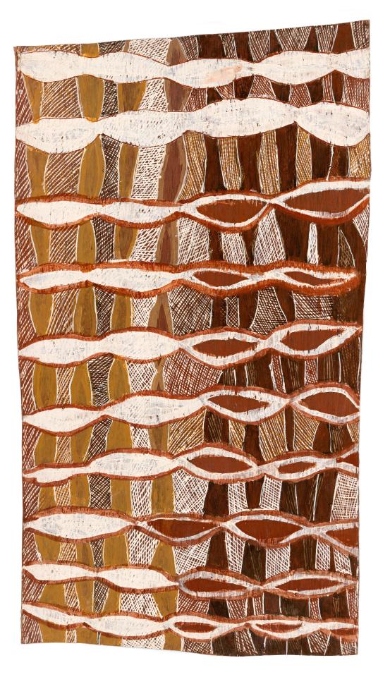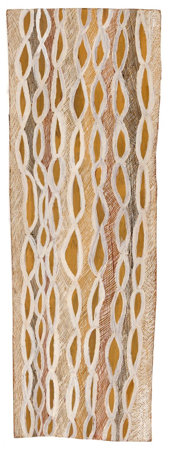 Nancy Gaymala Yunupiŋu was born around 1935, the eldest daughter of artist and leader Muŋgurrawuy Yunupiŋu (c. 1907 – 1979). She became maḻamarr (eldest child) after her brother was killed by a shark on the Wessel Islands. A renowned Dhuwalandja language speaker, she belonged to the Gumatj clan and the Yirritja moiety, and her Country was Biranybirany on Caledon Bay, associated with the Ancestral fire. Gaymala learnt Gumatj designs and stories from her father, Muŋgurrawuy, and she began to paint on bark as well as canvas and canvas board in the 1980s. Nancy Gaymala Yunupiŋu held her first solo exhibition at the Australian Girls Own Gallery (aGOG) in Canberra in 1992, followed by another at aGOG in 1995. She died in 2005.