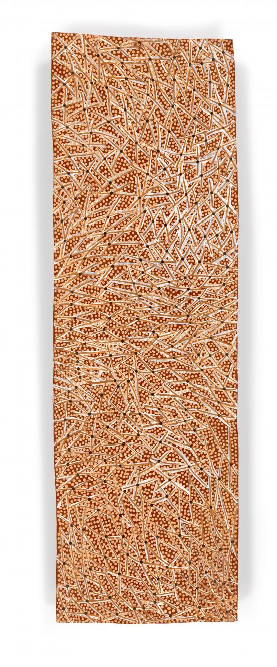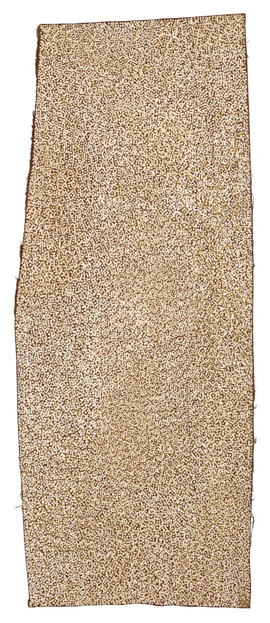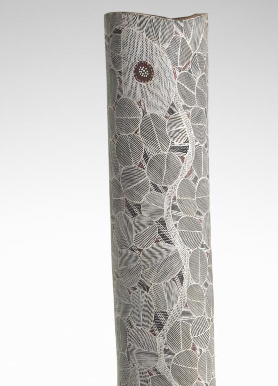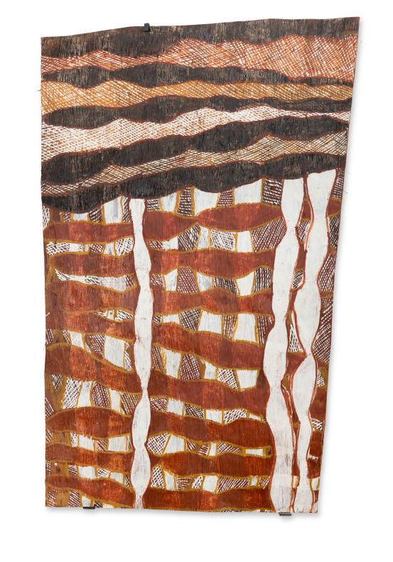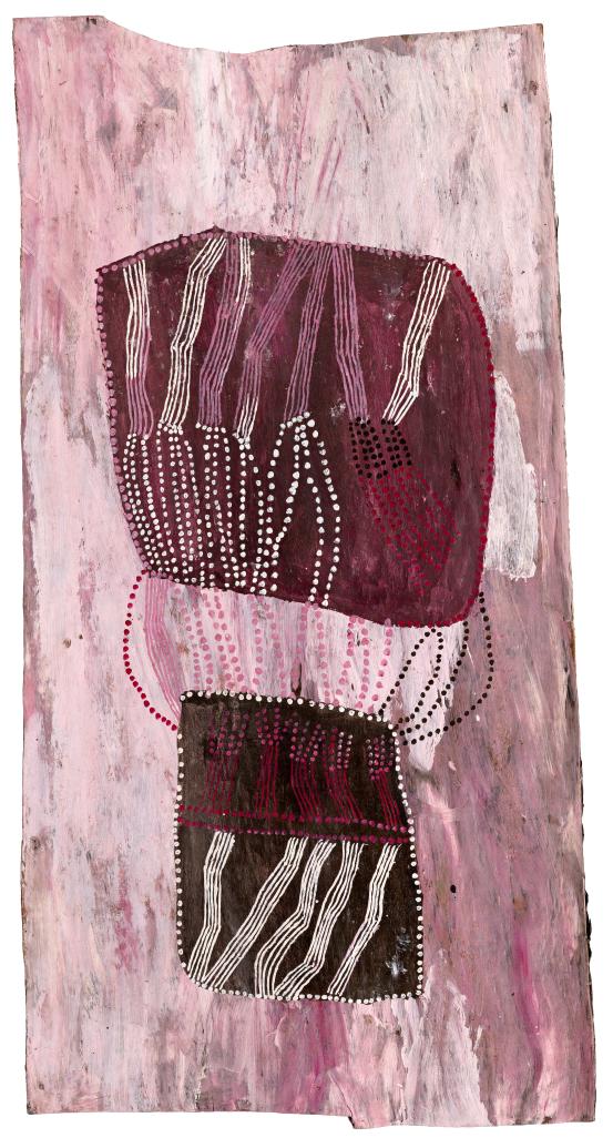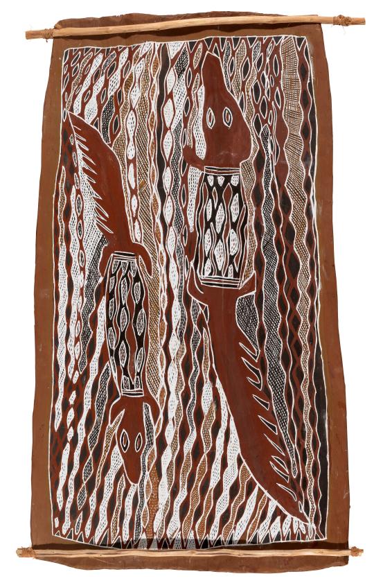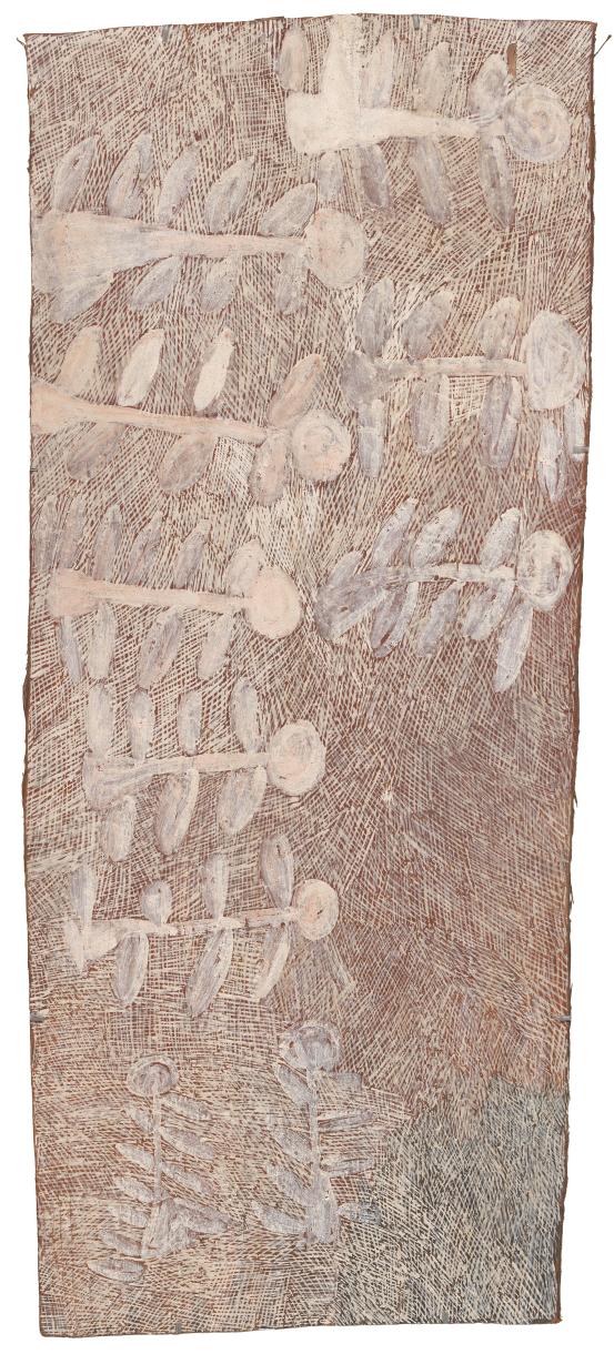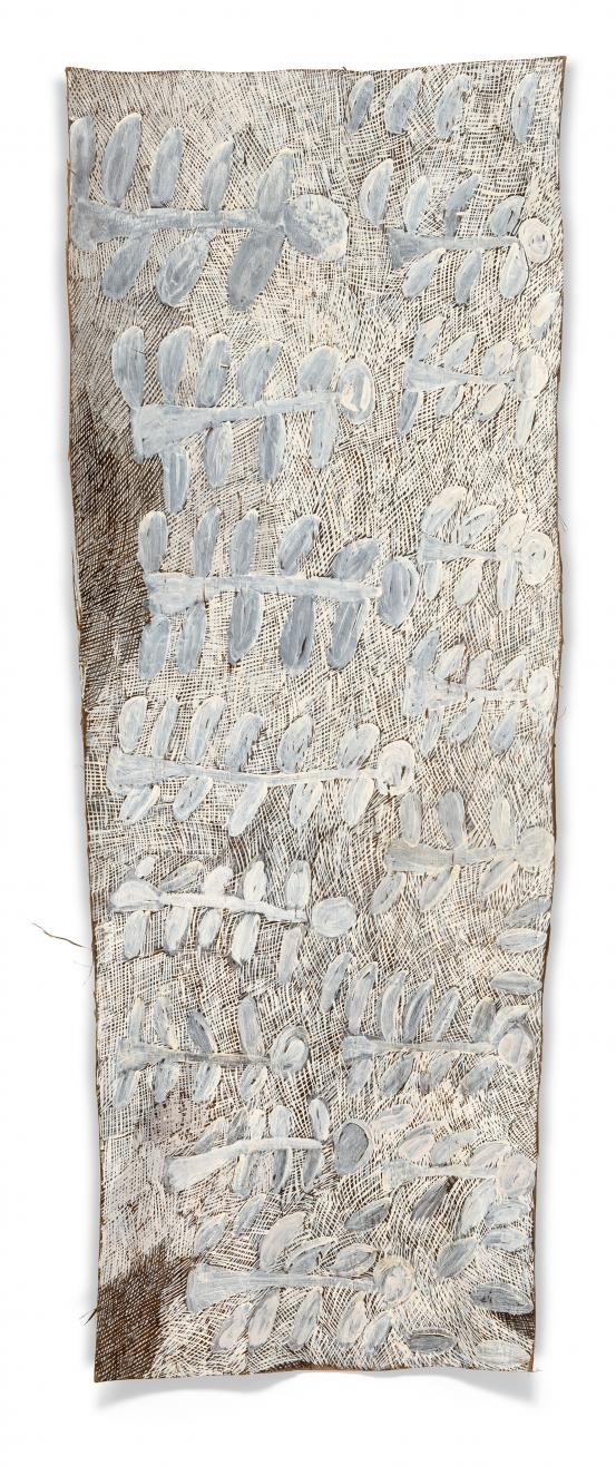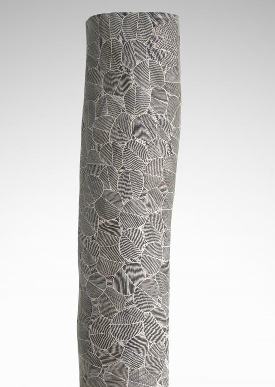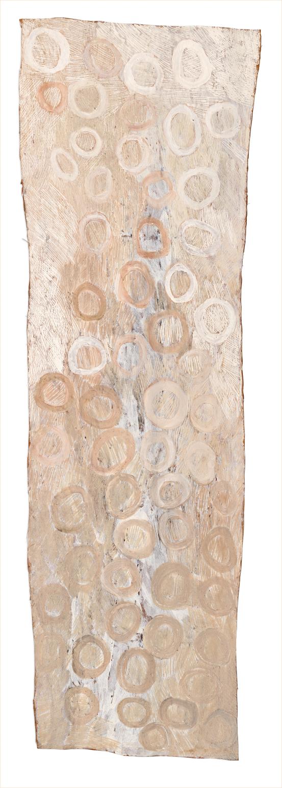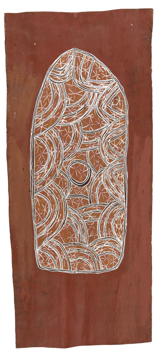 Nancy Gaymala Yunupiŋu was born around 1935, the eldest daughter of artist and leader Muŋgurrawuy Yunupiŋu (c. 1907 – 1979). She became maḻamarr (eldest child) after her brother was killed by a shark on the Wessel Islands. A renowned Dhuwalandja language speaker, she belonged to the Gumatj clan and the Yirritja moiety, and her Country was Biranybirany on Caledon Bay, associated with the Ancestral fire. Gaymala learnt Gumatj designs and stories from her father, Muŋgurrawuy, and she began to paint on bark as well as canvas and canvas board in the 1980s. Nancy Gaymala Yunupiŋu held her first solo exhibition at the Australian Girls Own Gallery (aGOG) in Canberra in 1992, followed by another at aGOG in 1995. She died in 2005.