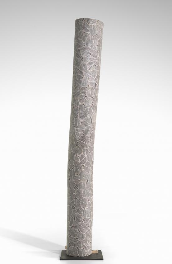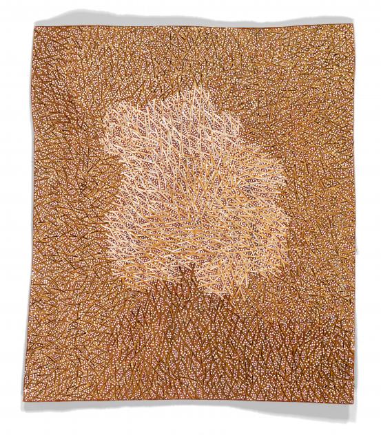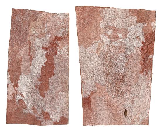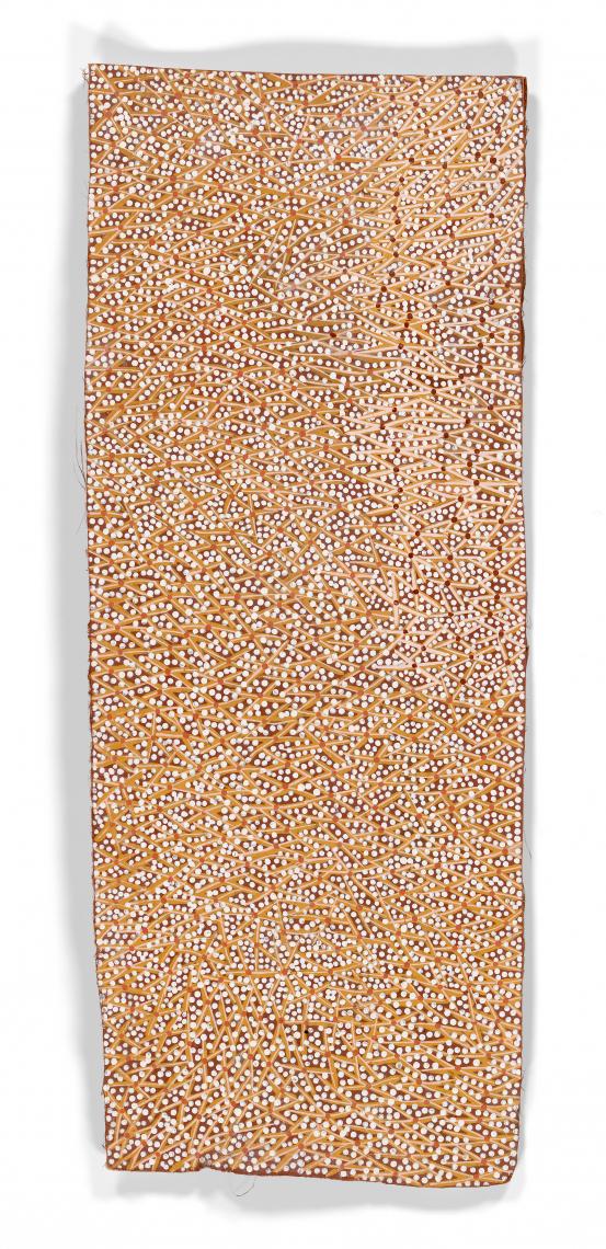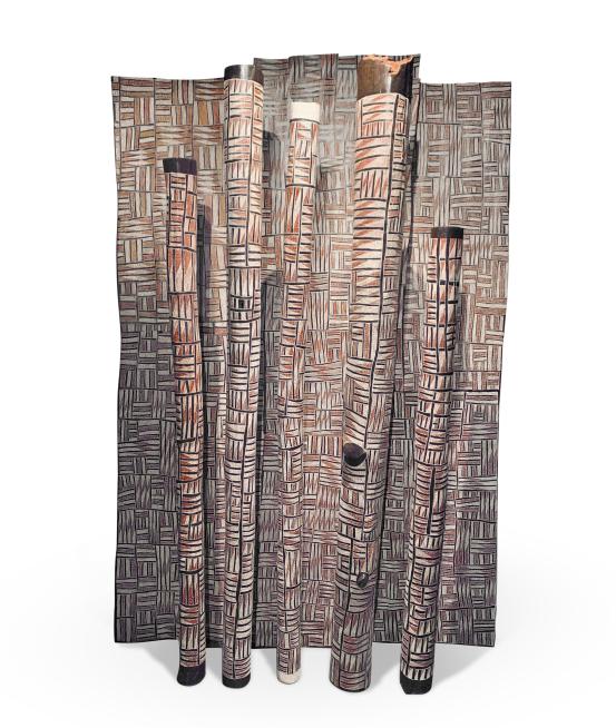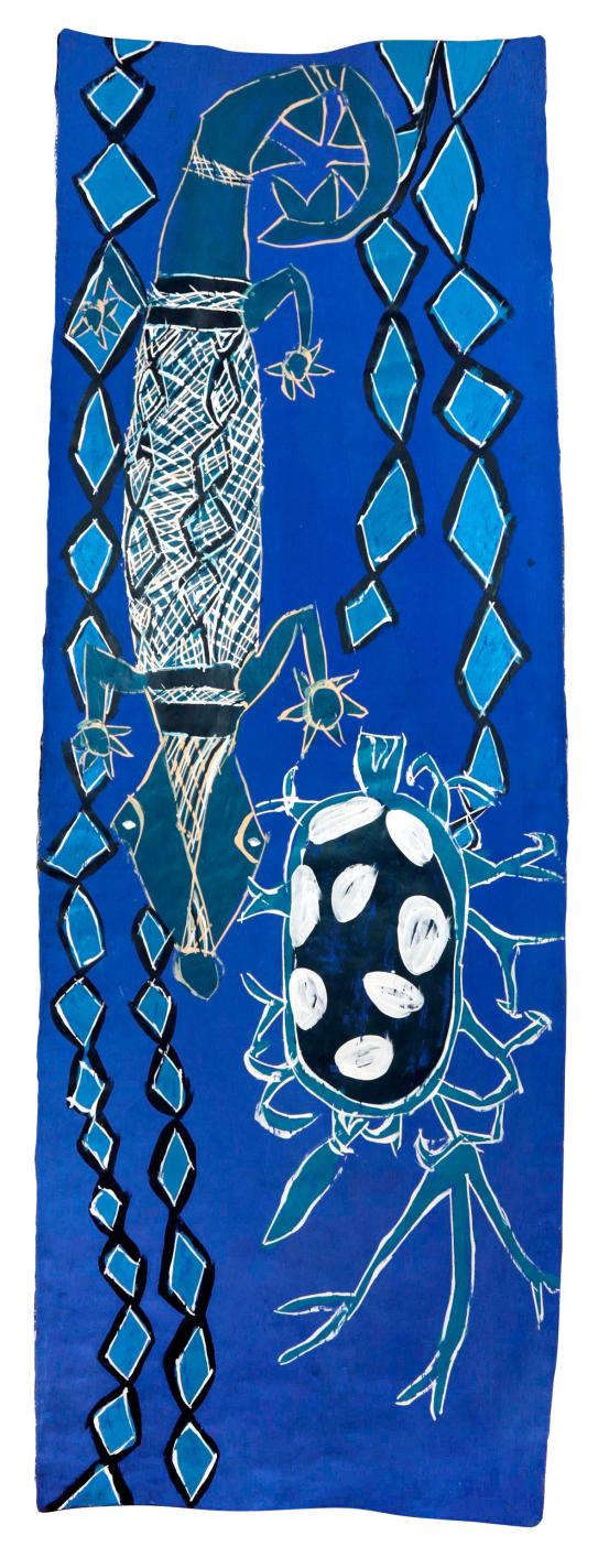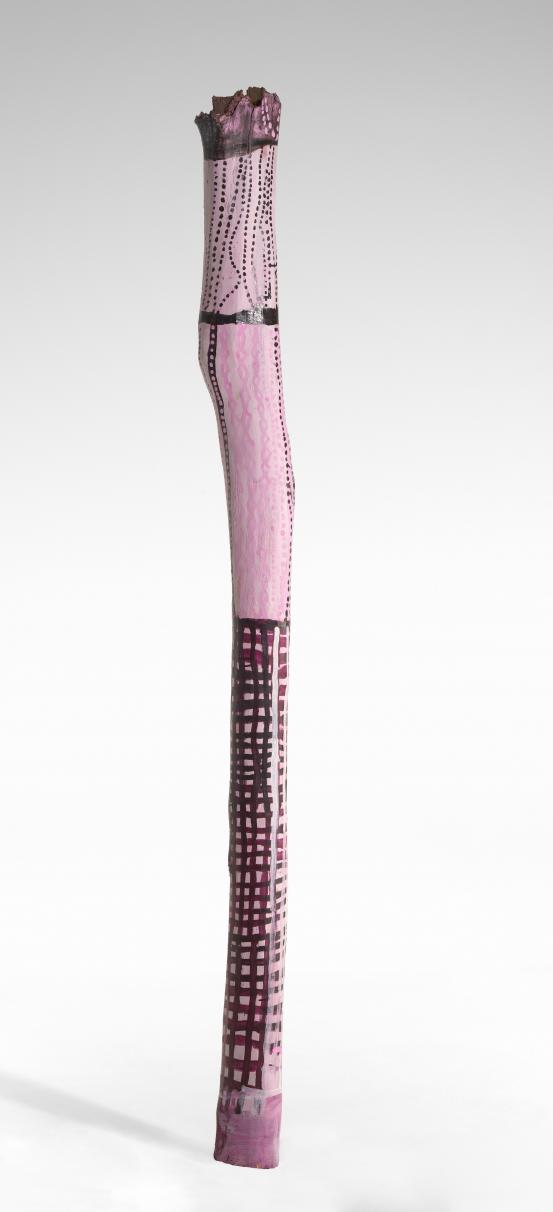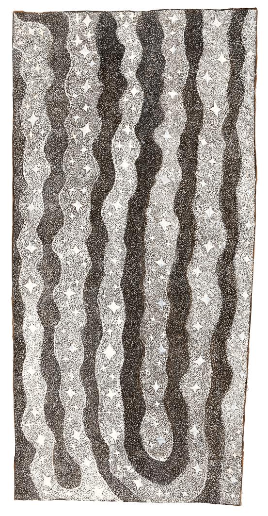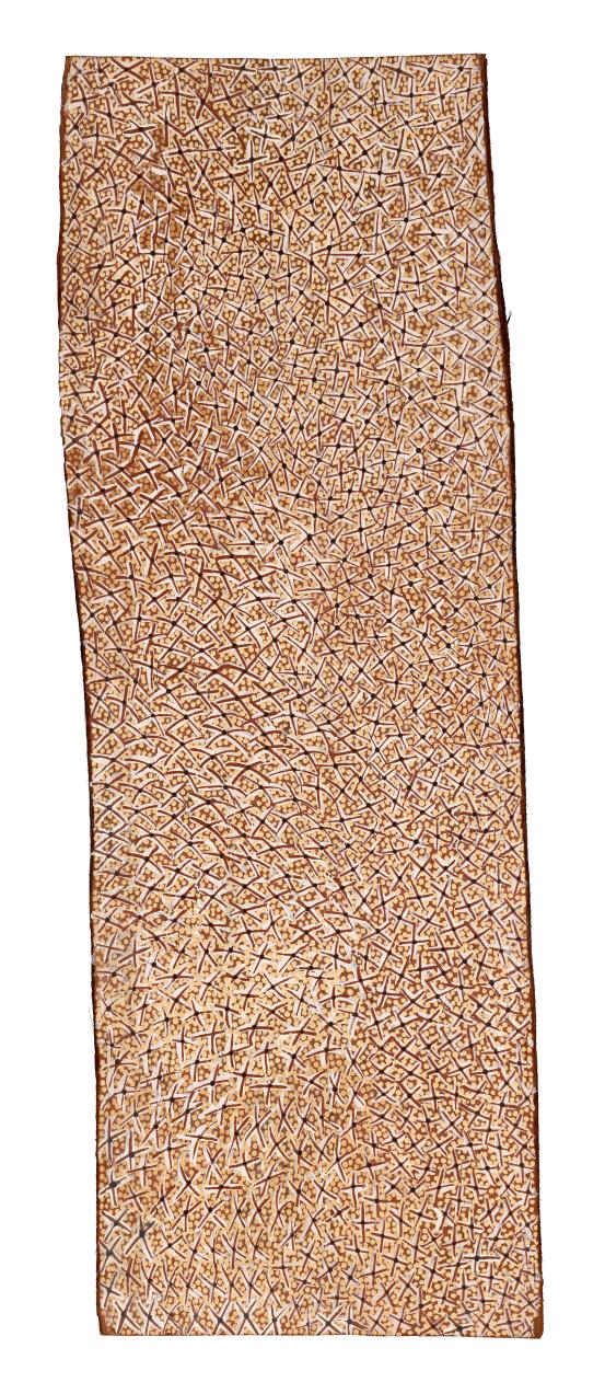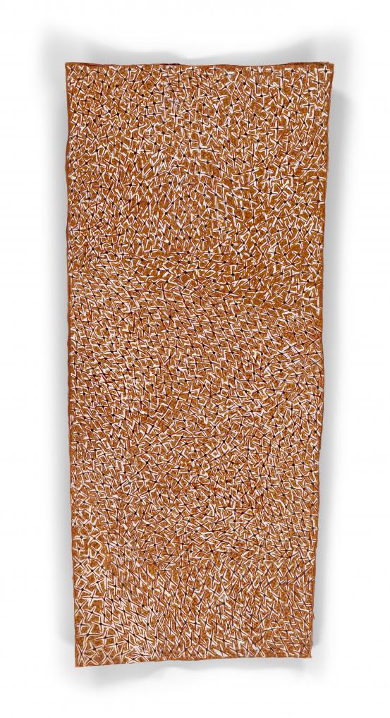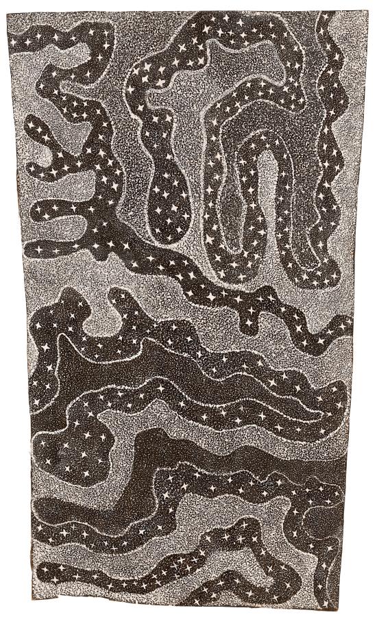 Nancy Gaymala Yunupiŋu was born around 1935, the eldest daughter of artist and leader Muŋgurrawuy Yunupiŋu (c. 1907 – 1979). She became maḻamarr (eldest child) after her brother was killed by a shark on the Wessel Islands. A renowned Dhuwalandja language speaker, she belonged to the Gumatj clan and the Yirritja moiety, and her Country was Biranybirany on Caledon Bay, associated with the Ancestral fire. Gaymala learnt Gumatj designs and stories from her father, Muŋgurrawuy, and she began to paint on bark as well as canvas and canvas board in the 1980s. Nancy Gaymala Yunupiŋu held her first solo exhibition at the Australian Girls Own Gallery (aGOG) in Canberra in 1992, followed by another at aGOG in 1995. She died in 2005.