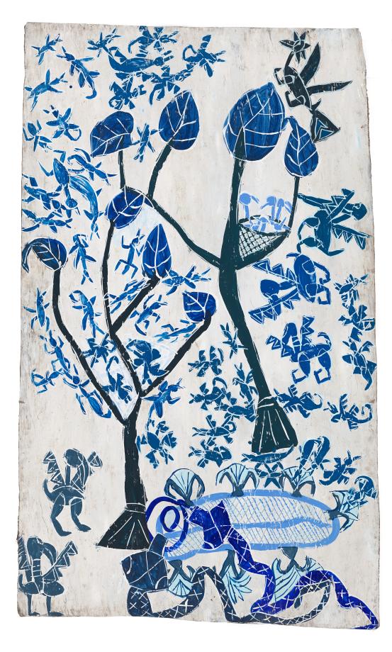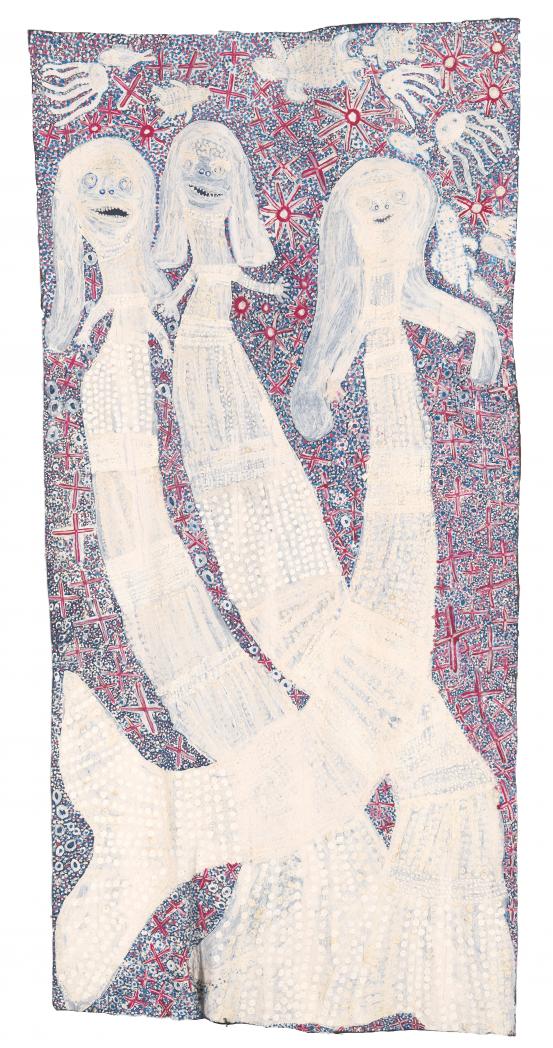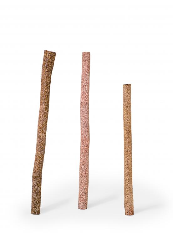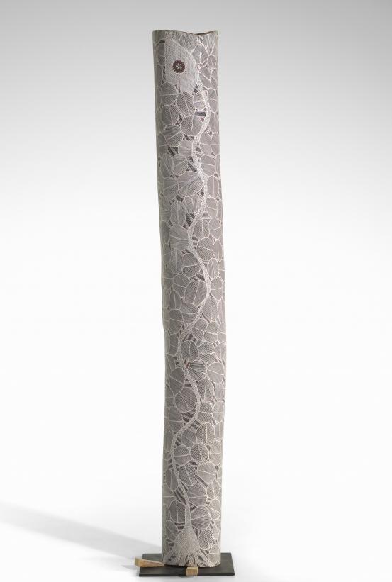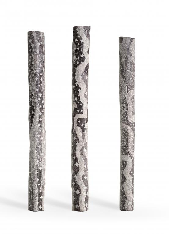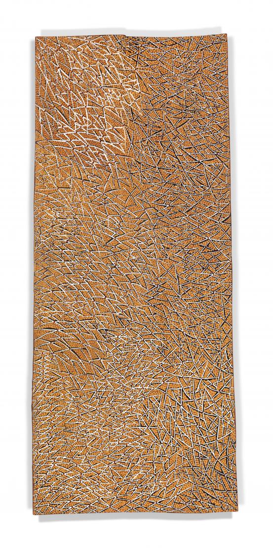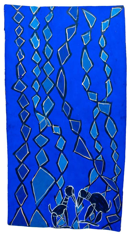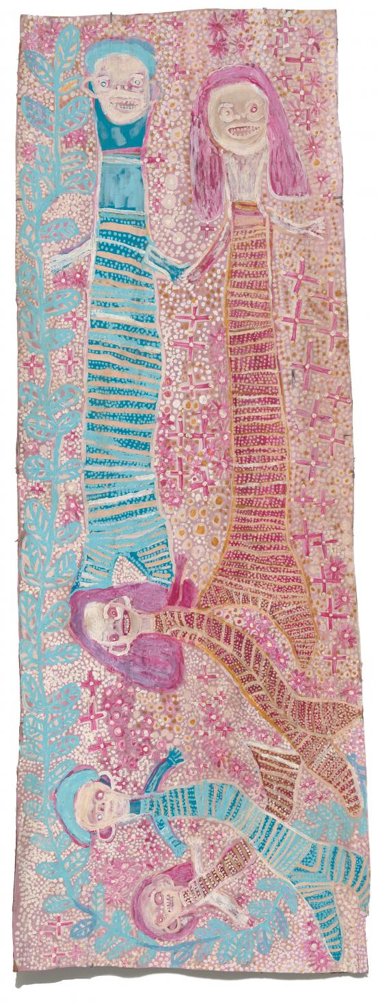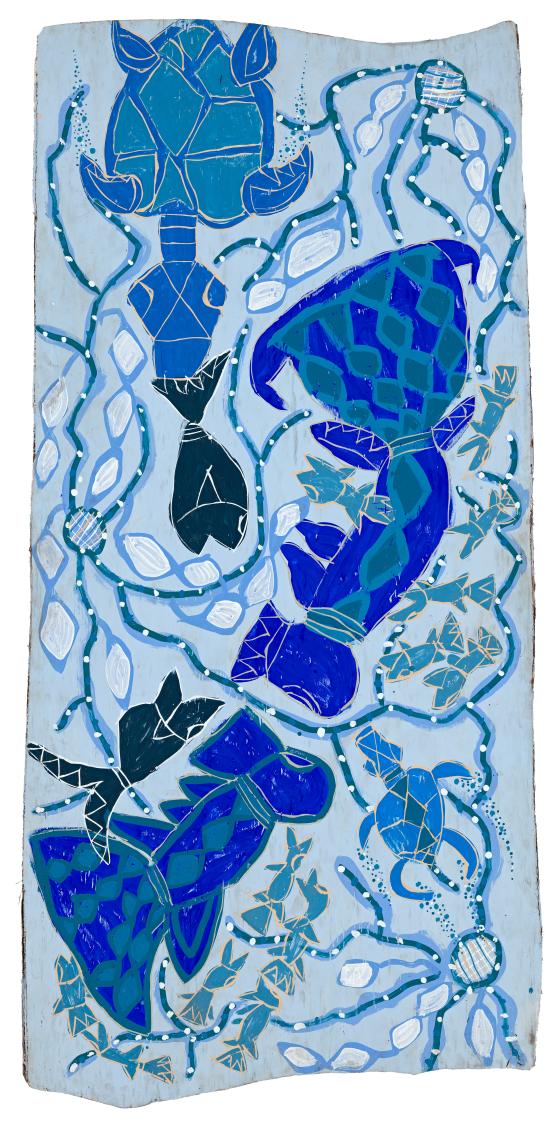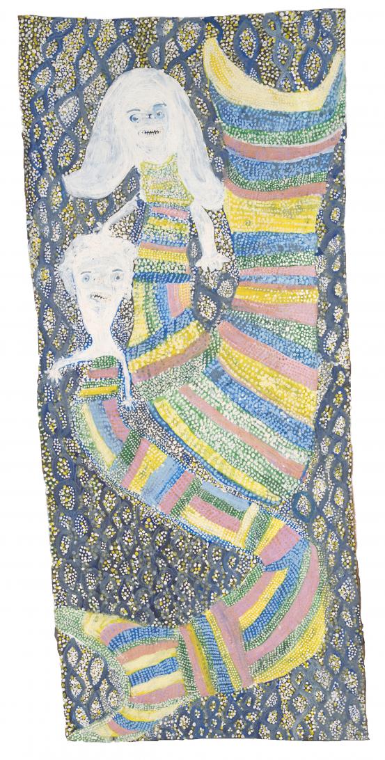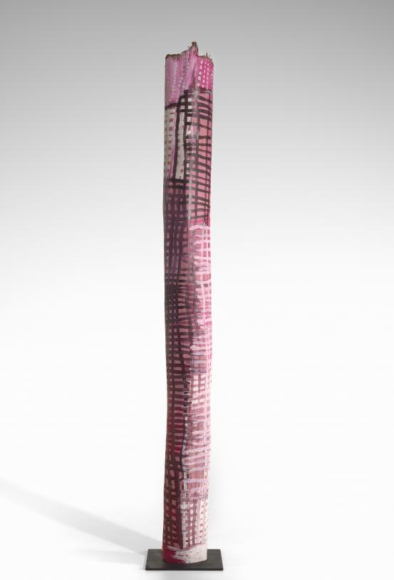 Nancy Gaymala Yunupiŋu was born around 1935, the eldest daughter of artist and leader Muŋgurrawuy Yunupiŋu (c. 1907 – 1979). She became maḻamarr (eldest child) after her brother was killed by a shark on the Wessel Islands. A renowned Dhuwalandja language speaker, she belonged to the Gumatj clan and the Yirritja moiety, and her Country was Biranybirany on Caledon Bay, associated with the Ancestral fire. Gaymala learnt Gumatj designs and stories from her father, Muŋgurrawuy, and she began to paint on bark as well as canvas and canvas board in the 1980s. Nancy Gaymala Yunupiŋu held her first solo exhibition at the Australian Girls Own Gallery (aGOG) in Canberra in 1992, followed by another at aGOG in 1995. She died in 2005.