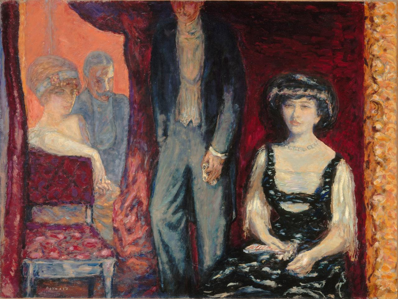 展览的前几部分探讨了博纳尔在纳比派艺术家圈子中的核心角色,以及他与当代音乐和戏剧界的互动。皮埃尔·博纳尔、莫里斯·丹尼(Maurice Denis)、爱德华·维亚尔(Édouard Vuillard)、保罗·兰森(Paul Ranson)、保罗·塞鲁西埃(Paul Sérusier)和费利克斯·瓦洛顿(Félix Vallotton)等年轻艺术家在19世纪90年代早期组成纳比派,他们认为自己是一种新的艺术形式的先知,并且设想这种艺术形式将涵盖现代生活的各个领域,如室内设计、家具、扇子和纺织品、彩色玻璃、商业插图和广告。展览将展出维 亚尔和瓦洛顿的画作以及丹尼的版画。
