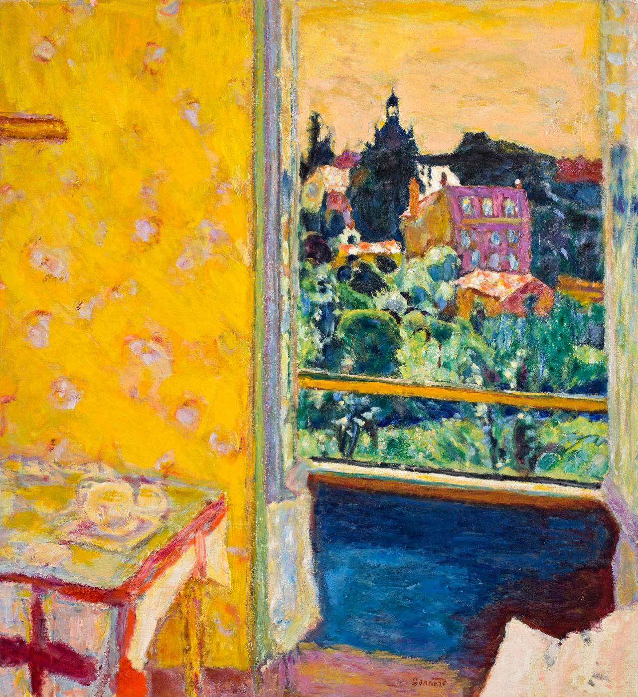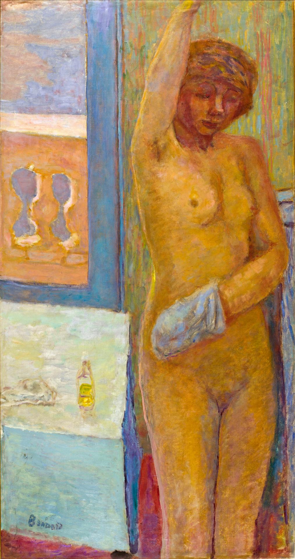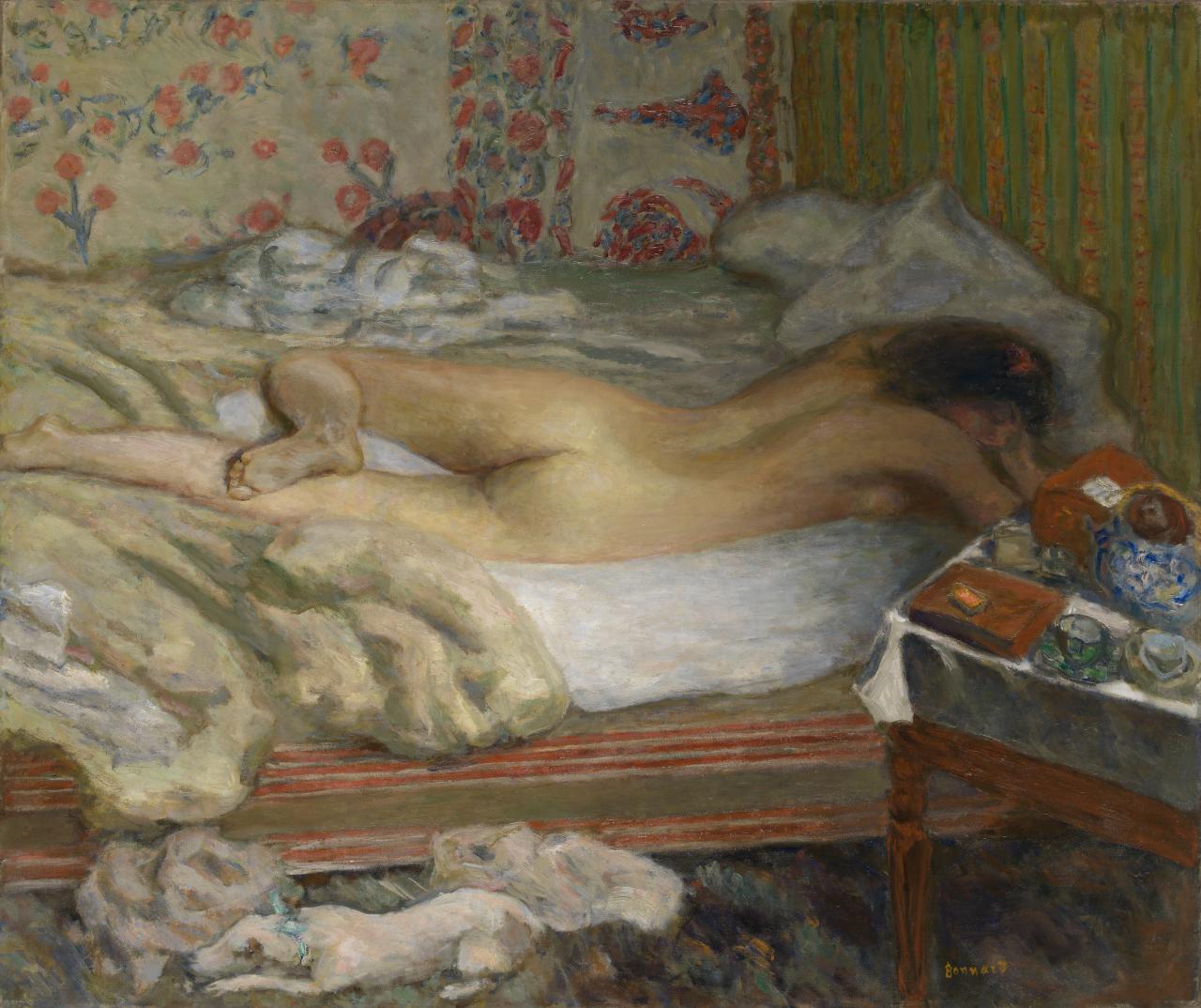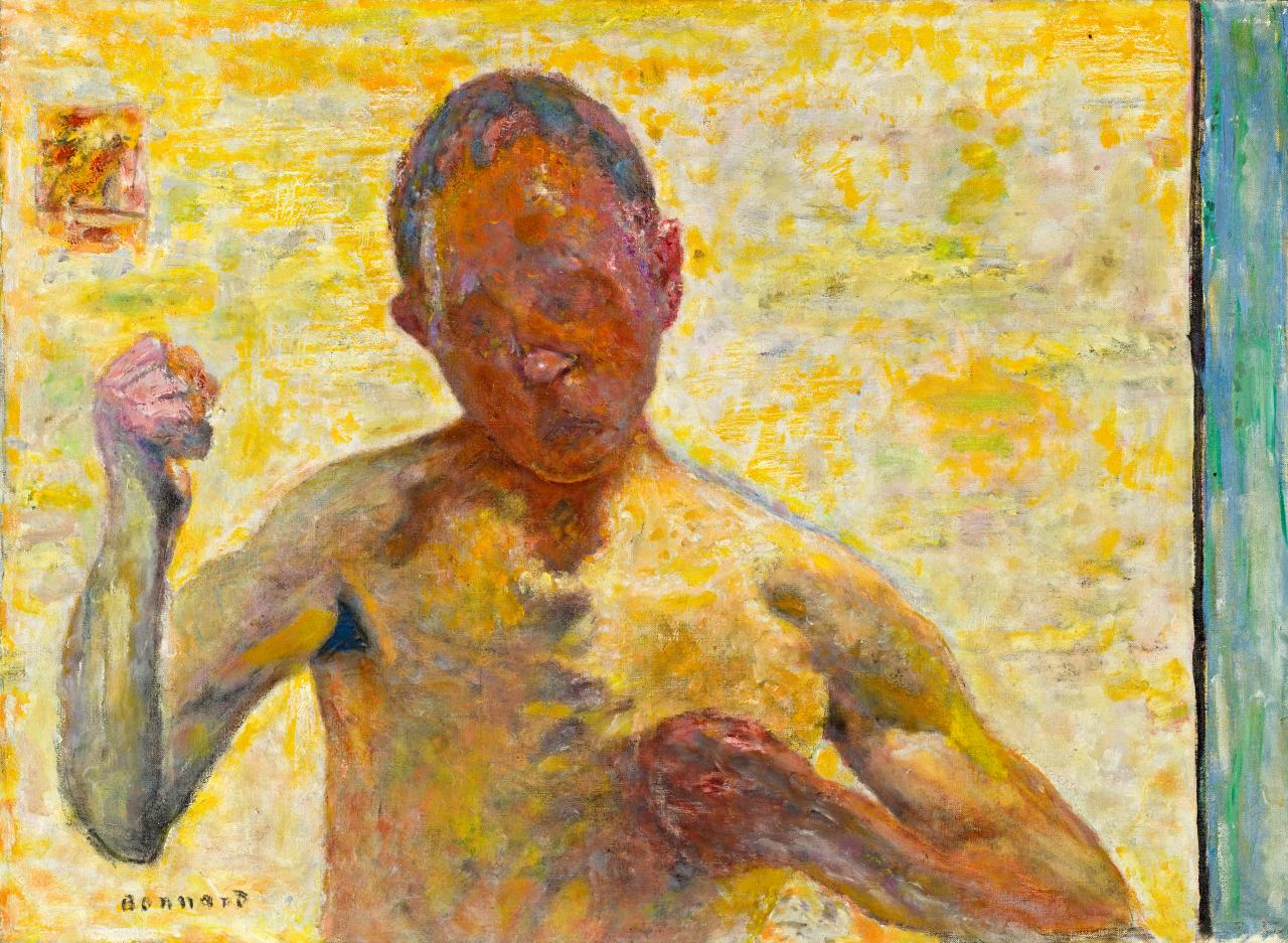 博纳尔在1893年与玛丽亚·波辛(Maria Boursin,玛丽亚自称为玛尔特·德·梅利尼)相遇,这也给博纳尔本人带来了家庭亲密关系,这一亲密关系在一系列引人注目的裸体习作中达到高潮,作品包括石版画和油画。博纳尔和德·梅利尼共同生活,为了后者的健康,他们更多地在乡村度日。除了描绘自家生活的亲密习作外,博纳尔还投身于风景画运动,与法国印象派的传统互动。从1909年开始,博纳尔频频前往法国南部,这为他的艺术带来了新的色彩强度,正如他所说,“这种颜色让人发狂”。博纳尔搬到法国南部后,创作了大量温暖而充满活力的室内场景和静物作品,这些作品构成了展览的重要组成部分。在职业生涯的最后几十年里,博纳尔创作了一些痛苦的自省作品(如自画像和日常生活的场景)以及其他规模宏大、色彩欢快的作品,赞美了博纳尔和德·梅利尼居住的法国里维埃拉(Riviera)地区戛纳附近的小镇勒坎内(Le Cannet)周围明亮的风景。