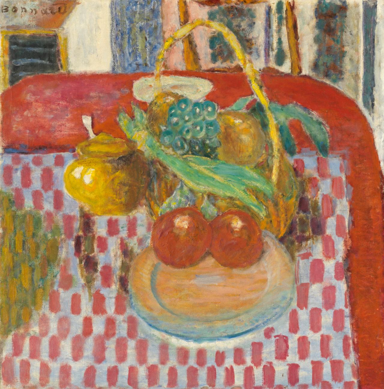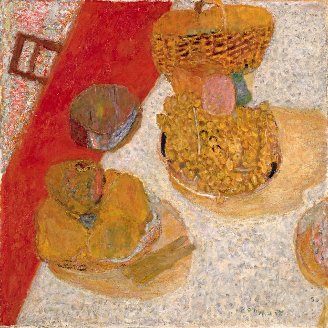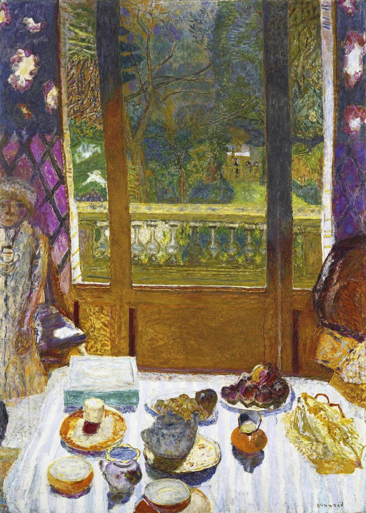 博纳尔在1893年与玛丽亚·波辛(Maria Boursin,玛丽亚自称为玛尔特·德·梅利尼)相遇,这也给博纳尔本人带来了家庭亲密关系,这一亲密关系在一系列引人注目的裸体习作中达到高潮,作品包括石版画和油画。博纳尔和德·梅利尼共同生活,为了后者的健康,他们更多地在乡村度日。除了描绘自家生活的亲密习作外,博纳尔还投身于风景画运动,与法国印象派的传统互动。从1909年开始,博纳尔频频前往法国南部,这为他的艺术带来了新的色彩强度,正如他所说,“这种颜色让人发狂”。博纳尔搬到法国南部后,创作了大量温暖而充满活力的室内场景和静物作品,这些作品构成了展览的重要组成部分。在职业生涯的最后几十年里,博纳尔创作了一些痛苦的自省作品(如自画像和日常生活的场景)以及其他规模宏大、色彩欢快的作品,赞美了博纳尔和德·梅利尼居住的法国里维埃拉(Riviera)地区戛纳附近的小镇勒坎内(Le Cannet)周围明亮的风景。