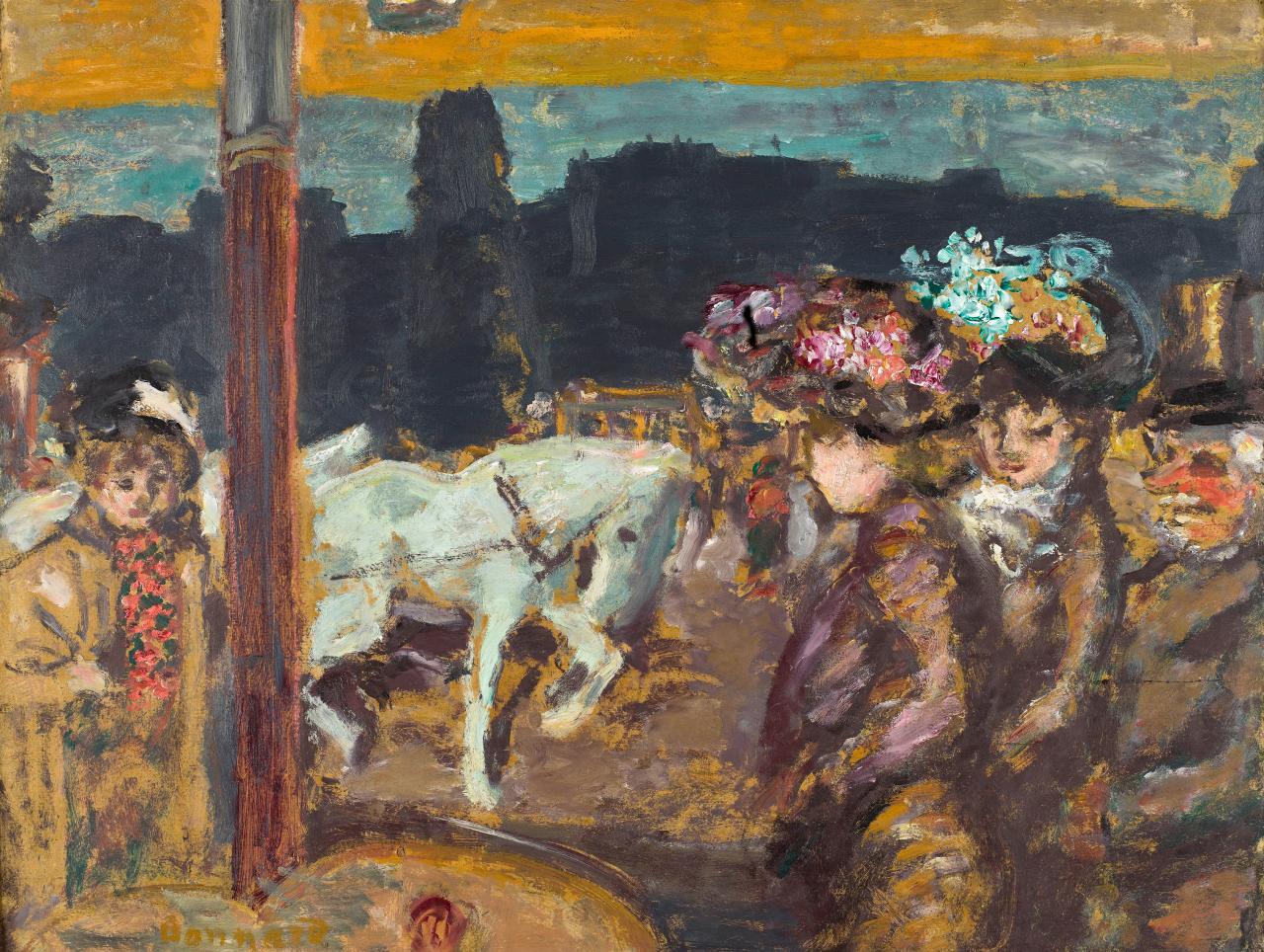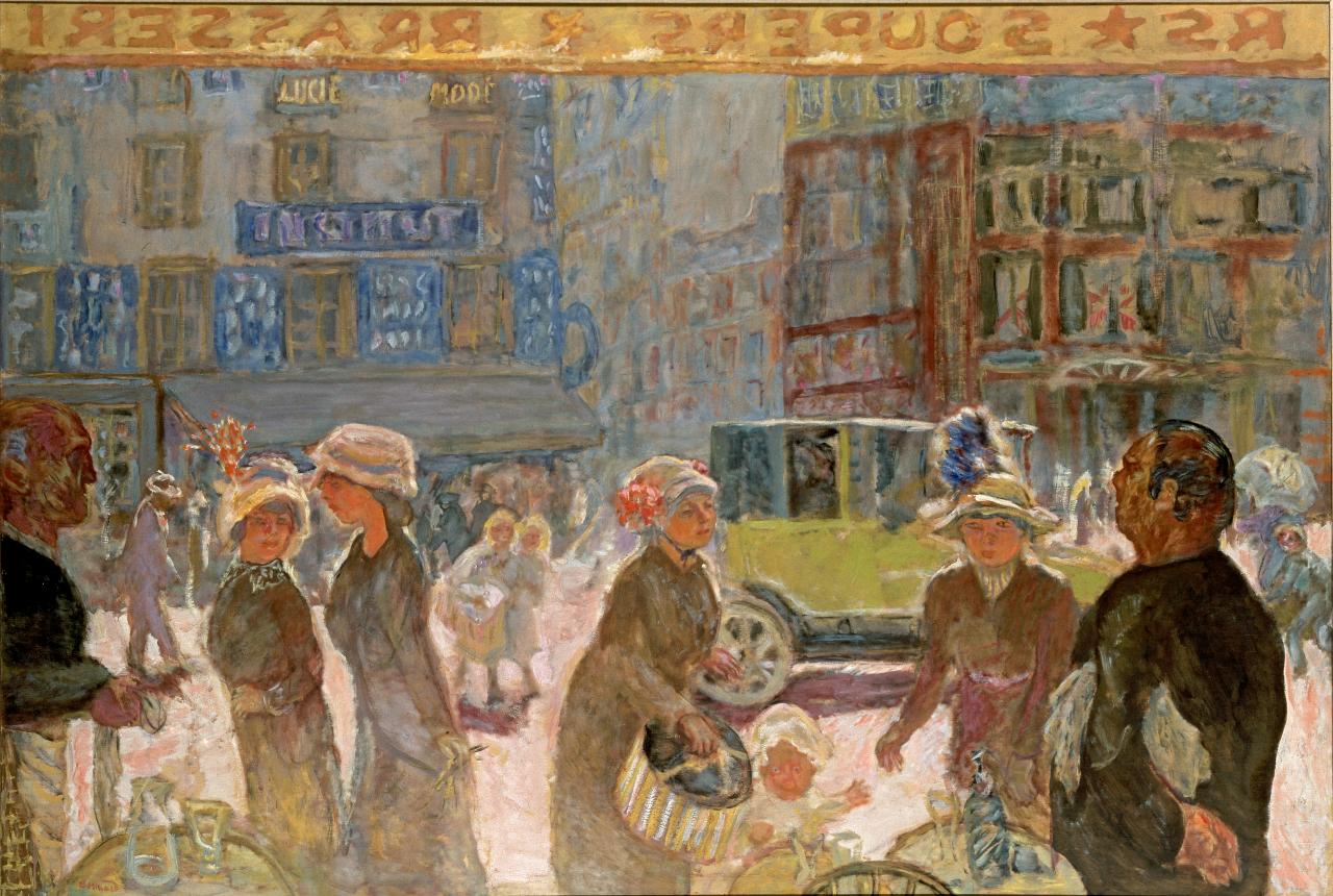 在这一时期,博纳尔以一种即时而惊人的近距离方式记录了巴黎街头的日常生活,观察他所说的“日常生活的剧院”。受他与先驱电影人奥古斯特和路易斯·卢米埃兄弟(Auguste and Louis Lumière)的友谊的影响,博纳尔成为第一批从新兴的电影媒介中汲取灵感的艺术家之一。他还热爱摄影,并用艺术家的眼光审视自己的家庭成员,捕捉意想不到的运动和即兴构图的瞬间。卢米埃兄弟的影片与博纳尔在这一时期创作的充满活力的城市场景比邻放映。
