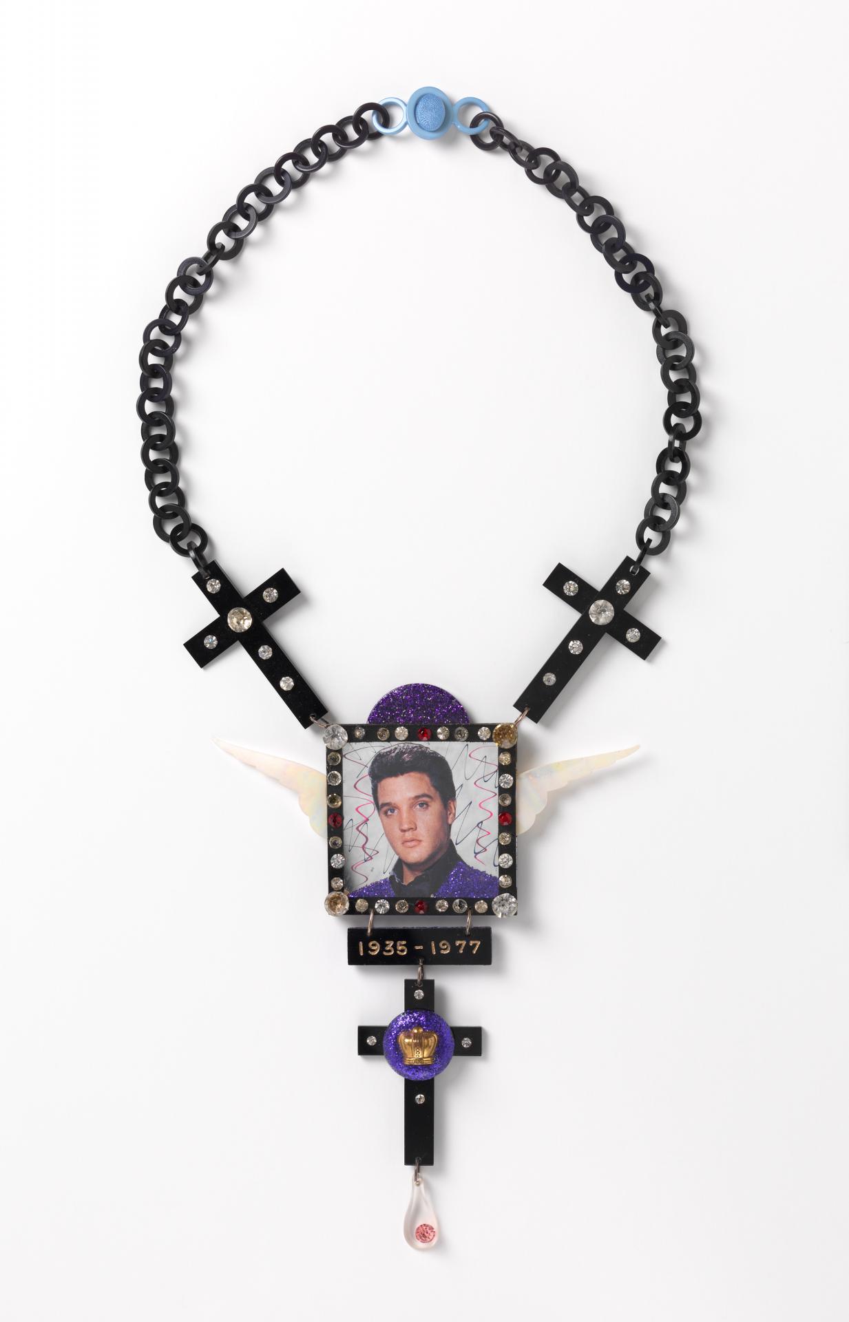 Some of the pieces in the exhibition will startle viewers from the pre-conceived idea of what is craft, e.g . the life-size fibre cow, which demonstrates that the natural fibres have uninvestigated sculptural qualities. Other works may surprise and entertain: an assemblage of life-sized crocheted figures and landscape components; a pendant in memory of Elvis Presley; and a ceramic cherub diving head-first into a bowl of fruit.
