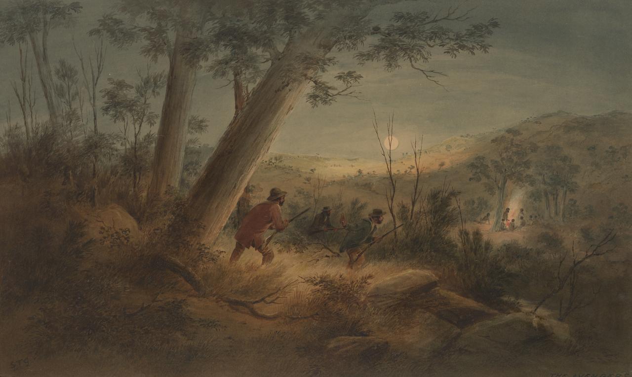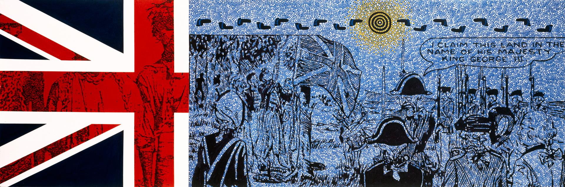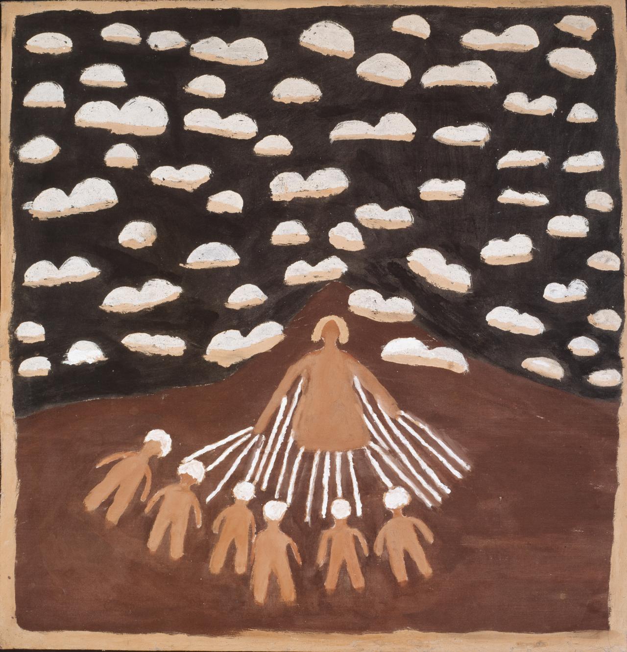 Since 1788 thousands of Aboriginal people have died as a consequence of British expansion. This forest of hollow logs made by Aboriginal artists across Arnhem Land, and of Pukumani poles by Tiwi artists of Melville and Bathurst islands, stands as a large memorial to those who died defending their Country in Australia’s Frontier Wars. The maintenance of customary mourning practices by male and female Aboriginal artists and their strength to remain on Country are acts of defiance. Aboriginal people today continue to assert their sovereignty through their lived relationship with the land and each other and remain connected to their ancestors through the continuation of cultural practices like these.