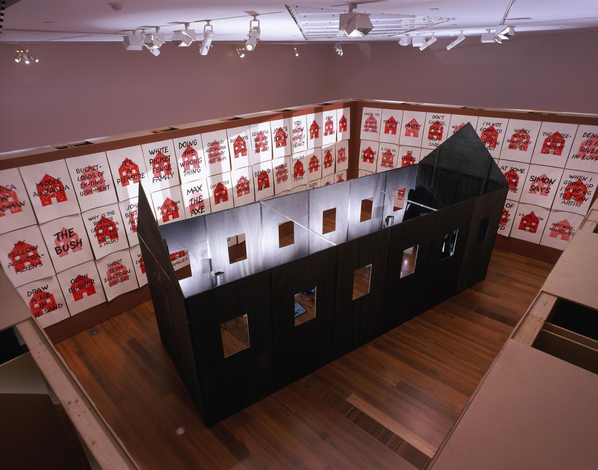 Through the insertion of his own history into the public domain, as well as an analysis of life through the filter of his own experiences, Aleks Danko holds up the suburbs and, as a result, the ‘Australian dream’ for scrutiny. The closed doors and windows of the cubby-house home that appears throughout the Songs of Australia cycle not only exclude entry, but also prevent all interaction with the outside world. The blazing lights that stream from the structure in VOLUME 16 achieve a similar end. The imaginary occupants of Danko’s house are not simply unwilling, but perhaps also incapable (at worst, disinterested) in engaging with the potential opportunities and difficulties of the world beyond their doors.