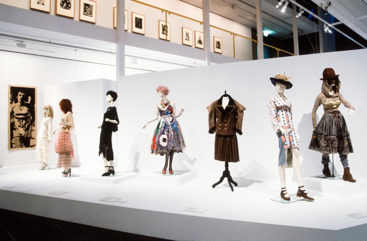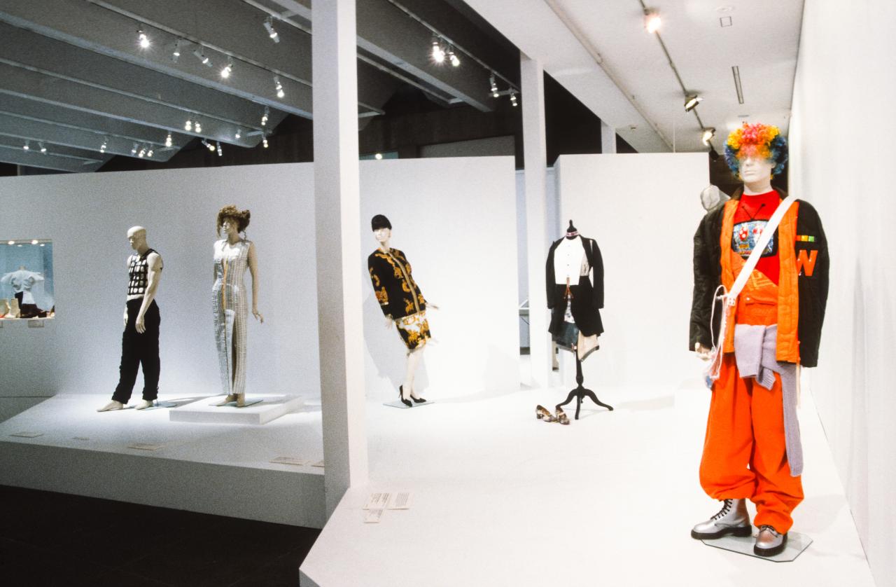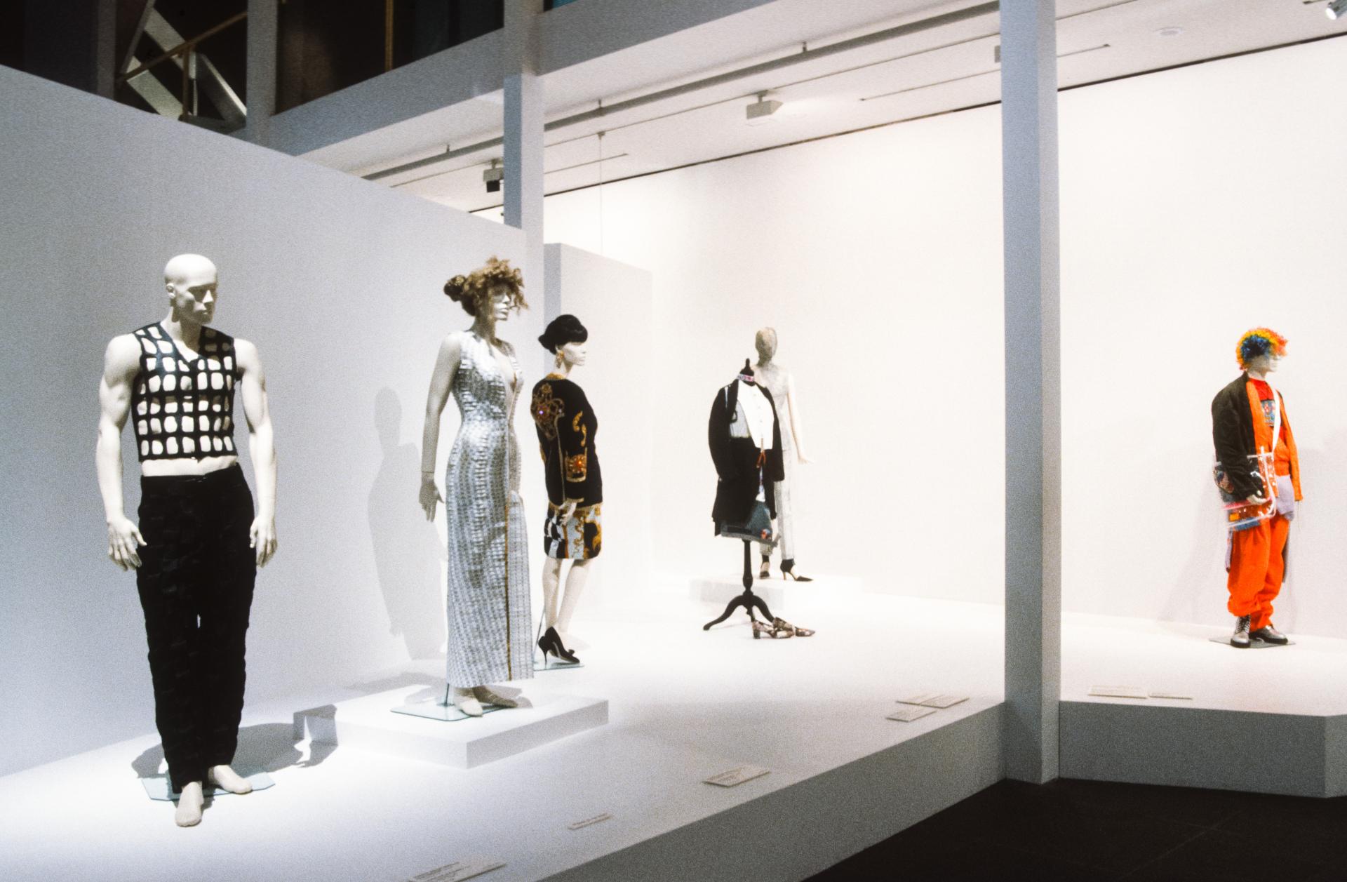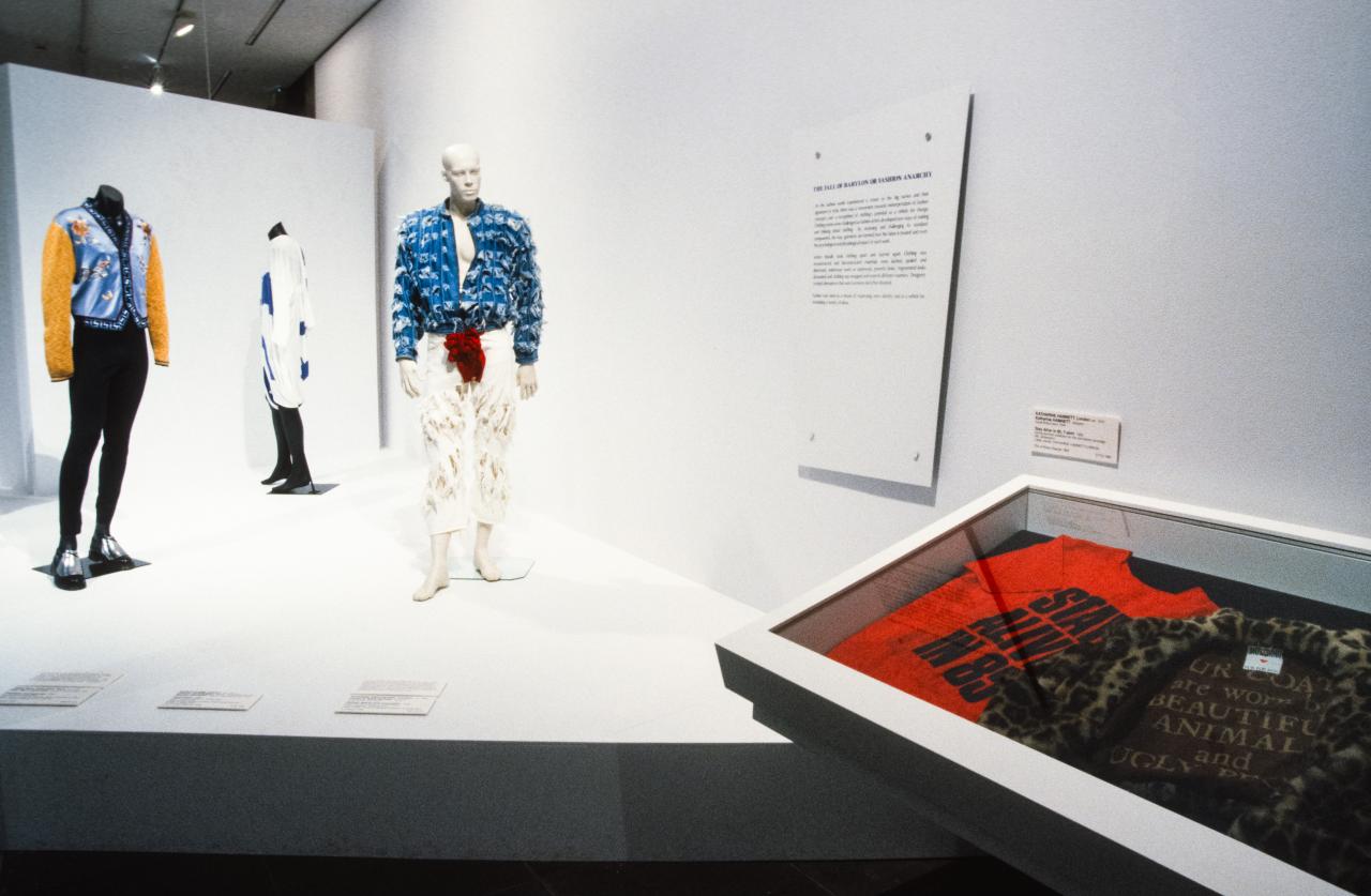 Couture to chaos represents over thirty fashion designers with sixty costumes and accessories. It explores some of the major themes and fashion styles, such as the use of industrial materials, optical effects, recycled elements; the introduction of new forms of costume such as trousers and knee-high boots; and the influence of some of the street sub-culture groups on the work of fashion artists.
