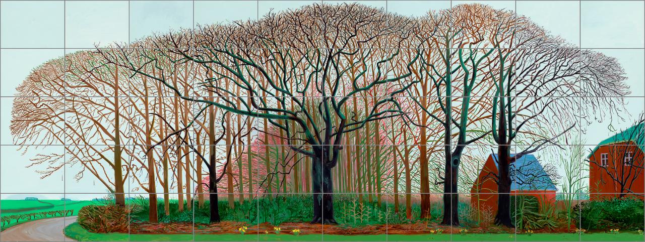 Hockney’s continued investigation into multi-point perspective is represented by The Jugglers, an 18-screen, twenty-two minute video that depicts the artist in a room of performers, injecting Hockney’s signature playfulness into the exhibition. Again utilising technology to reveal a study in perspective, Hockney’s Seven Yorkshire Landscapes is a 12 minute multi-viewpoint video displayed on 18 tiled, 55-inch monitors which monumentally showcases the extraordinary landscape.
