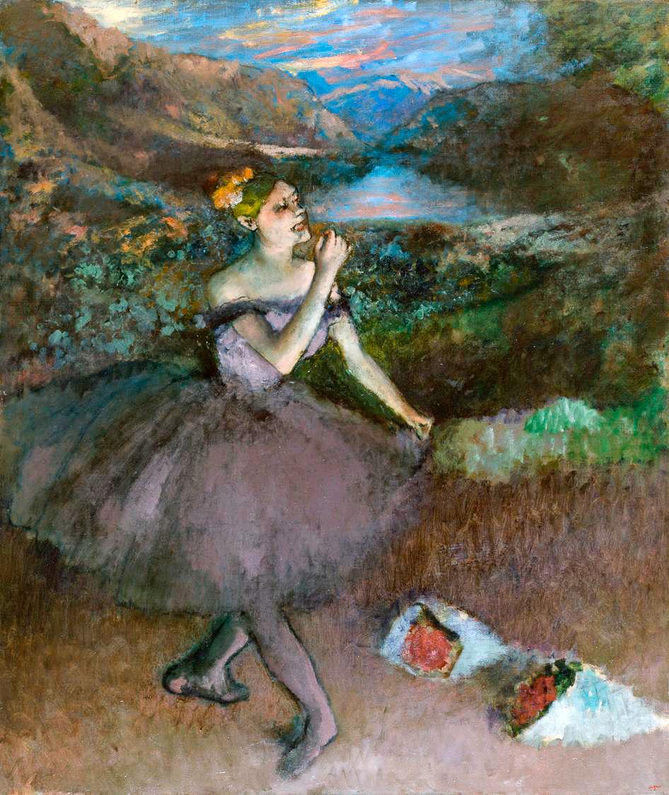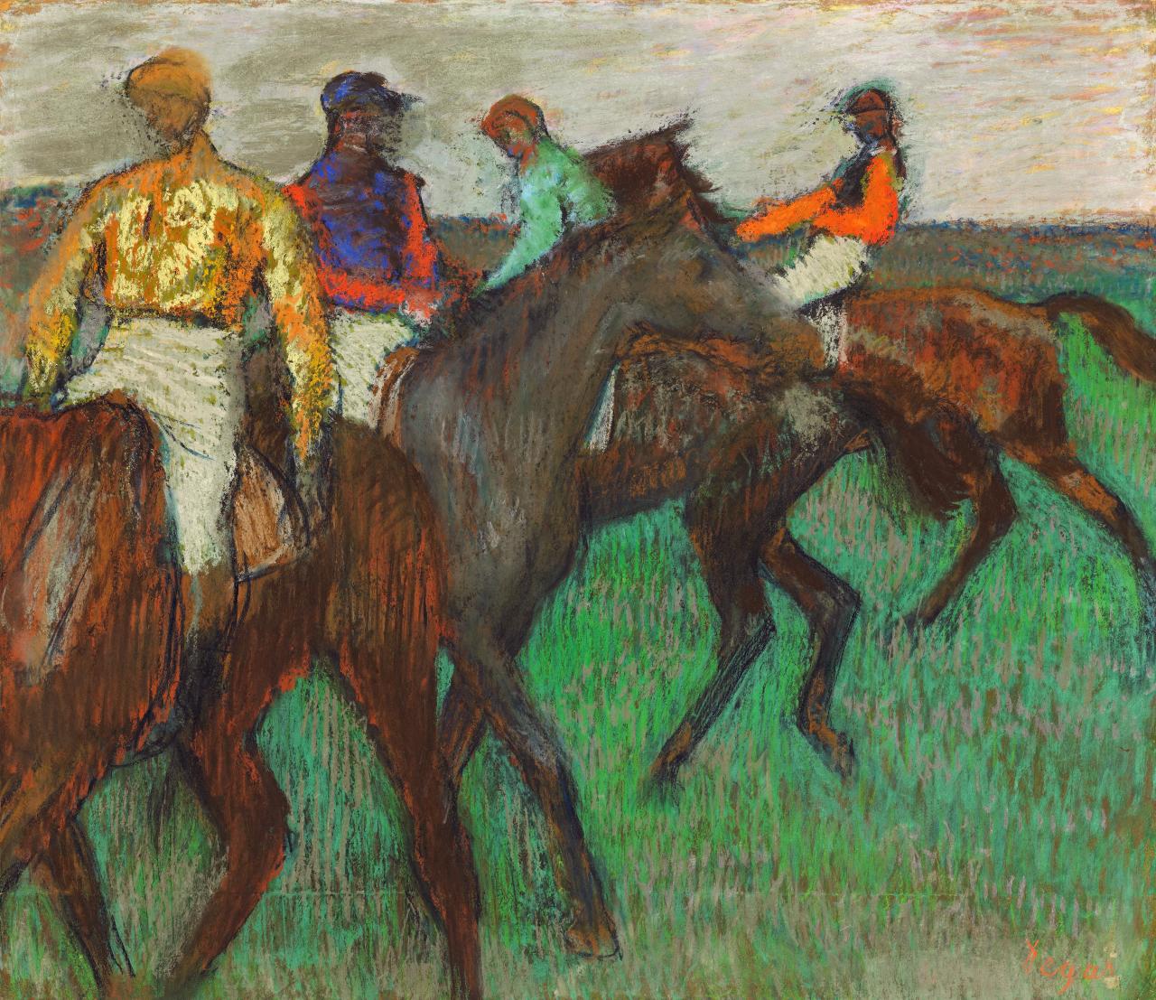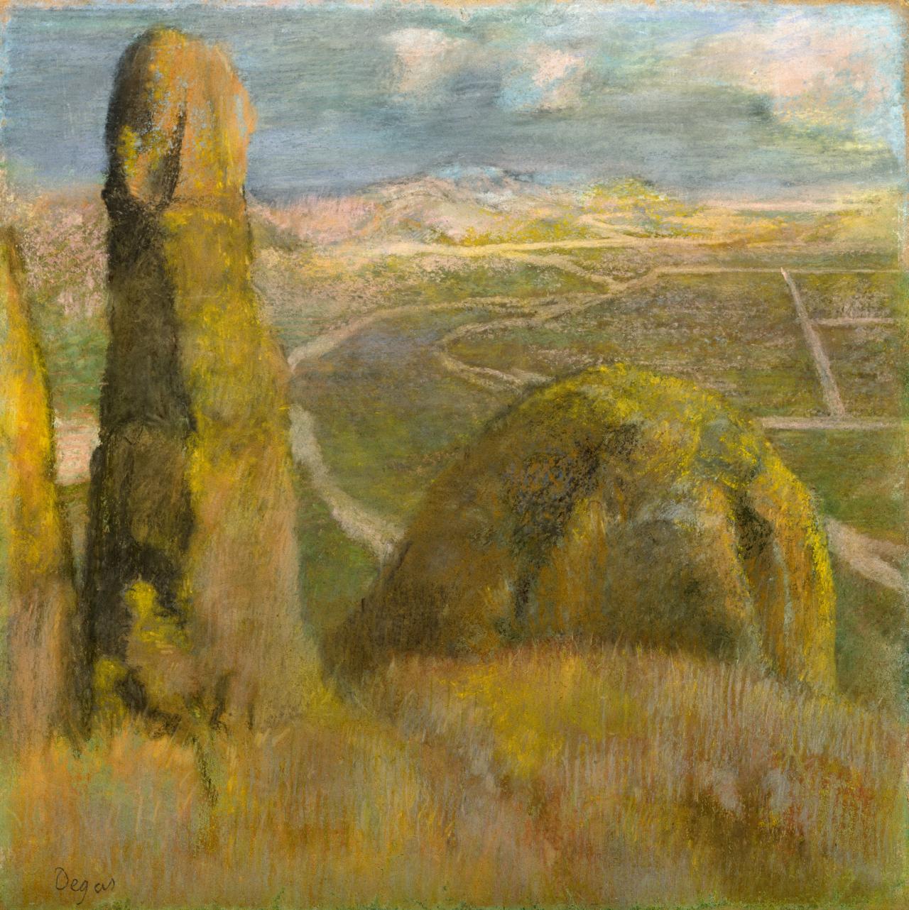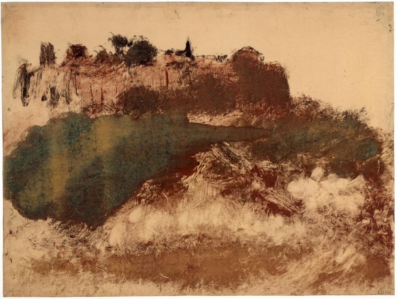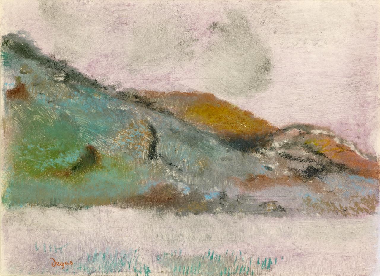 While the Impressionism of Claude Monet, Auguste Renoir, Camille Pissarro and Alfred Sisley manifested the charm of working en plein air (out of doors), Degas (who called himself a Realist rather than an Impressionist) preferred to work in the studio and to study his models by artificial light. He was drawn to the effects brought about by lamplight, oil lamps and stage footlights rather than those of the sun and clouds. His Impressionist colleagues were primarily – and often solely – painters, but Degas was first and foremost a draughtsman, working with pencil, chalk, charcoal, gouache, watercolour and pastel. He reinvented the monotype which, along with printmaking and later photography, permitted him to make admirable bodies of work in black and white. In the 1890s, however, he gave himself over to what he called ‘an orgy of colour’. He railed against those who set up their easels out of doors and yet created, in 1869 and again in around 1892, an incomparable group of landscape compositions.