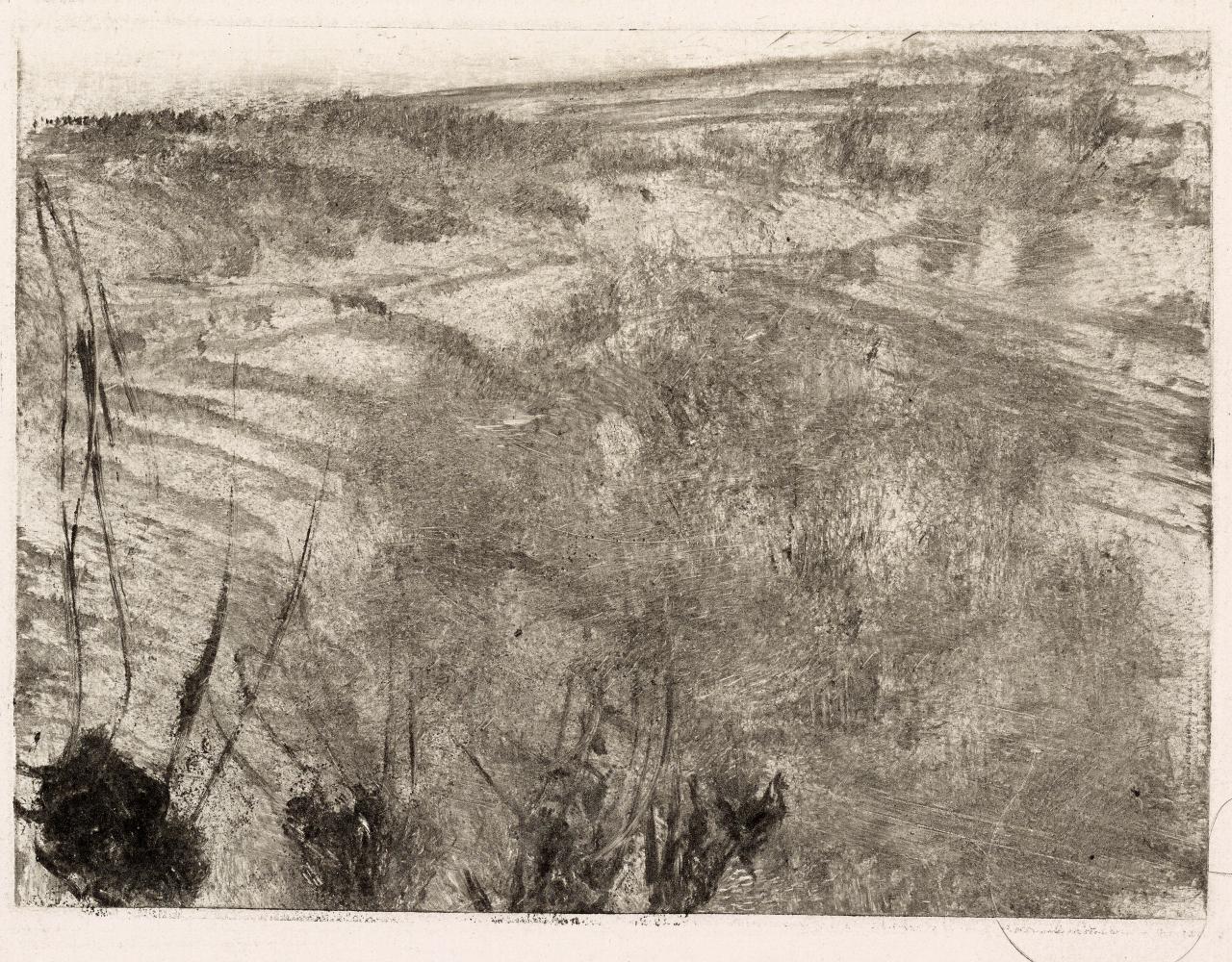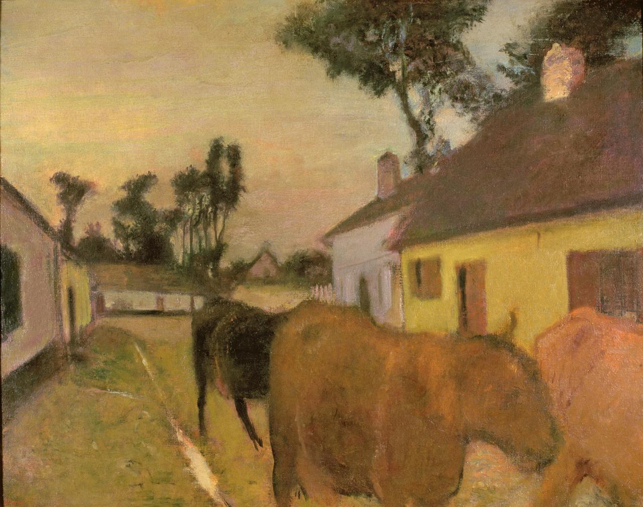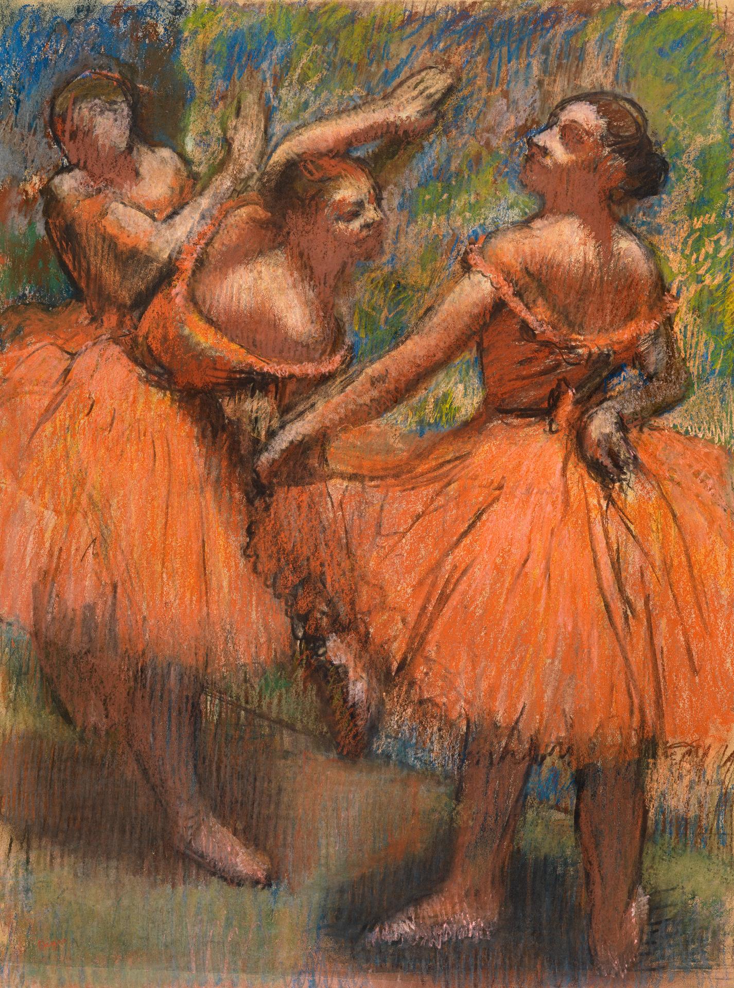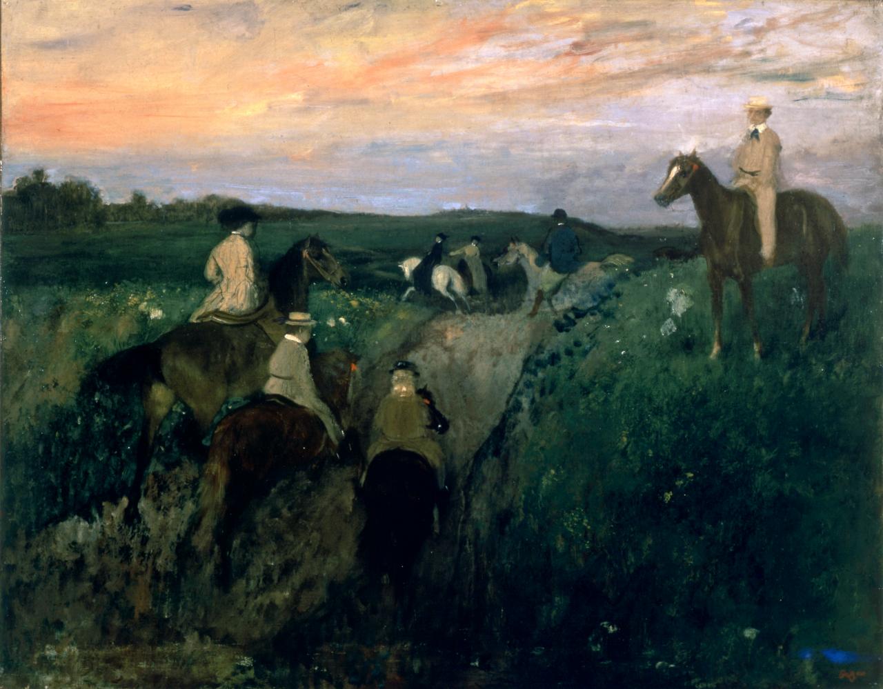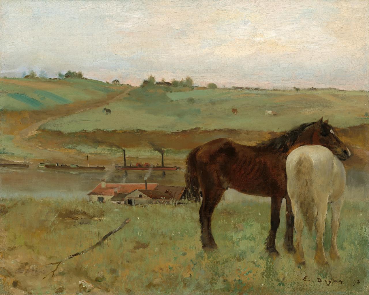 While the Impressionism of Claude Monet, Auguste Renoir, Camille Pissarro and Alfred Sisley manifested the charm of working en plein air (out of doors), Degas (who called himself a Realist rather than an Impressionist) preferred to work in the studio and to study his models by artificial light. He was drawn to the effects brought about by lamplight, oil lamps and stage footlights rather than those of the sun and clouds. His Impressionist colleagues were primarily – and often solely – painters, but Degas was first and foremost a draughtsman, working with pencil, chalk, charcoal, gouache, watercolour and pastel. He reinvented the monotype which, along with printmaking and later photography, permitted him to make admirable bodies of work in black and white. In the 1890s, however, he gave himself over to what he called ‘an orgy of colour’. He railed against those who set up their easels out of doors and yet created, in 1869 and again in around 1892, an incomparable group of landscape compositions.