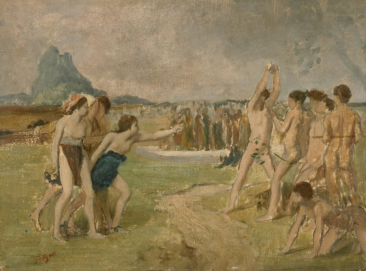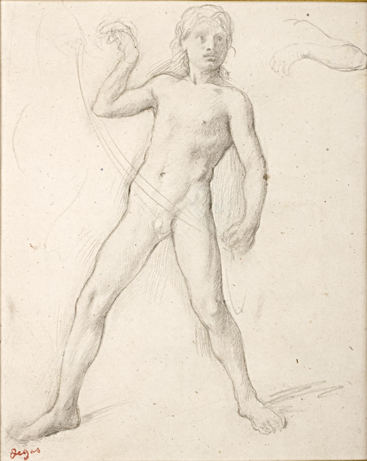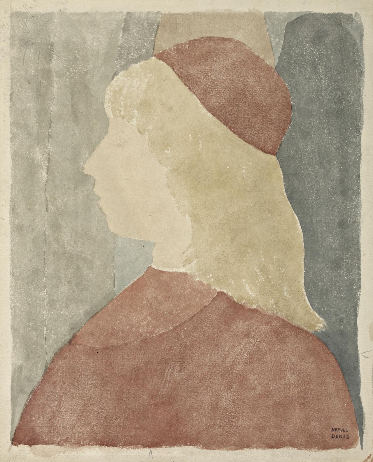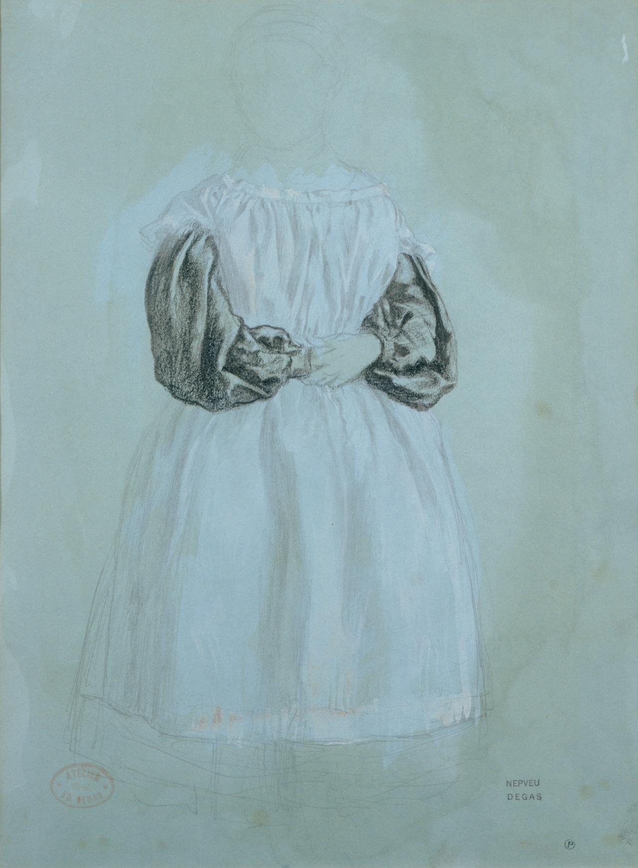 When Edgar was eleven he was enrolled in the Lycée Louis-le-Grand, a school for children of the upwardly mobile professional classes. There he learned Ancient Greek and Latin and also mastered the classics of French literature. On weekends his father regularly took the teenage Degas to visit distinguished private art collections across Paris. Despite his father’s wishes that he study law, after graduating Degas was allowed to take private art lessons and in April 1855 he enrolled in formal classes at the École des Beaux-Arts (although he never completed his studies there). An introduction to the revered artist Jean-Auguste-Dominique Ingres at this time had a formative influence upon his commitment to both drawing and portraiture. Aside from himself, Degas’s first models were his siblings and other family members.