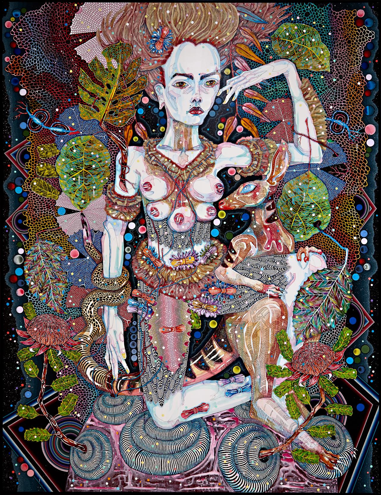 The NGV presents a major solo exhibition of one of Australia’s most popular artists, Del Kathryn Barton. Del Kathryn Barton: The Highway is a Disco reveals the artist’s imaginative and deeply sensuous world, where ornately decorated species – both human and animal – are rendered in seductive line and colour. Del Kathryn Barton: The Highway is a Disco is a survey of new and recent work by the two times Archibald Portrait Prize winner that reveals the breadth of Barton’s practice. Featuring comprehensive displays of recent paintings and drawings for which she is arguably best known, the exhibition also includes collage, sculpture, textiles and film, all drawn together by the artist’s exuberant and psychedelic aesthetic.