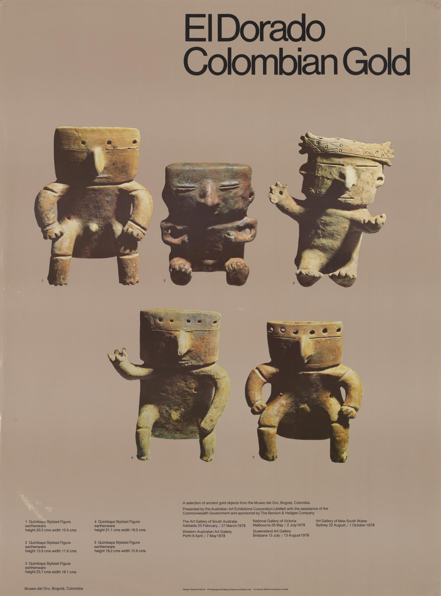 The Australian Art Exhibitions Corporation Limited, in conjunction with the Museo del Oro, Bogota, Colombia, presents and exhibition of 200 gold objects and 20 ceramics and stone pieces.