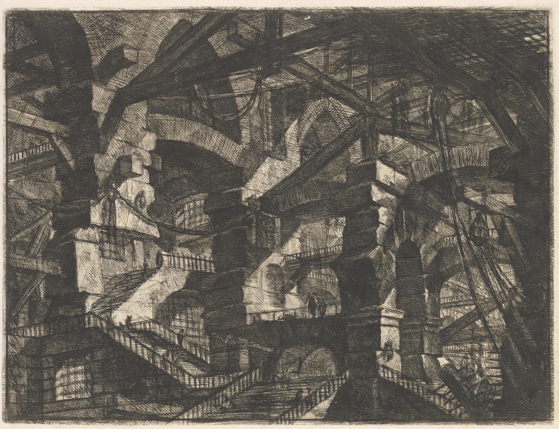 The breathtaking originality of Giovanni Battista Piranesi’s dramatic series of etchings, the Imaginary Prisons (Carceri d’invenzione), has remained a source of inspiration and fascination for artists, writers and architects since they were first published in Rome in the mid-eighteenth century. As the title of the series suggests, the prints represent views of imaginary prisons, depicted as vast yet claustrophobic environments populated by tiny figures. Piranesi’s innovative approach to the medium of etching is matched by his formal investigations into the representation of pictorial space, resulting in compositions that revel in ambiguity. Returning to the series a decade later Piranesi substantially reworked the images, transforming the loose, lightly etched prints of the first edition into darker images full of shadows, torture instruments and prisoners.