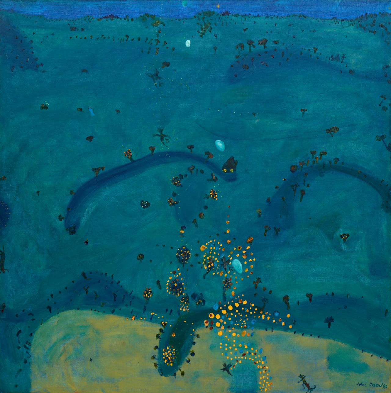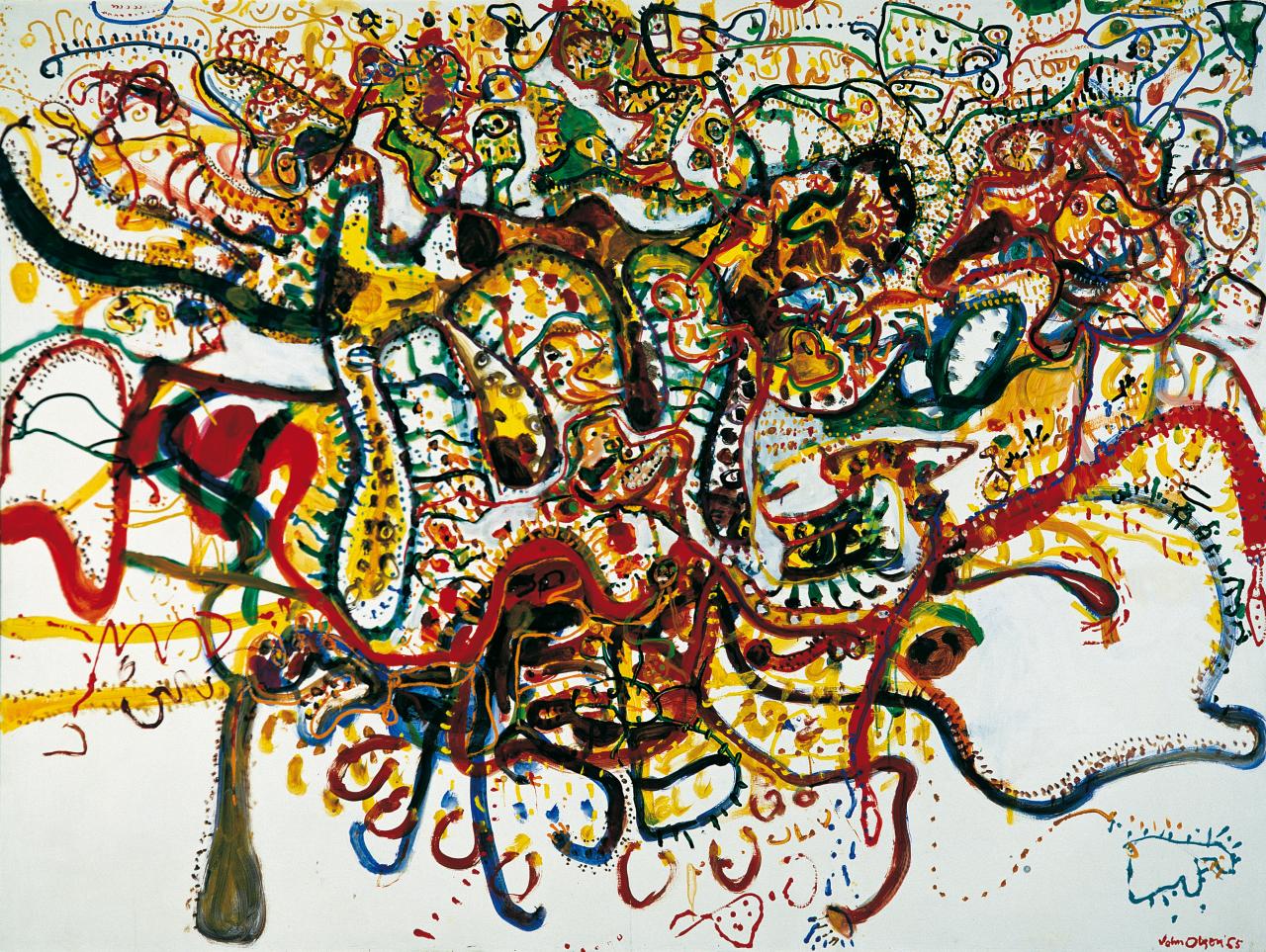 John Olsen is one of Australia’s greatest living artists. Born in Newcastle NSW in 1928, Olsen is well known for his energetic and distinctive painting style and in particular for his lyrical depiction of the landscape. He is a major figure in the story of Australian art and his unique and sensual pictorial language presents a very personal view of the world.