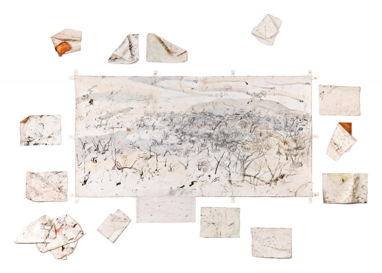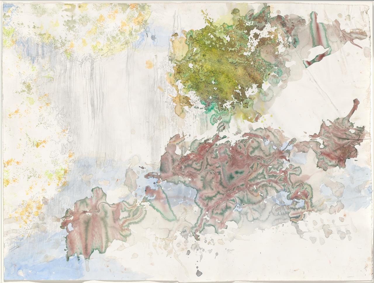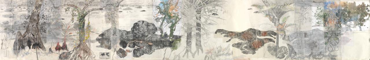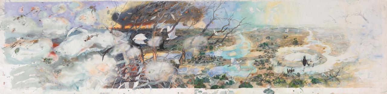 Over the past four years John Wolseley has explored the wetlands of Australia in a major series of new works commissioned by Sir Roderick Carnegie. In this series of monumentally-scaled works on paper, the artist celebrates the variety and unique nature of water forms in Australia. The mangrove swamps in Roebuck Bay (W.A.), the flood plains of Garanalli in the Northern Territory, the Finke River in the Simpson Desert and the sphagnum swamps of Skullbone Plains in Tasmania are just some of the sites detailed in these impressive works. The different geographical features and unique plant and animal forms of these wetlands are depicted in the finely worked drawing and rich watercolour washes that characterise Wolseley’s work. Many also combine collage elements and markings made “in collaboration” with the natural environment. Through this way of working, which includes burying works and drawing with carbonized wood found in the bush, the artist subverts traditional approaches to the depiction of landscape. These works celebrate the beauty of the Australian wilderness and encourage an understanding of the significance and environmental fragility of these remote and little-known sites.