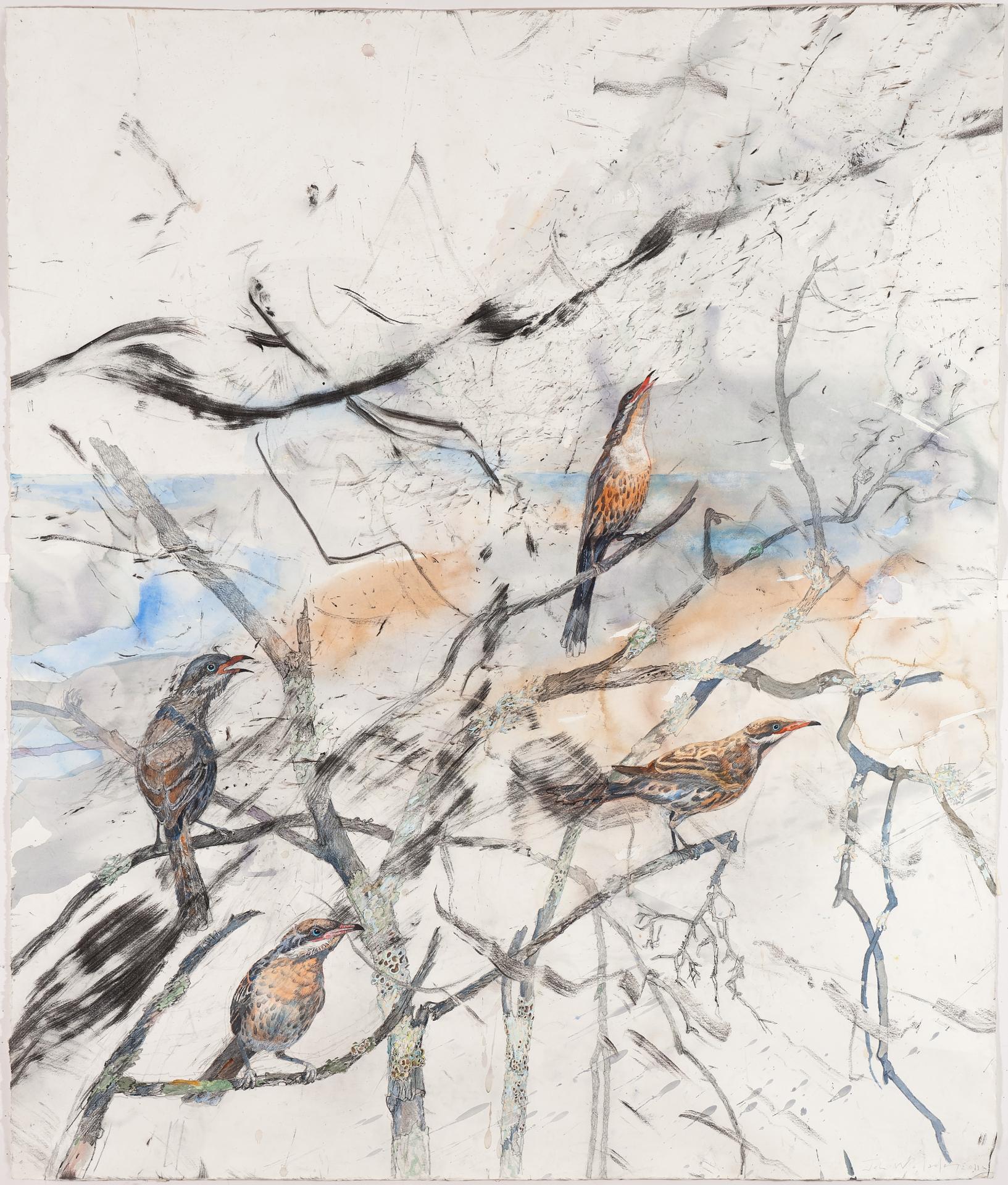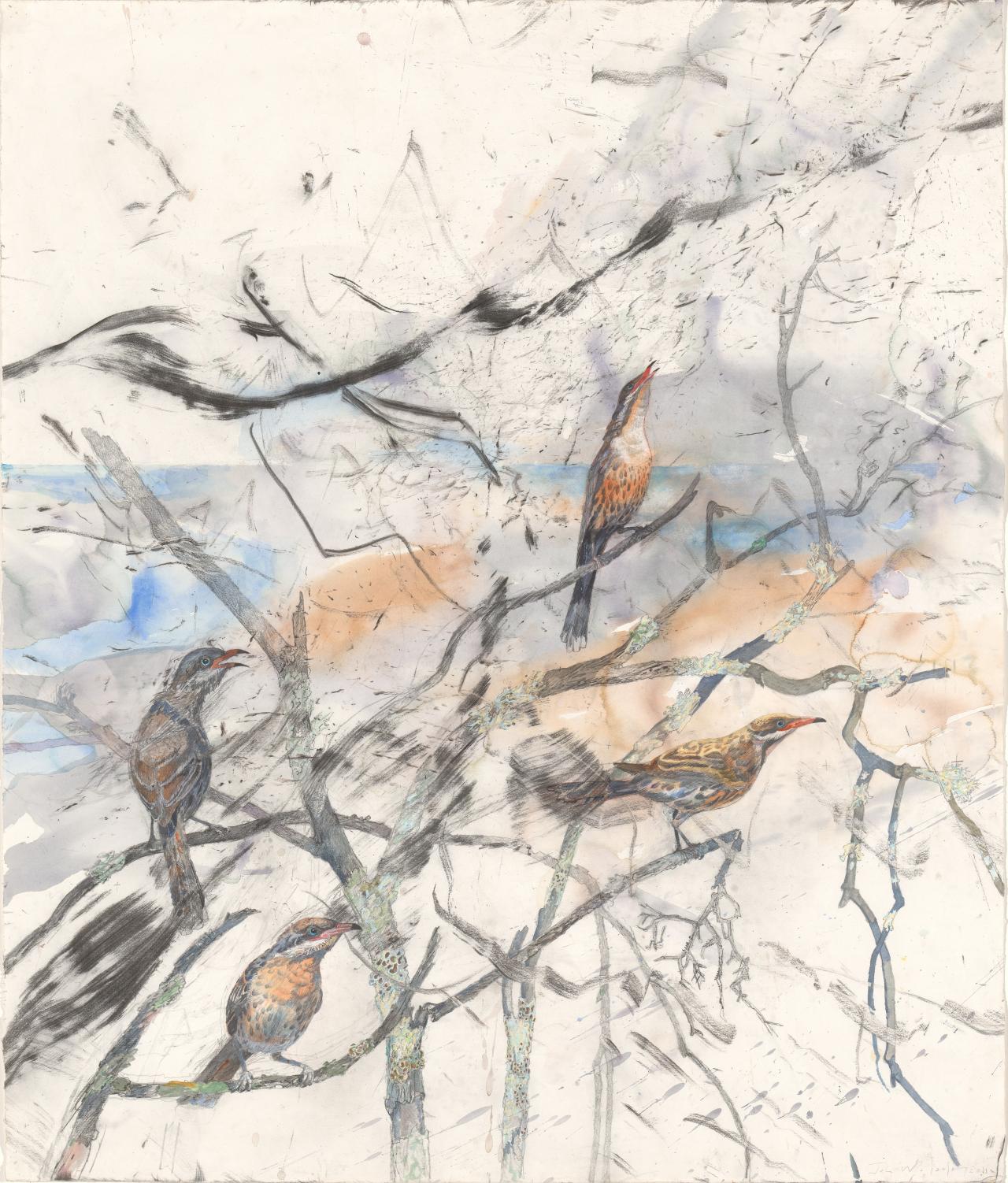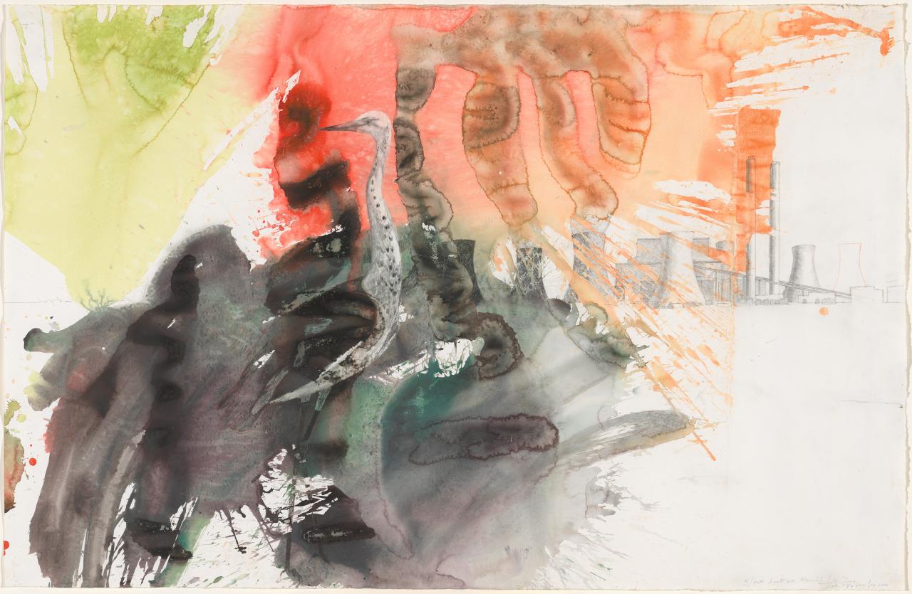 Over the past four years John Wolseley has explored the wetlands of Australia in a major series of new works commissioned by Sir Roderick Carnegie. In this series of monumentally-scaled works on paper, the artist celebrates the variety and unique nature of water forms in Australia. The mangrove swamps in Roebuck Bay (W.A.), the flood plains of Garanalli in the Northern Territory, the Finke River in the Simpson Desert and the sphagnum swamps of Skullbone Plains in Tasmania are just some of the sites detailed in these impressive works. The different geographical features and unique plant and animal forms of these wetlands are depicted in the finely worked drawing and rich watercolour washes that characterise Wolseley’s work. Many also combine collage elements and markings made “in collaboration” with the natural environment. Through this way of working, which includes burying works and drawing with carbonized wood found in the bush, the artist subverts traditional approaches to the depiction of landscape. These works celebrate the beauty of the Australian wilderness and encourage an understanding of the significance and environmental fragility of these remote and little-known sites.