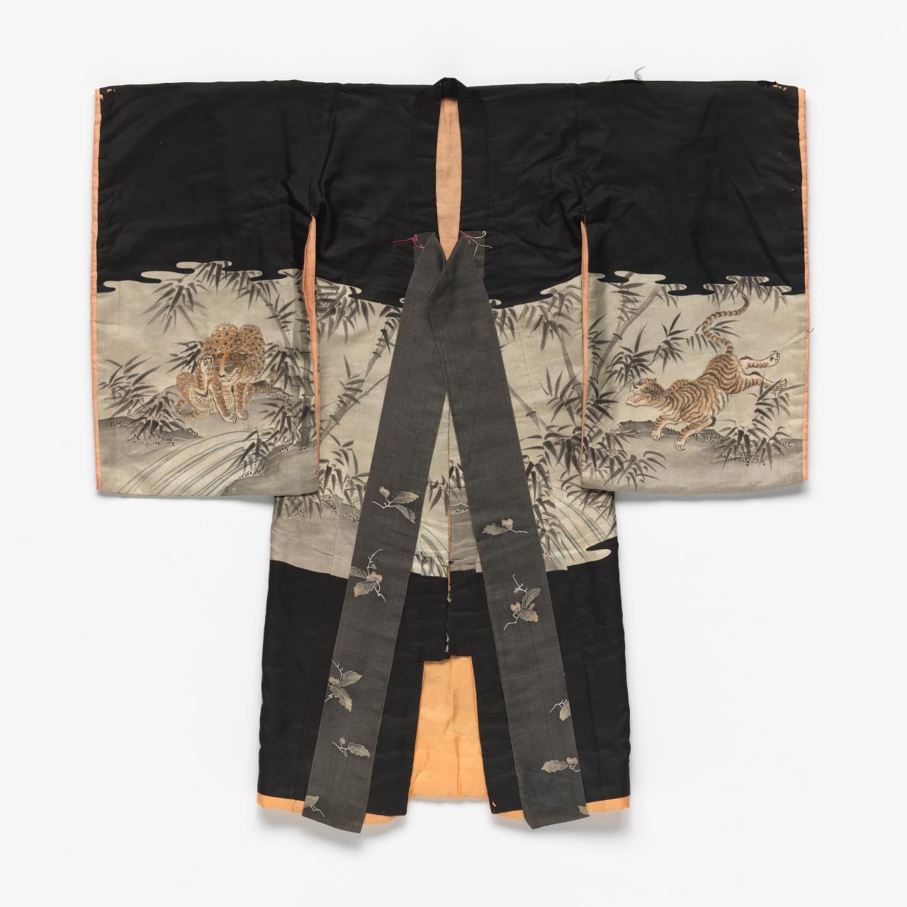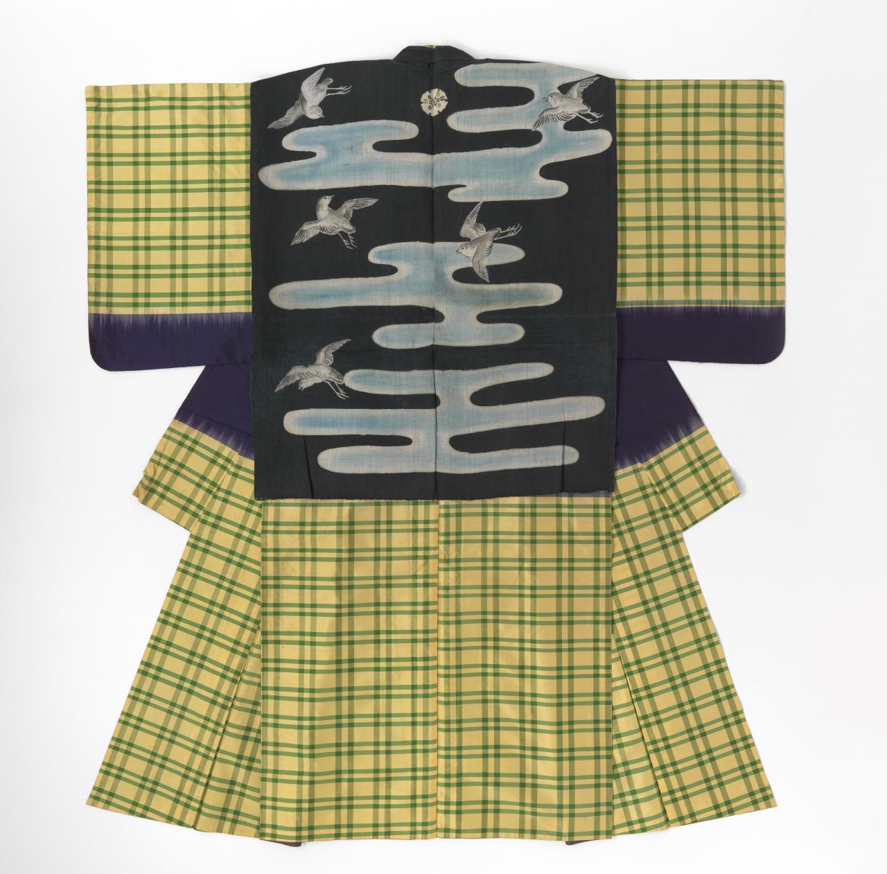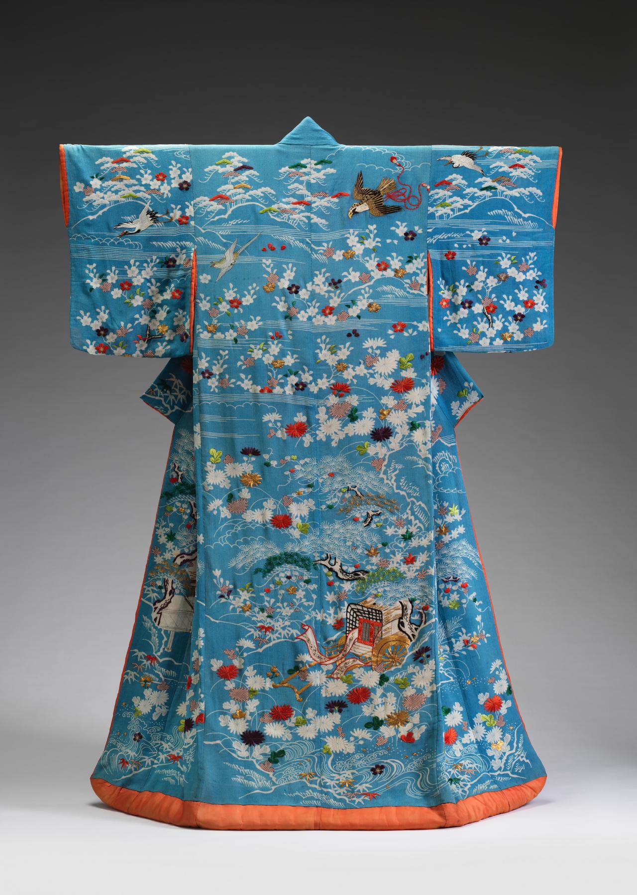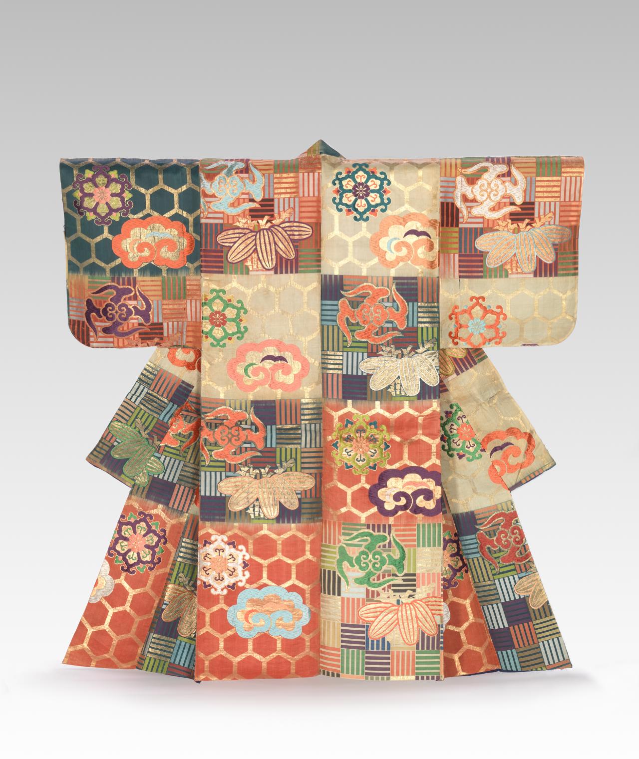 A combination of two Japanese characters (着物) literally meaning ‘thing to wear’, the term ‘kimono’ only came into common use in the nineteenth-century. Early styles of uniquely Japanese women’s court costume known as jūnihitoe (twelve-layer robe) developed during the Heian period (794–1185); however, the earliest forms of kimono that we know today were the inner kosode and outer uchikake worn by the aristocracy from the Kamakura period (1185–1333) onwards. The opulence of these styles remains preserved in Noh theatre costumes.