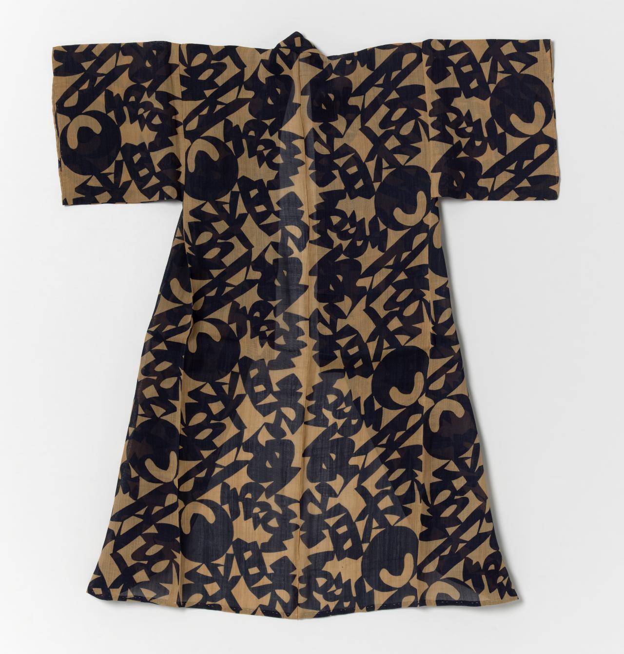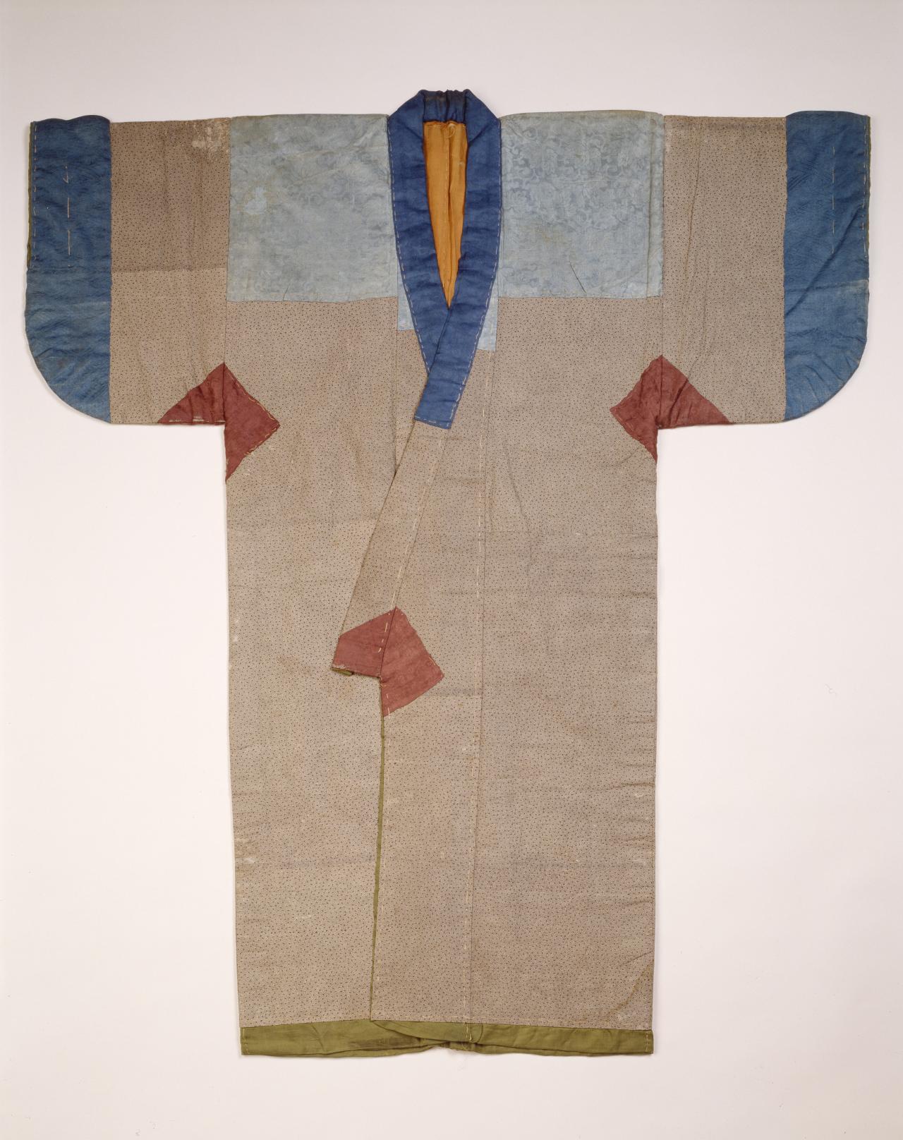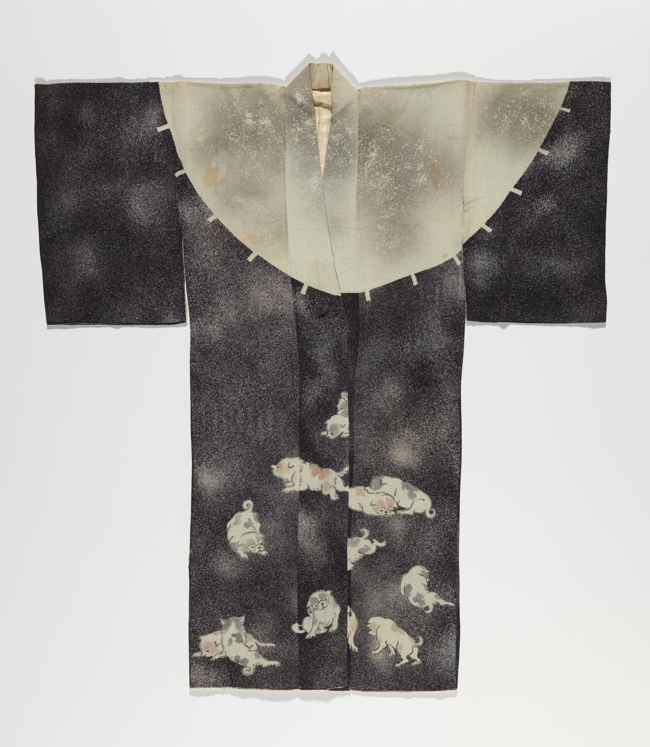 A combination of two Japanese characters (着物) literally meaning ‘thing to wear’, the term ‘kimono’ only came into common use in the nineteenth-century. Early styles of uniquely Japanese women’s court costume known as jūnihitoe (twelve-layer robe) developed during the Heian period (794–1185); however, the earliest forms of kimono that we know today were the inner kosode and outer uchikake worn by the aristocracy from the Kamakura period (1185–1333) onwards. The opulence of these styles remains preserved in Noh theatre costumes.