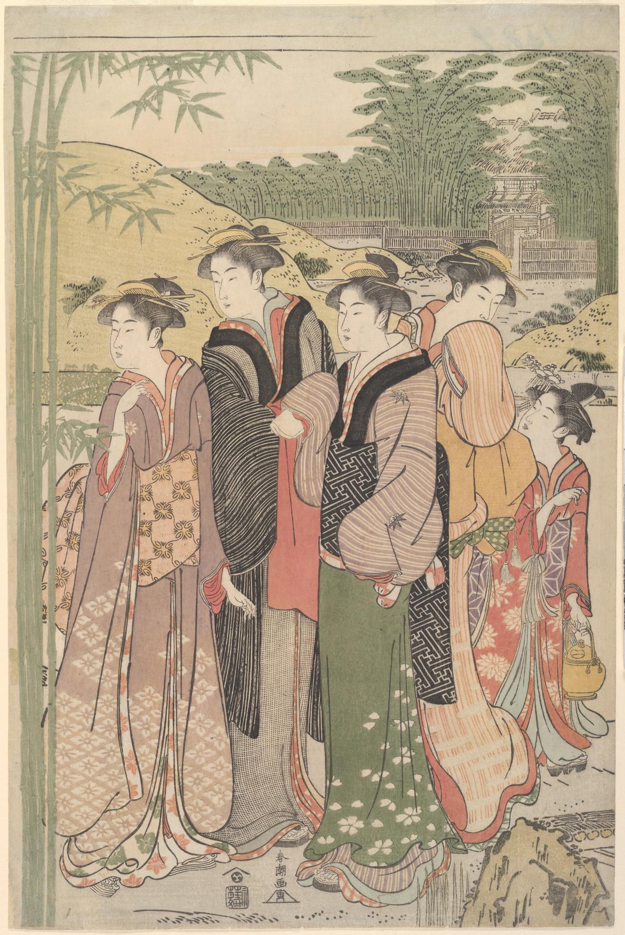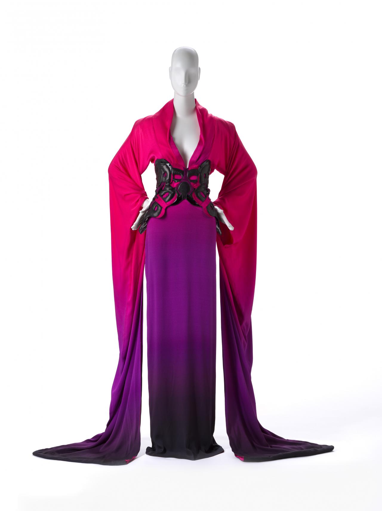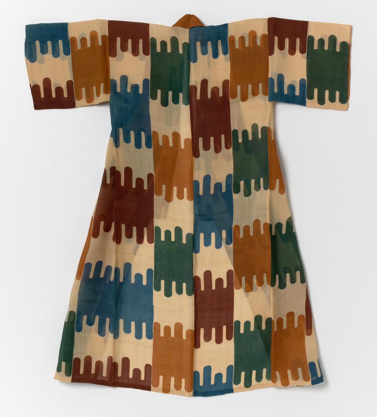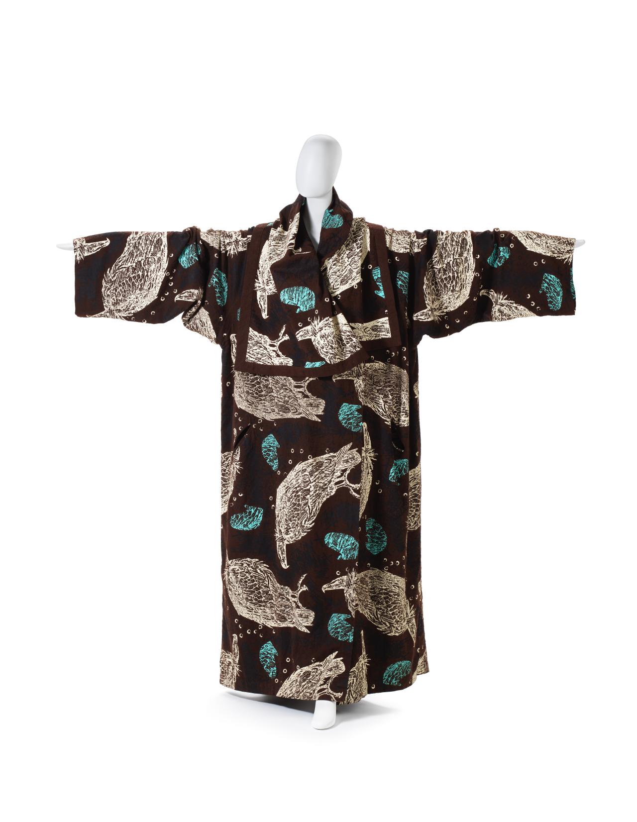 A combination of two Japanese characters (着物) literally meaning ‘thing to wear’, the term ‘kimono’ only came into common use in the nineteenth-century. Early styles of uniquely Japanese women’s court costume known as jūnihitoe (twelve-layer robe) developed during the Heian period (794–1185); however, the earliest forms of kimono that we know today were the inner kosode and outer uchikake worn by the aristocracy from the Kamakura period (1185–1333) onwards. The opulence of these styles remains preserved in Noh theatre costumes.