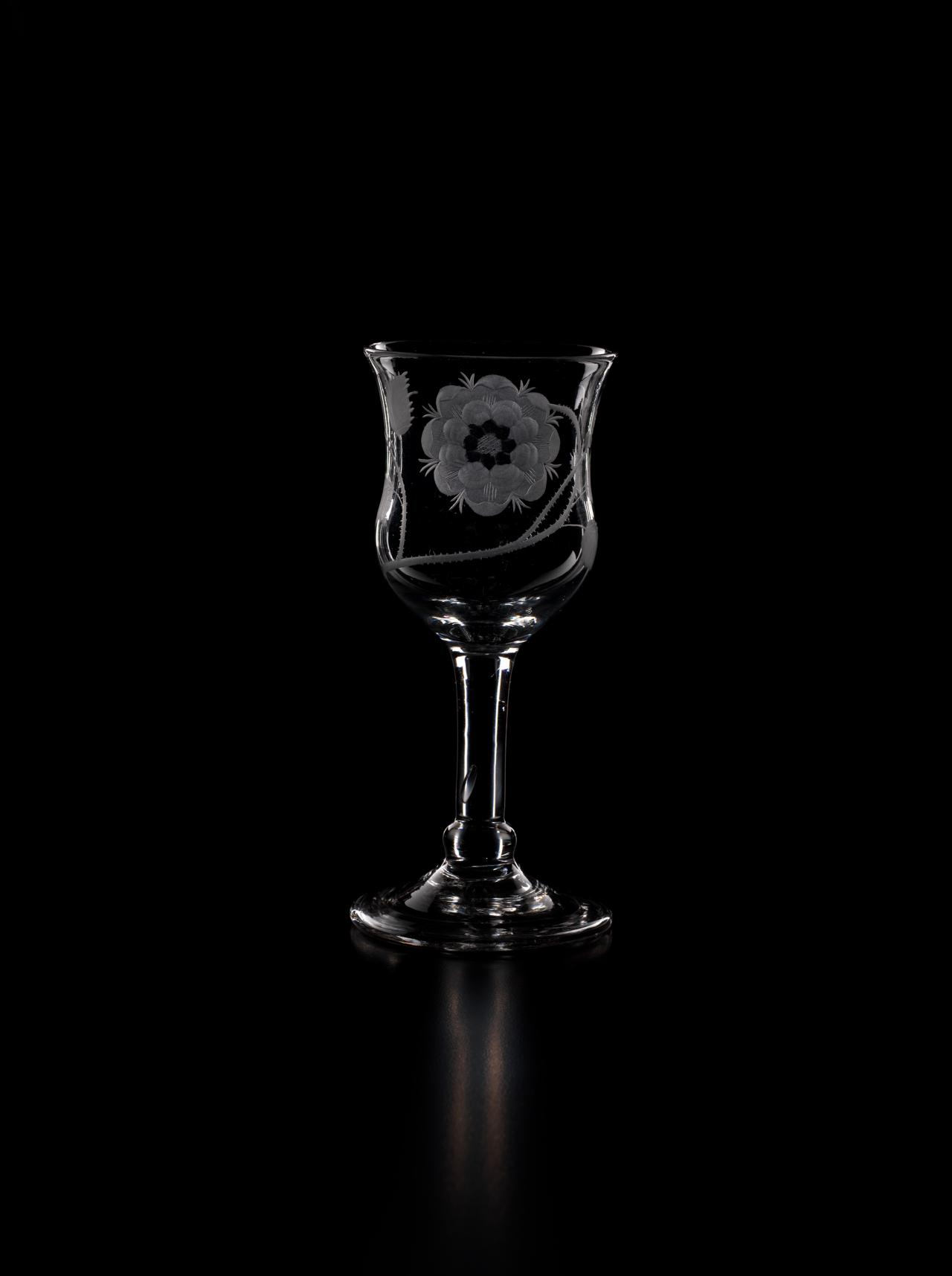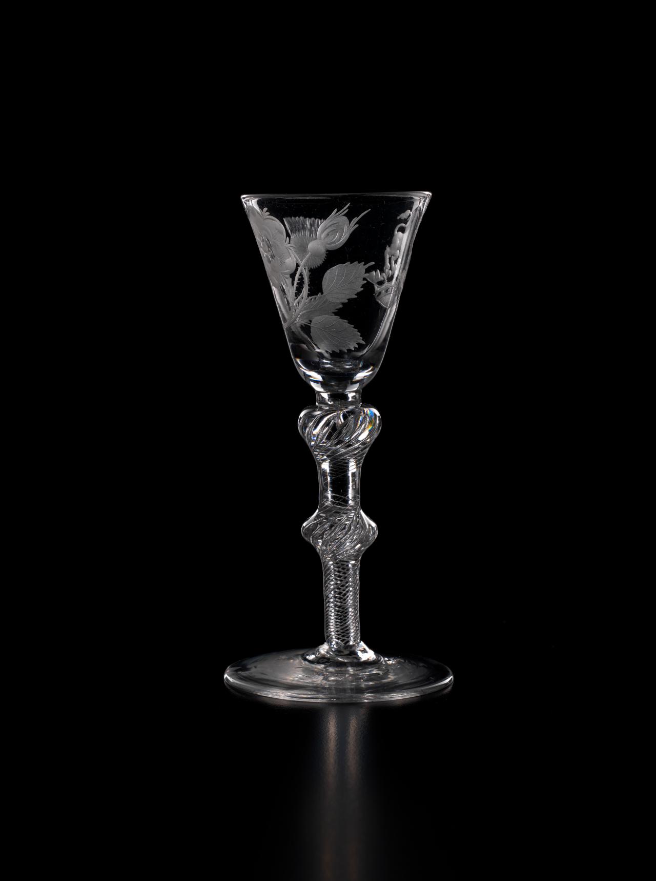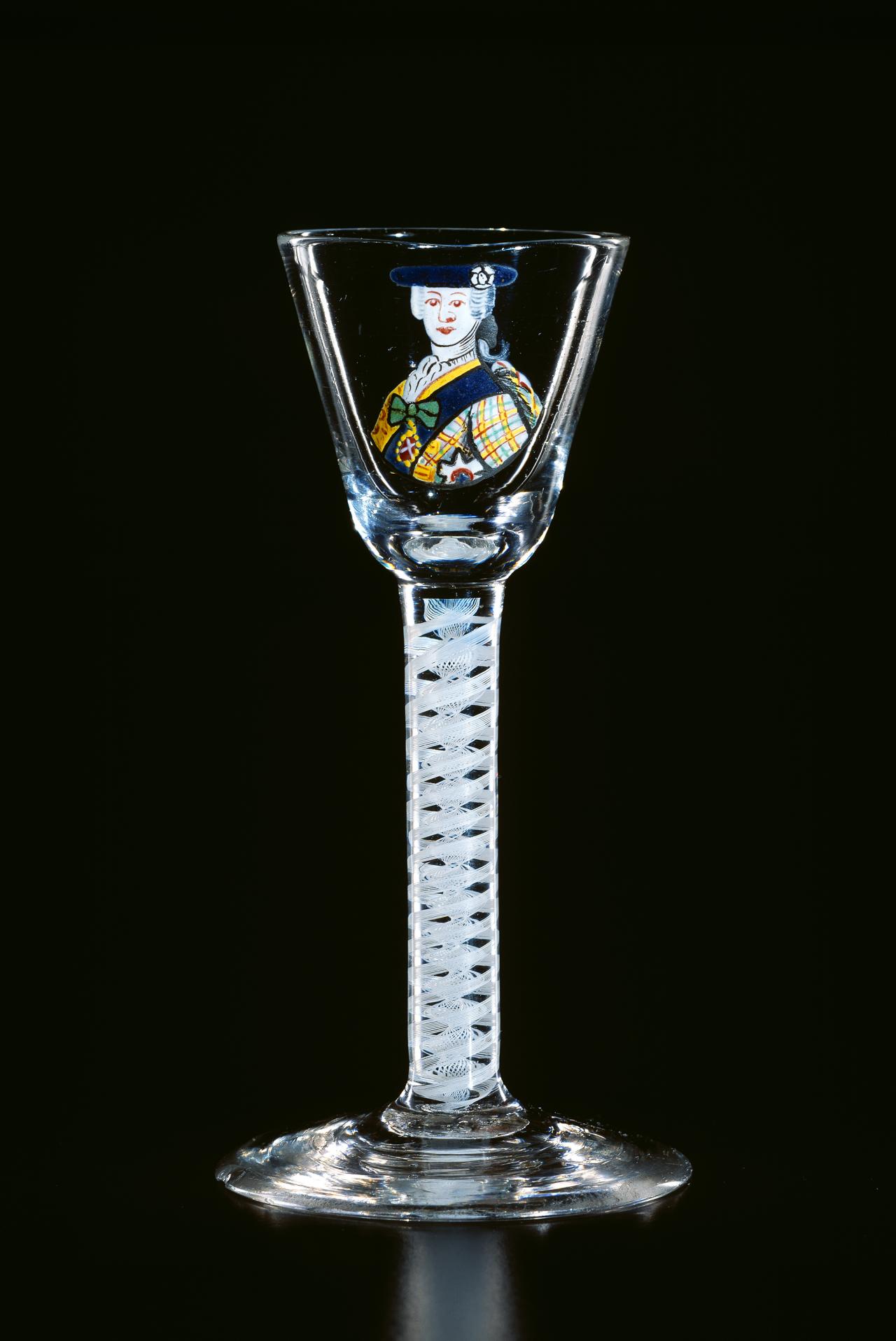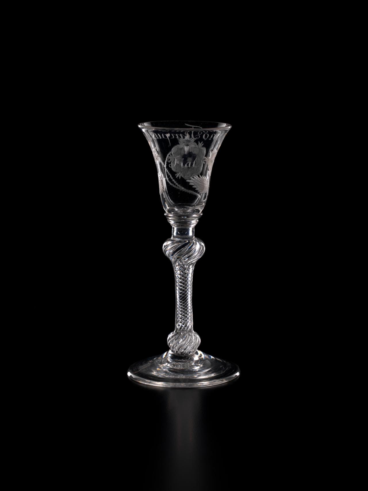 In 1688, James II, the Catholic King of England, Scotland and Ireland, was ousted by parliament in the Glorious Revolution and fled into exile in France. But he did not quietly relinquish his claim to the throne, and he immediately began plotting his return. So began a political and military struggle which would last nearly sixty years as the Stuart dynasty sought to reclaim their lost Kingdoms. The most famous event in this momentous struggle occurred in 1745 when James II’s grandson, Bonnie Prince Charlie, led an armed invasion of Scotland and England, a revolt which was put down at the bloody Battle of Culloden, but which almost met with success. Throughout the years of struggle in exile, the Stuarts continued to have many supporters in England and Scotland. Such support was, however, treasonous. So the Stuart supporters, or Jacobites, instituted, amongst other things, the practice of drinking toasts to their King “over the water” in glasses engraved with cryptic symbols which reflected their Stuart loyalties.