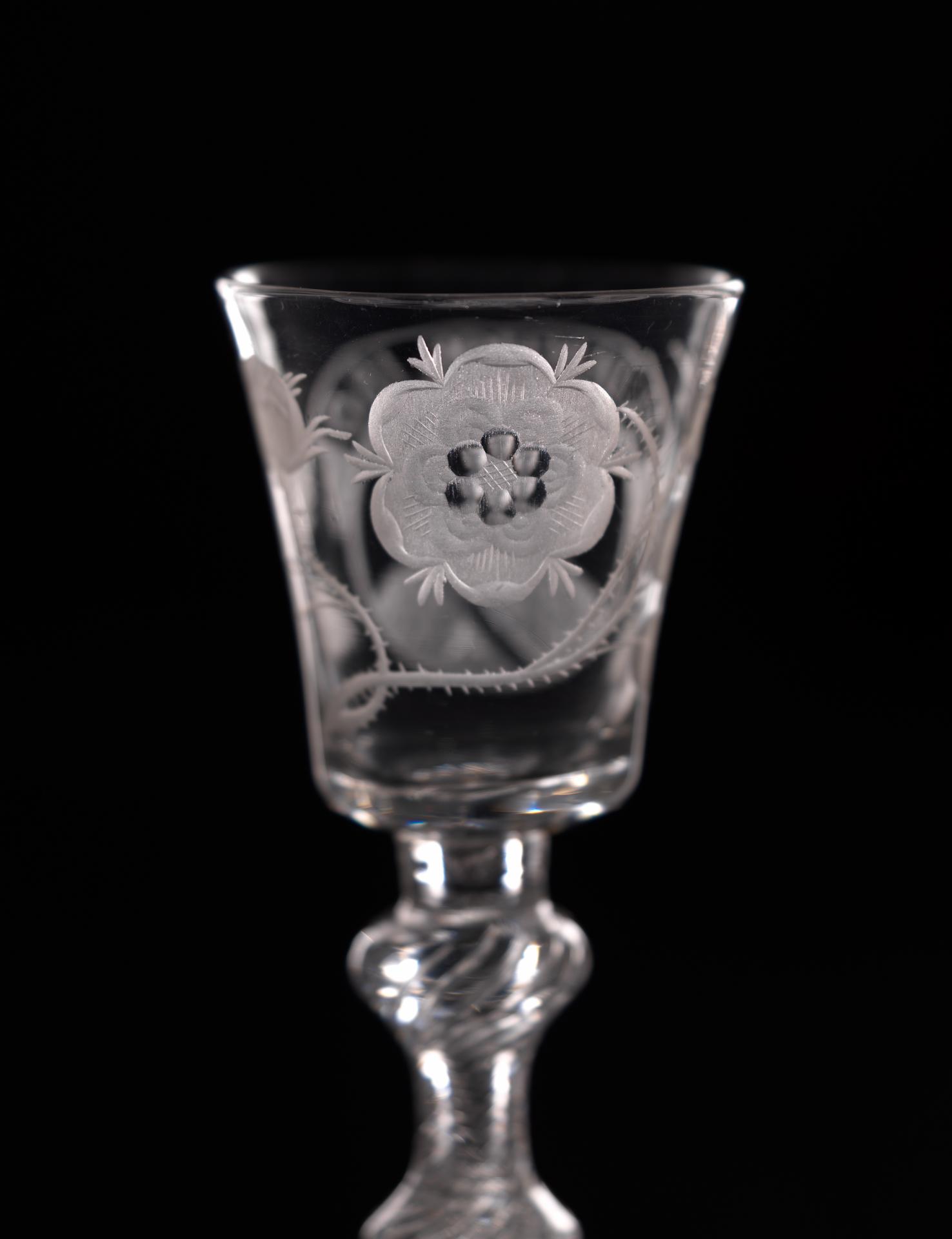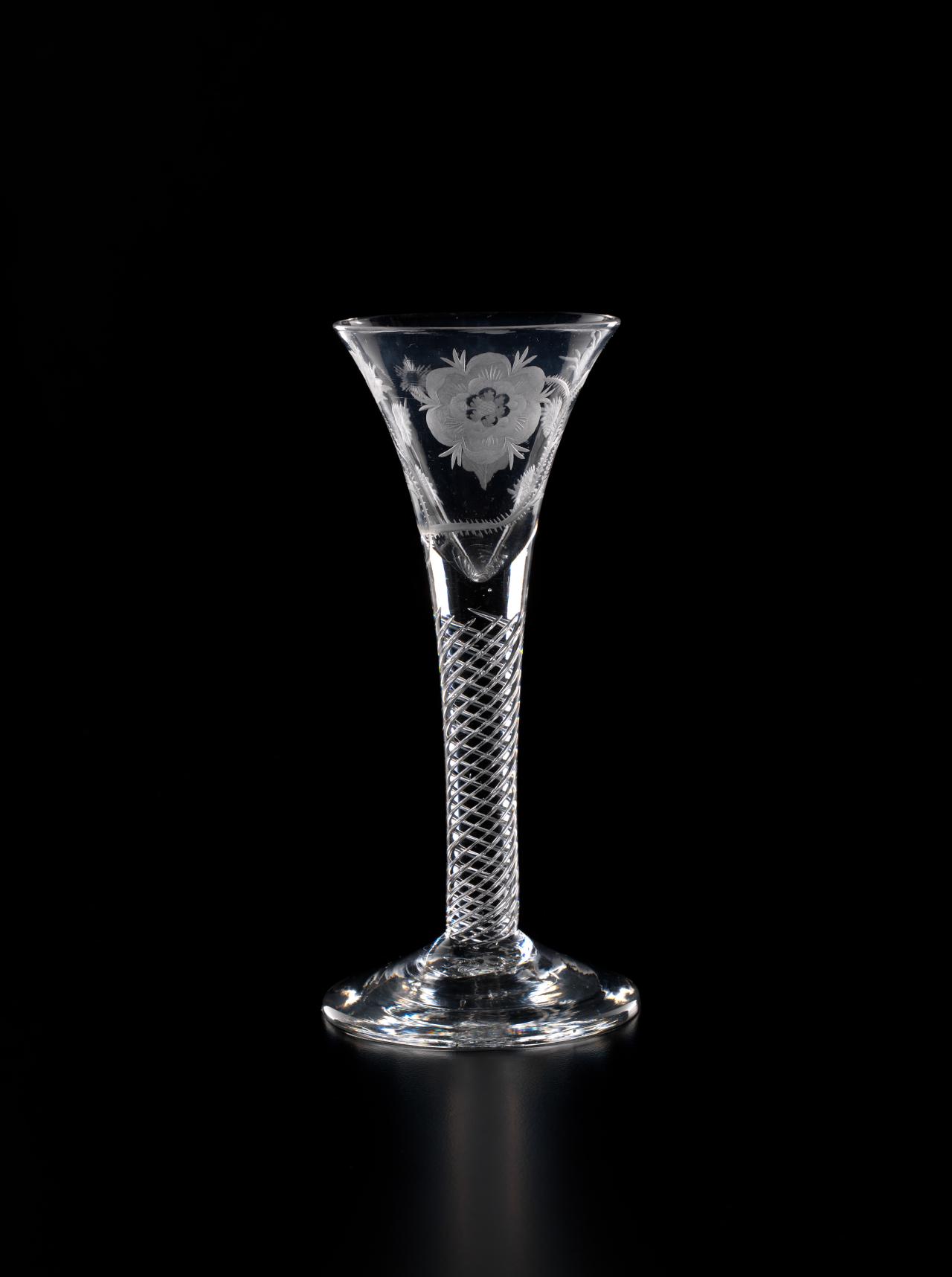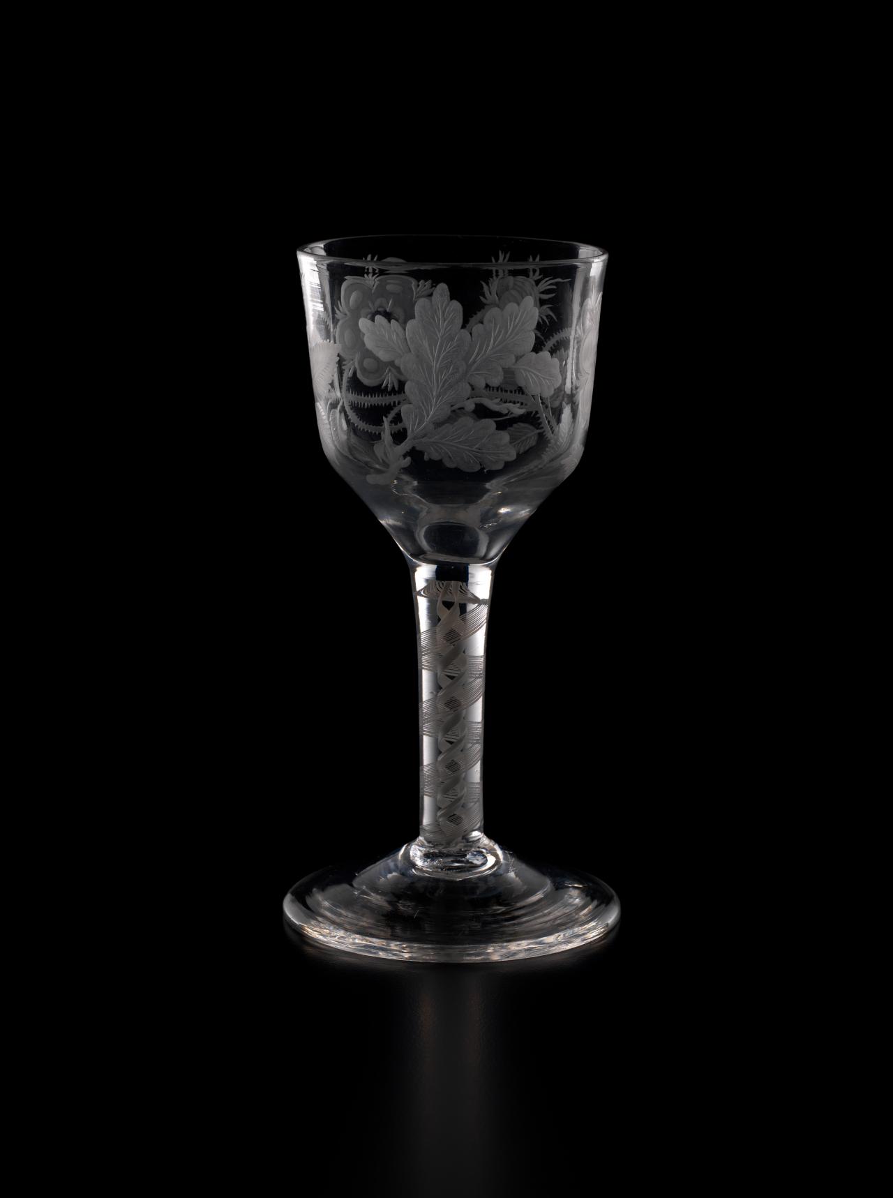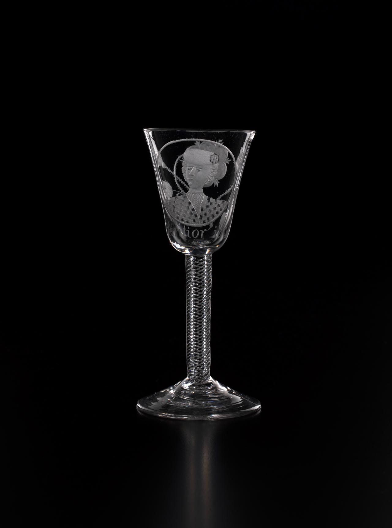 In 1688, James II, the Catholic King of England, Scotland and Ireland, was ousted by parliament in the Glorious Revolution and fled into exile in France. But he did not quietly relinquish his claim to the throne, and he immediately began plotting his return. So began a political and military struggle which would last nearly sixty years as the Stuart dynasty sought to reclaim their lost Kingdoms. The most famous event in this momentous struggle occurred in 1745 when James II’s grandson, Bonnie Prince Charlie, led an armed invasion of Scotland and England, a revolt which was put down at the bloody Battle of Culloden, but which almost met with success. Throughout the years of struggle in exile, the Stuarts continued to have many supporters in England and Scotland. Such support was, however, treasonous. So the Stuart supporters, or Jacobites, instituted, amongst other things, the practice of drinking toasts to their King “over the water” in glasses engraved with cryptic symbols which reflected their Stuart loyalties.