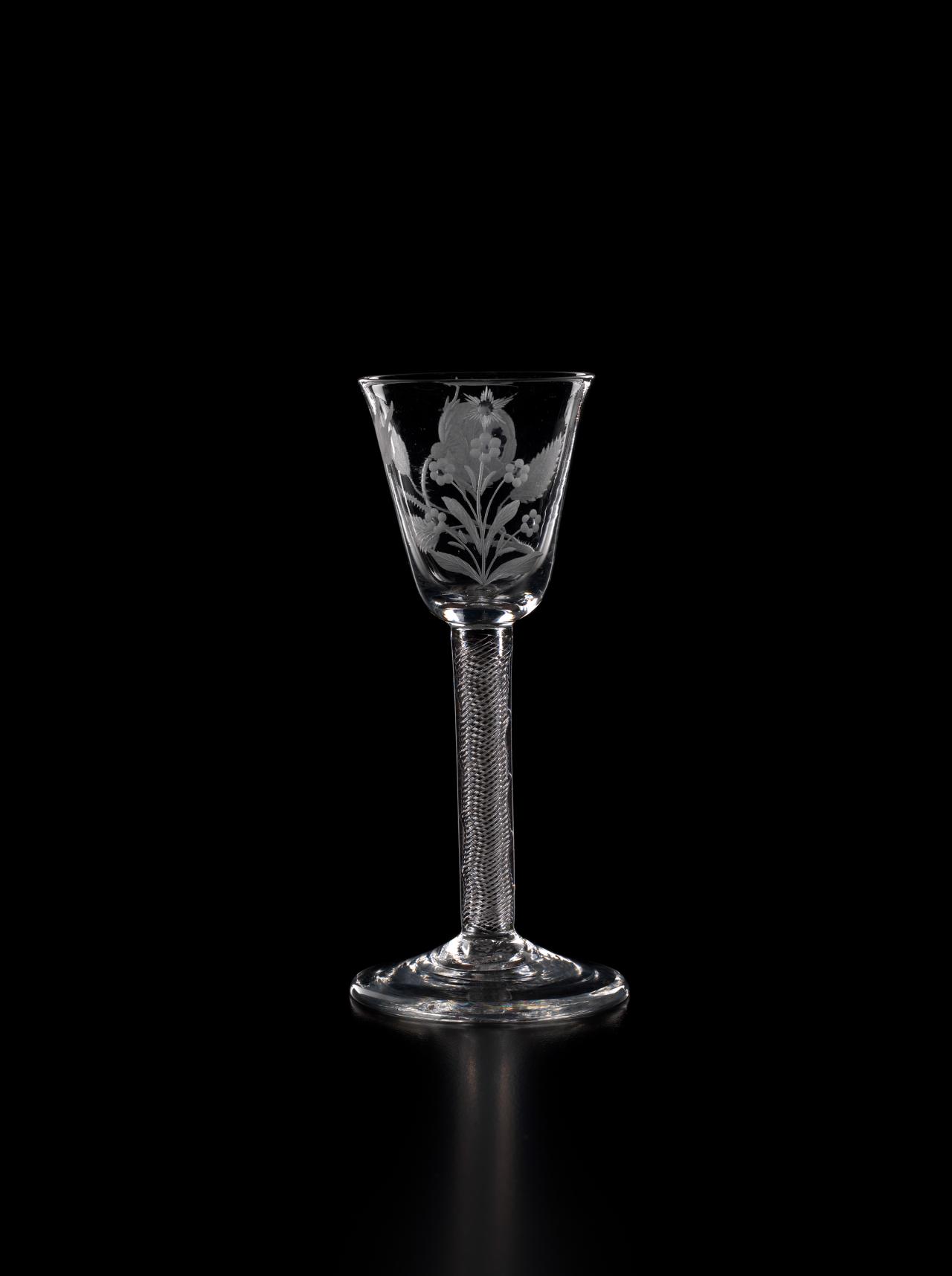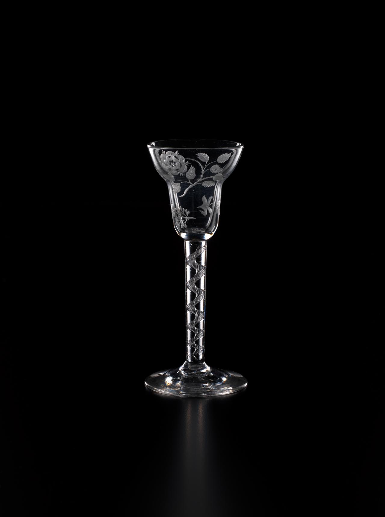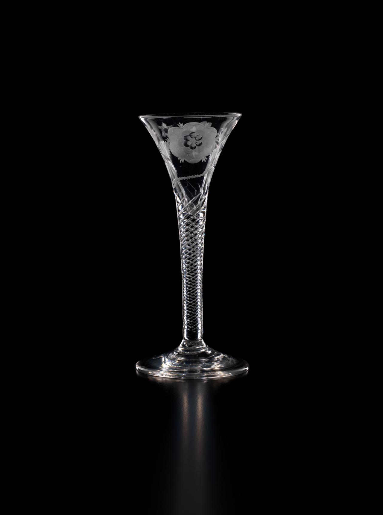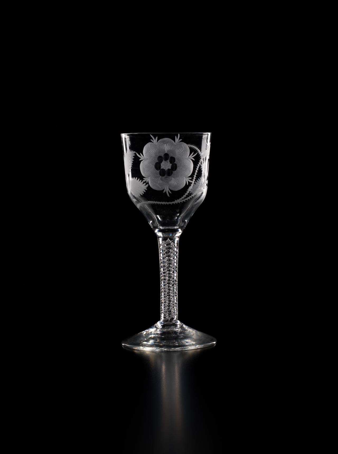 In 1688, James II, the Catholic King of England, Scotland and Ireland, was ousted by parliament in the Glorious Revolution and fled into exile in France. But he did not quietly relinquish his claim to the throne, and he immediately began plotting his return. So began a political and military struggle which would last nearly sixty years as the Stuart dynasty sought to reclaim their lost Kingdoms. The most famous event in this momentous struggle occurred in 1745 when James II’s grandson, Bonnie Prince Charlie, led an armed invasion of Scotland and England, a revolt which was put down at the bloody Battle of Culloden, but which almost met with success. Throughout the years of struggle in exile, the Stuarts continued to have many supporters in England and Scotland. Such support was, however, treasonous. So the Stuart supporters, or Jacobites, instituted, amongst other things, the practice of drinking toasts to their King “over the water” in glasses engraved with cryptic symbols which reflected their Stuart loyalties.