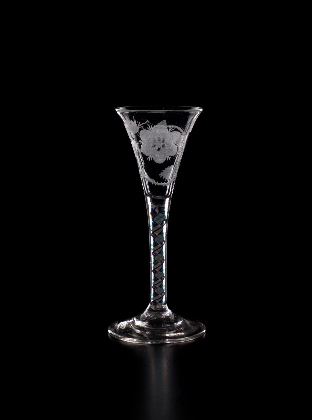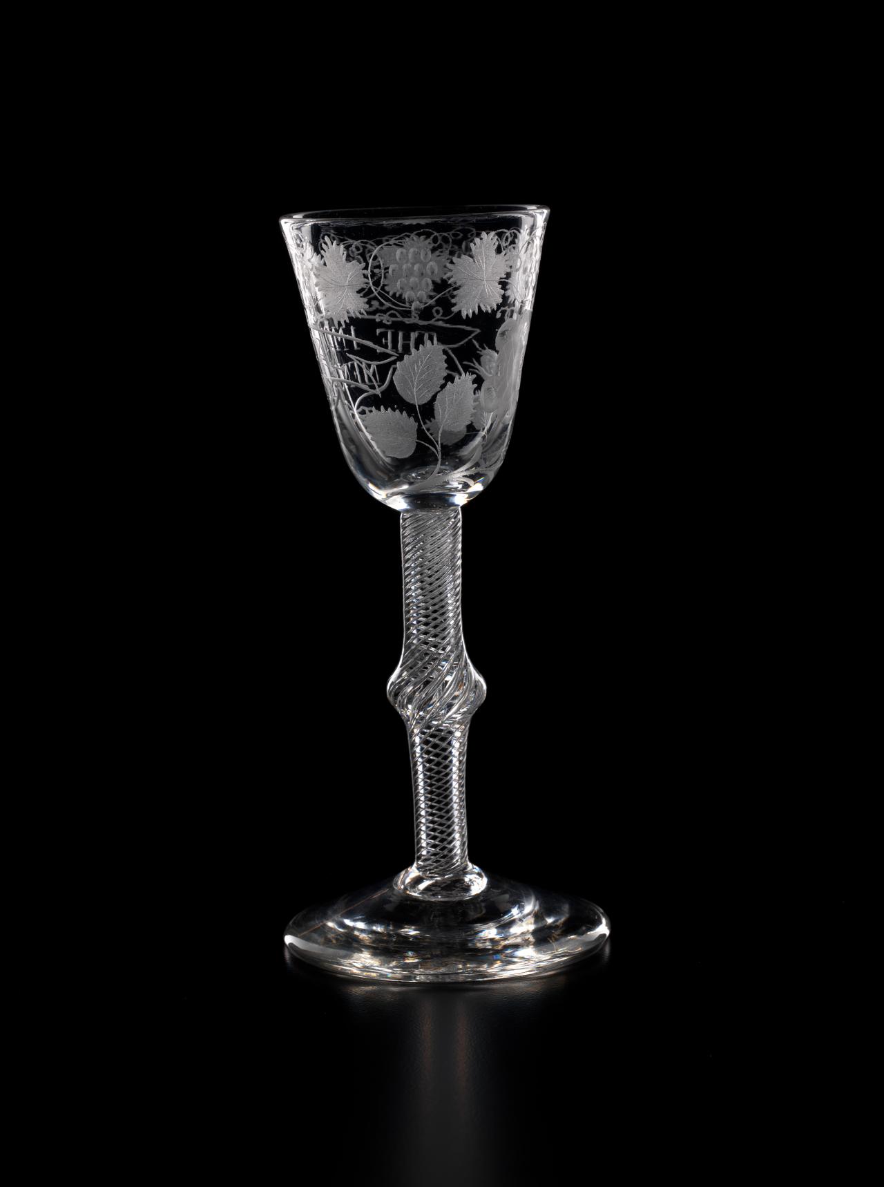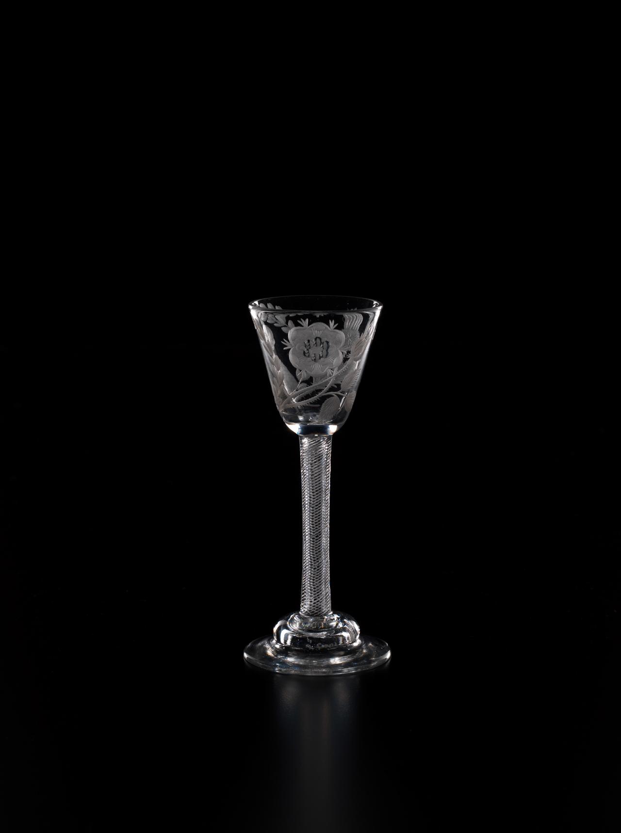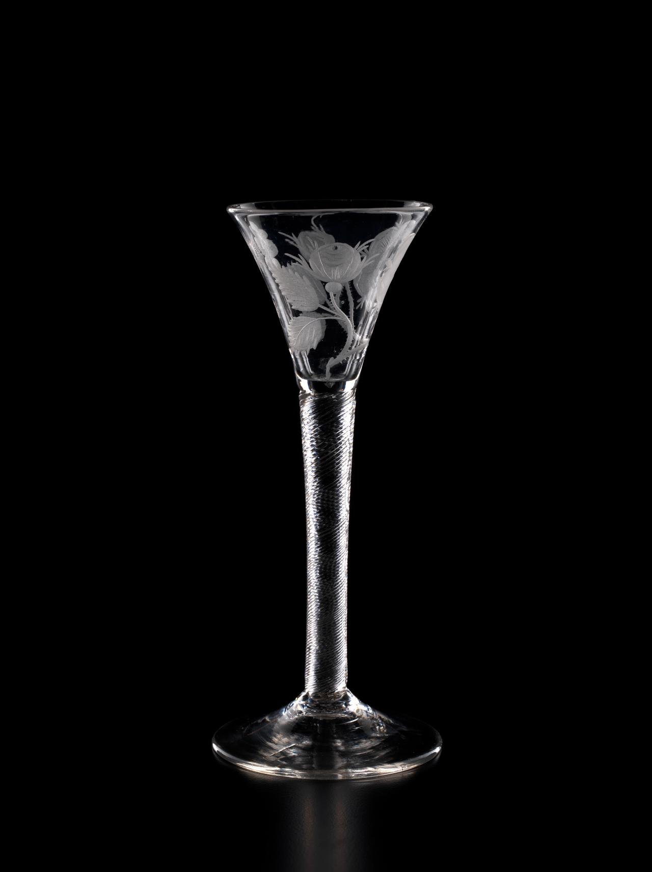 In 1688, James II, the Catholic King of England, Scotland and Ireland, was ousted by parliament in the Glorious Revolution and fled into exile in France. But he did not quietly relinquish his claim to the throne, and he immediately began plotting his return. So began a political and military struggle which would last nearly sixty years as the Stuart dynasty sought to reclaim their lost Kingdoms. The most famous event in this momentous struggle occurred in 1745 when James II’s grandson, Bonnie Prince Charlie, led an armed invasion of Scotland and England, a revolt which was put down at the bloody Battle of Culloden, but which almost met with success. Throughout the years of struggle in exile, the Stuarts continued to have many supporters in England and Scotland. Such support was, however, treasonous. So the Stuart supporters, or Jacobites, instituted, amongst other things, the practice of drinking toasts to their King “over the water” in glasses engraved with cryptic symbols which reflected their Stuart loyalties.