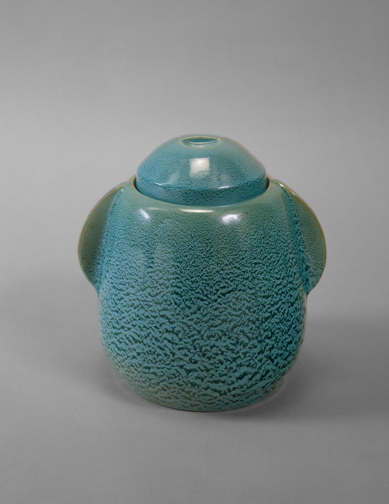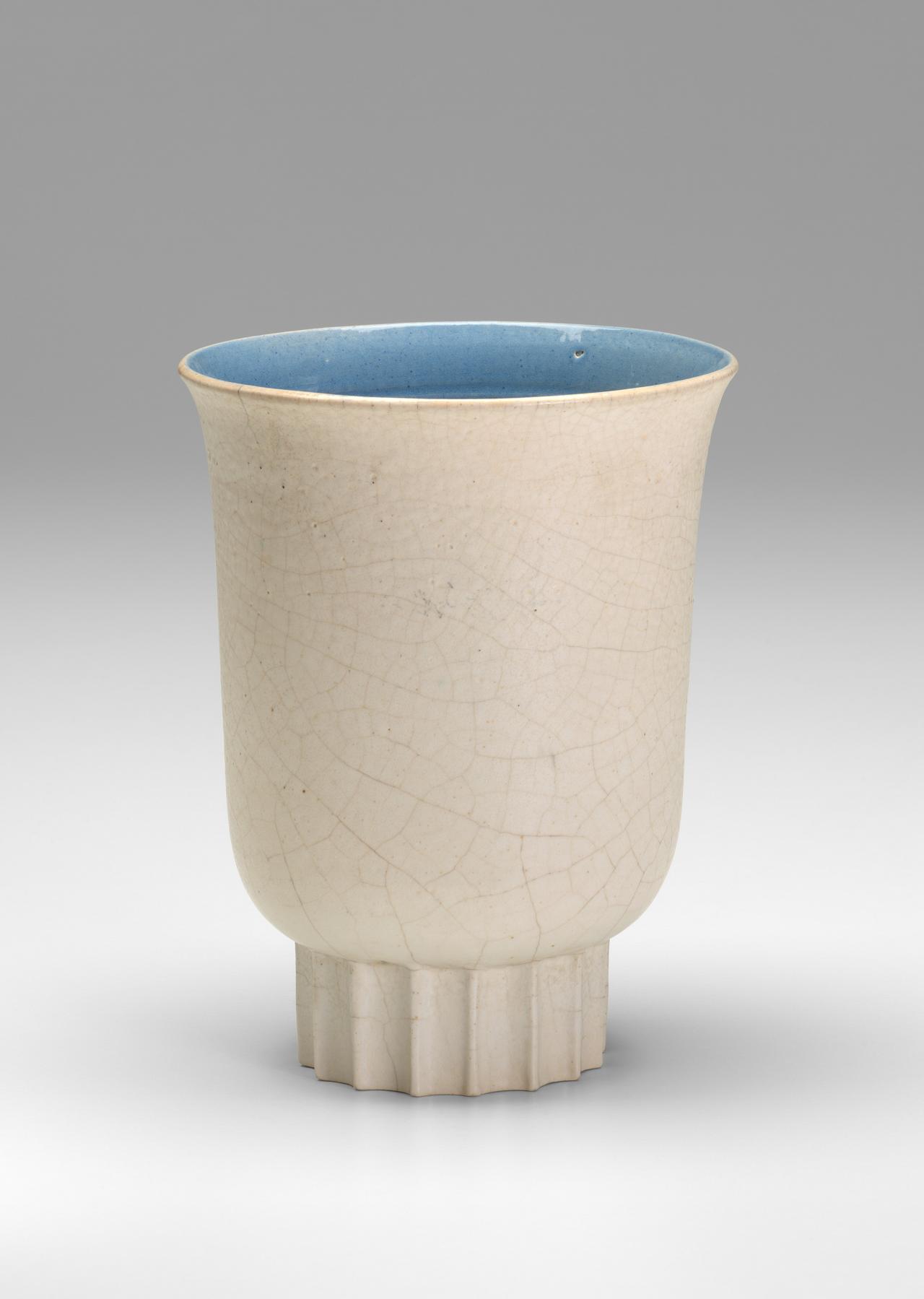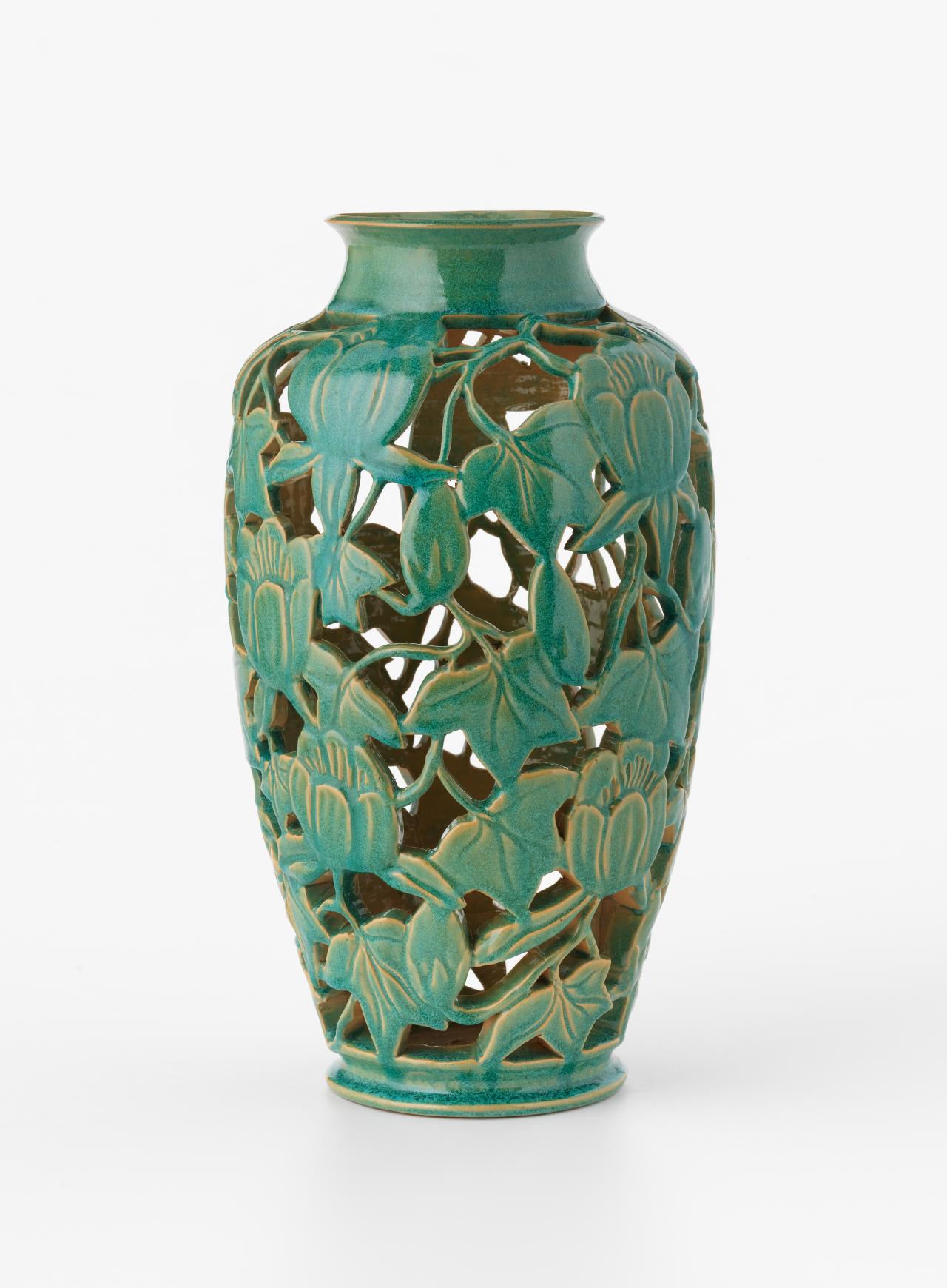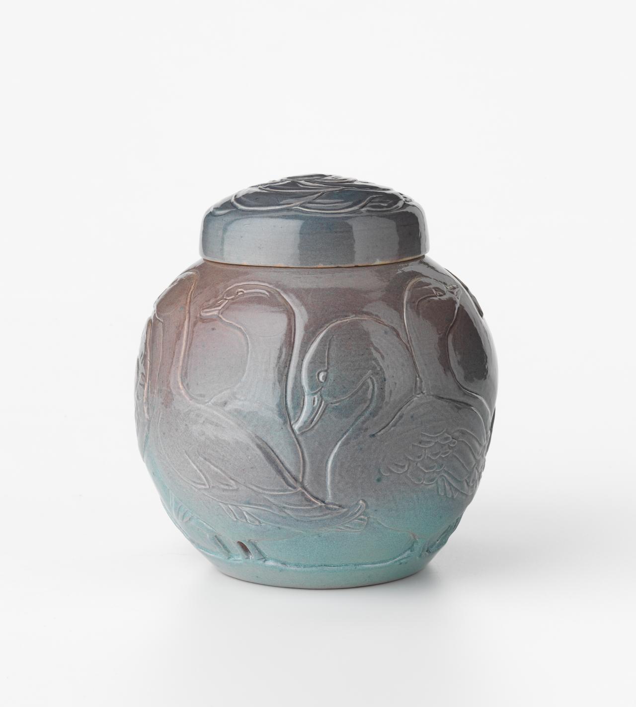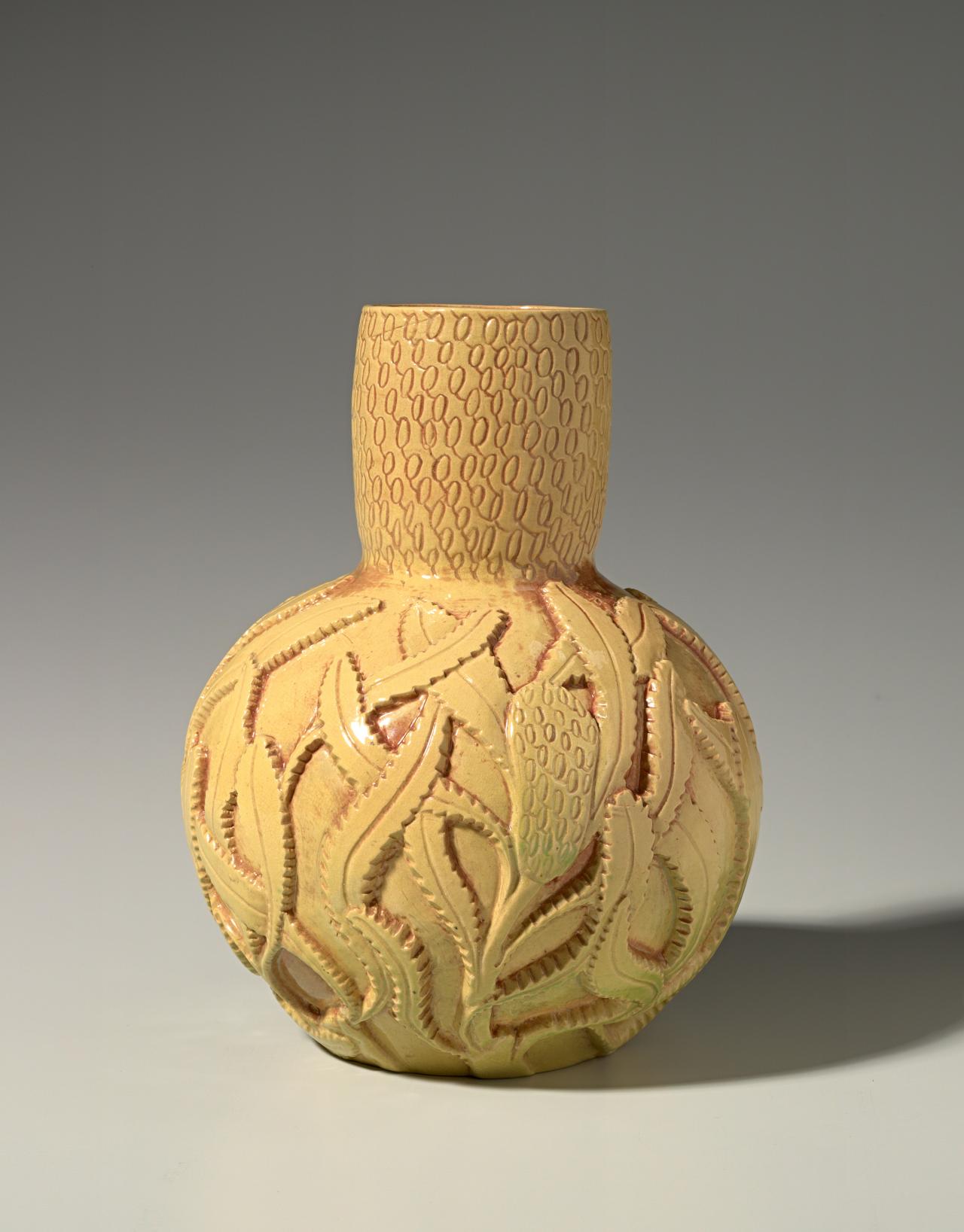 The members of that group – and this is not to suggest that individuals were bound together by adherence to any sort of manifesto or even by way of a formalized association – had trained at the Working Men’s College (now the Roval Melbourne Institute of Technology). Included in the group were Allan Lowe (b. 1907), John Knight (b. 1910) and Klytie Pate (b. 1912). The work produced by these artists in the 1930s and 1940s reveals the then current predilection for decorating surfaces by means of carving or incising; the application of modelled ornament as handles or finials and the bold and extensive experimentation with a variety of exotic and high-keyed glazes.