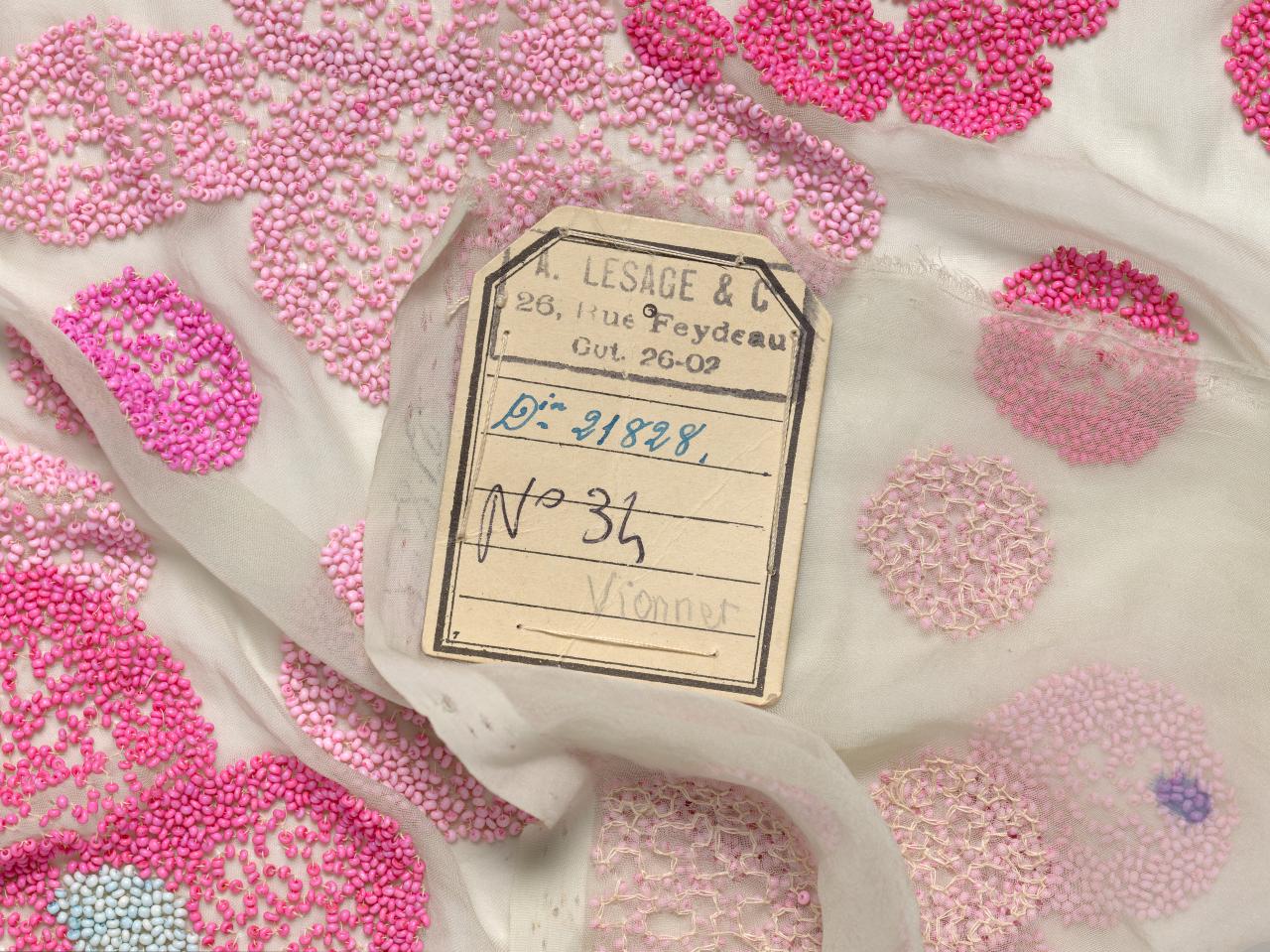Founded in 1858, the prestigious embroidery house of Michonet was purchased by Albert Lesage in 1924. It was renamed Maison Lesage and began producing elaborate embroideries for haute-couture fashion houses, including Madeleine Vionnet, whose innovations in design and construction introduced a language of modernity to fashion in the early twentieth century.