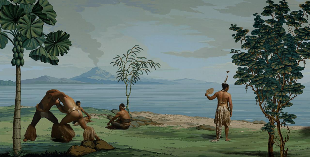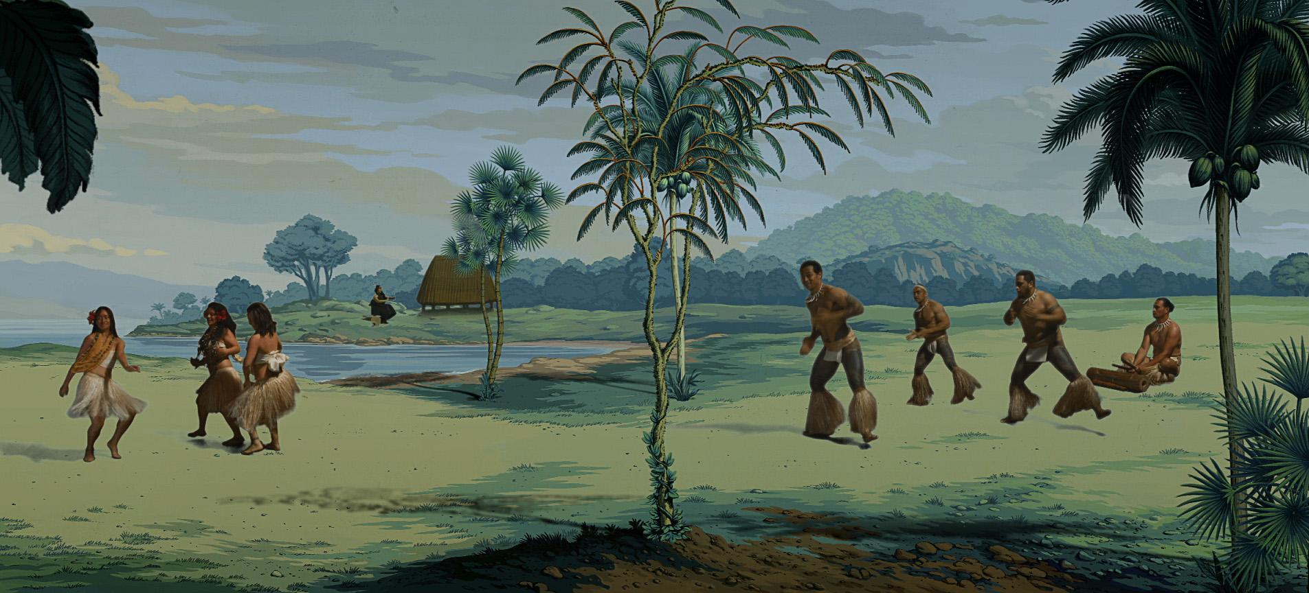 Lisa Reihana’s in Pursuit of Venus is a two-channel, live-action video that is inspired by the colonial nineteenth century panoramic wallpaper, Les Sauvages de la Mer Pacifique (1804–05), produced by entrepreneur Joseph Dufour in Neoclassical France. Les Sauvages draws upon journal accounts of Pacific voyages of exploration but Dufour and his team harvested information from different historical sources and relocated the bodies into a fictional Tahitian landscape, removing these Pacific Islanders from their cultural, historical and political reality and dressing them in Neoclassical attire.