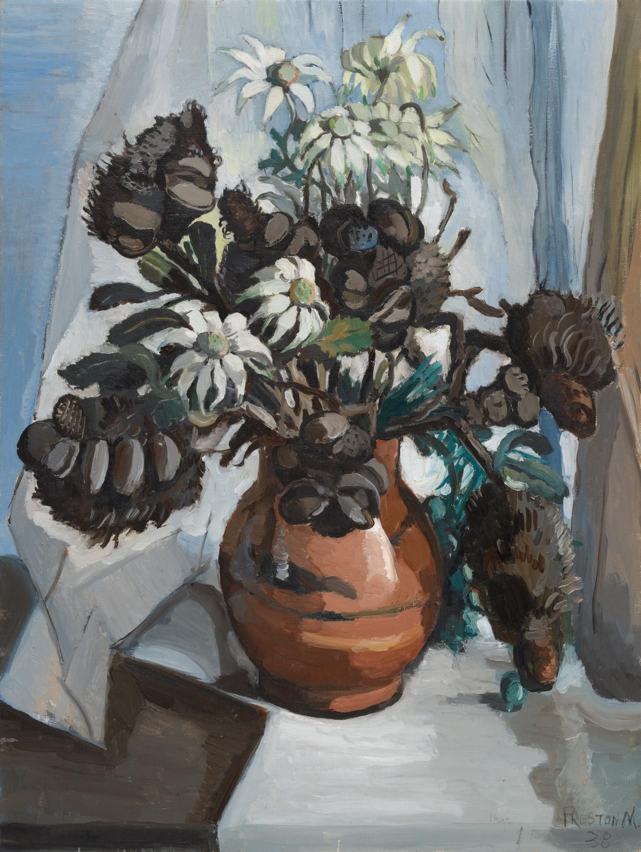 The art of Margaret Preston has shaped the cultural and aesthetic landscape of Australia. Born in Adelaide in 1875, Preston (nee McPherson) studied in Adelaide, Sydney and Melbourne, before travelling extensively across England and Europe. Participating in the growing discourses surrounding modernism, Preston began to merge a variety of influences, such as Post-Impressionism, primitivism in European art, the Arts and Craft movement, and Japanese ukiyo-e.