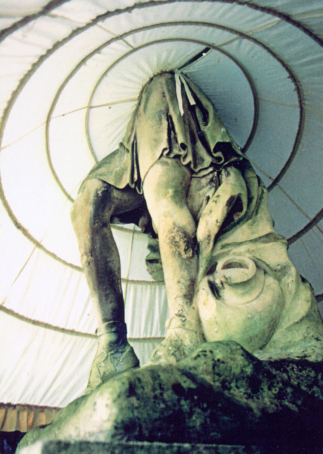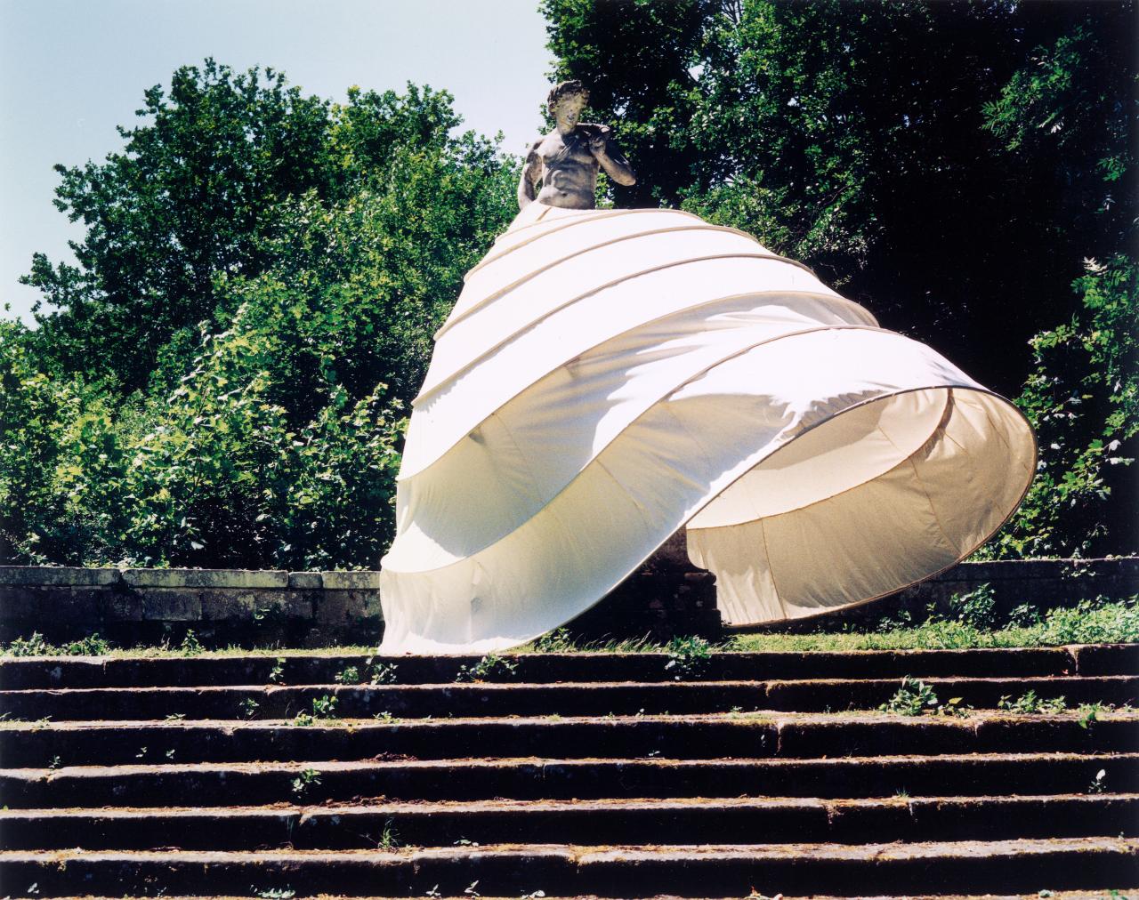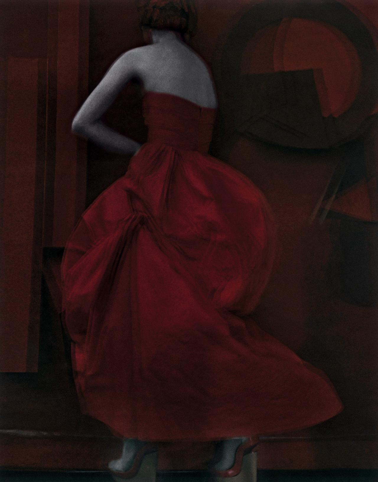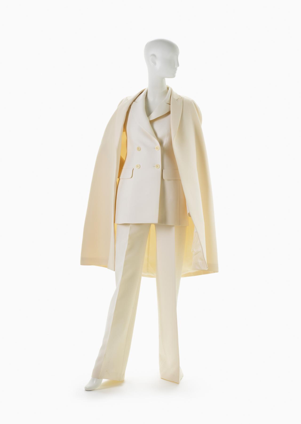 Collaborations with photographers have also been a strong thread throughout Grant’s career. It all began in the early 1980s when the then-emerging photographer Polly Borland began regularly documenting Grant’s work, initiating another key and enduring creative relationship. Borland began by focussing on portraiture and editorial work, and quicky established herself as a go-to photographer for Australian Vogue, Vogue Living, Pol, and Tension Magazine, during which time she frequently shot the work of Grant. Later, when based in England, Borland shot images for influential magazines Face, Arena and BLITZ, as well as portraits with a specialty in Australian expatriates such as Nic Cave and Cate Blanchett. One image included in the exhibition features Blanchett wearing Grant’s striking red wool Joan of Arc dress, 1999. Borland has continued to work closely with the designer and developed a distinct language for documenting his work.