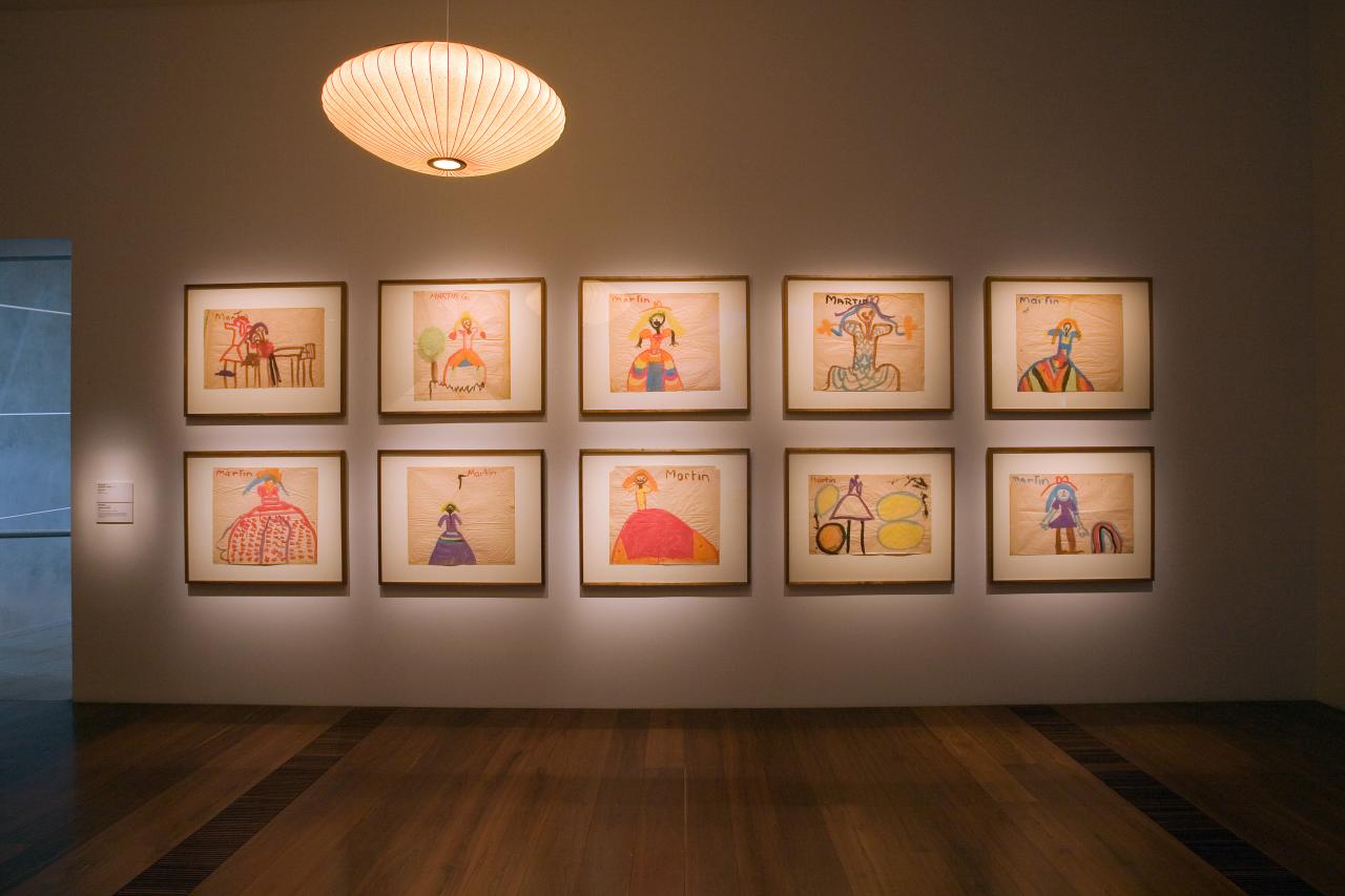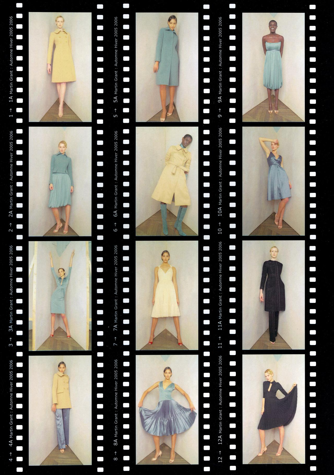One of Borland’s earliest portraits of the young designer (also on display in the NGV exhibition) shows him standing in front of Jenny Watson’s painting This Year’s Fashion, 1984. Watson and Grant had studios opposite each other in Stalbridge Chambers in the early 1980s and used to swap clothes for paintings. The work remains a talisman of sorts for the designer who gives it pride of place in his studio to this day. They collaborated years later in 2007, when artist Jenny Watson created a series of twenty-four drawings depicting a girl wearing one of Grant’s designs and pursuing her runaway dog. The drawings were transformed into a short, animated film titled Walking the dog that was screened during the presentation of his 2007 spring–summer collection at Paris Fashion Week.
